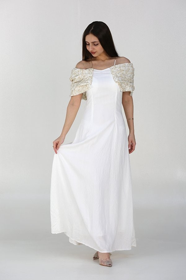 التفاصيل : تتضمن الجلابية بأكمام أوف شولدر تفاصيل إضافية مثل التطريزات الدقيقة، الكشكش، الزخارف، أو الأحزمة المزخرفة. هذه التفاصيل تضفي لمسة من الفخامة والتفرد على التصميم.