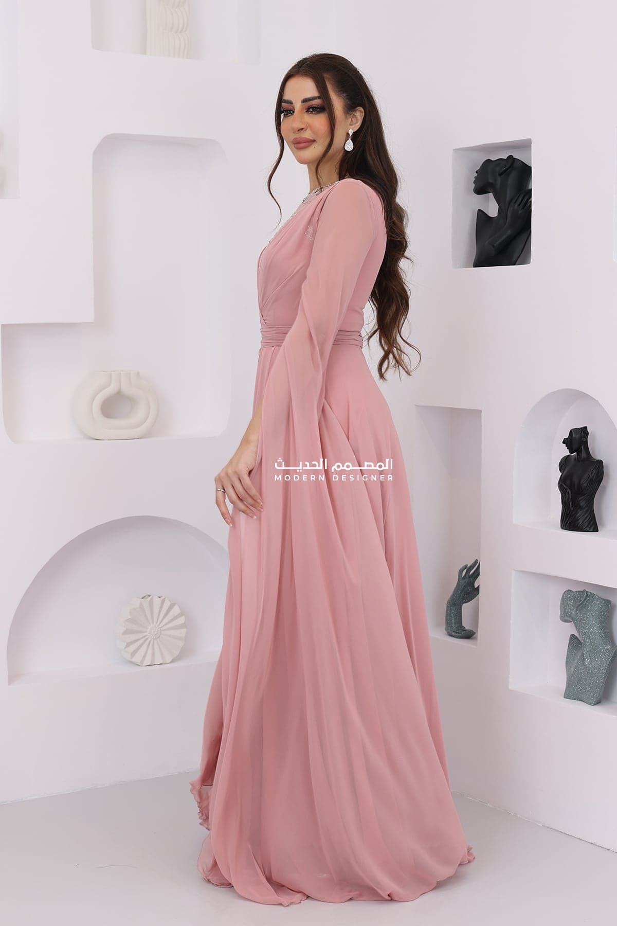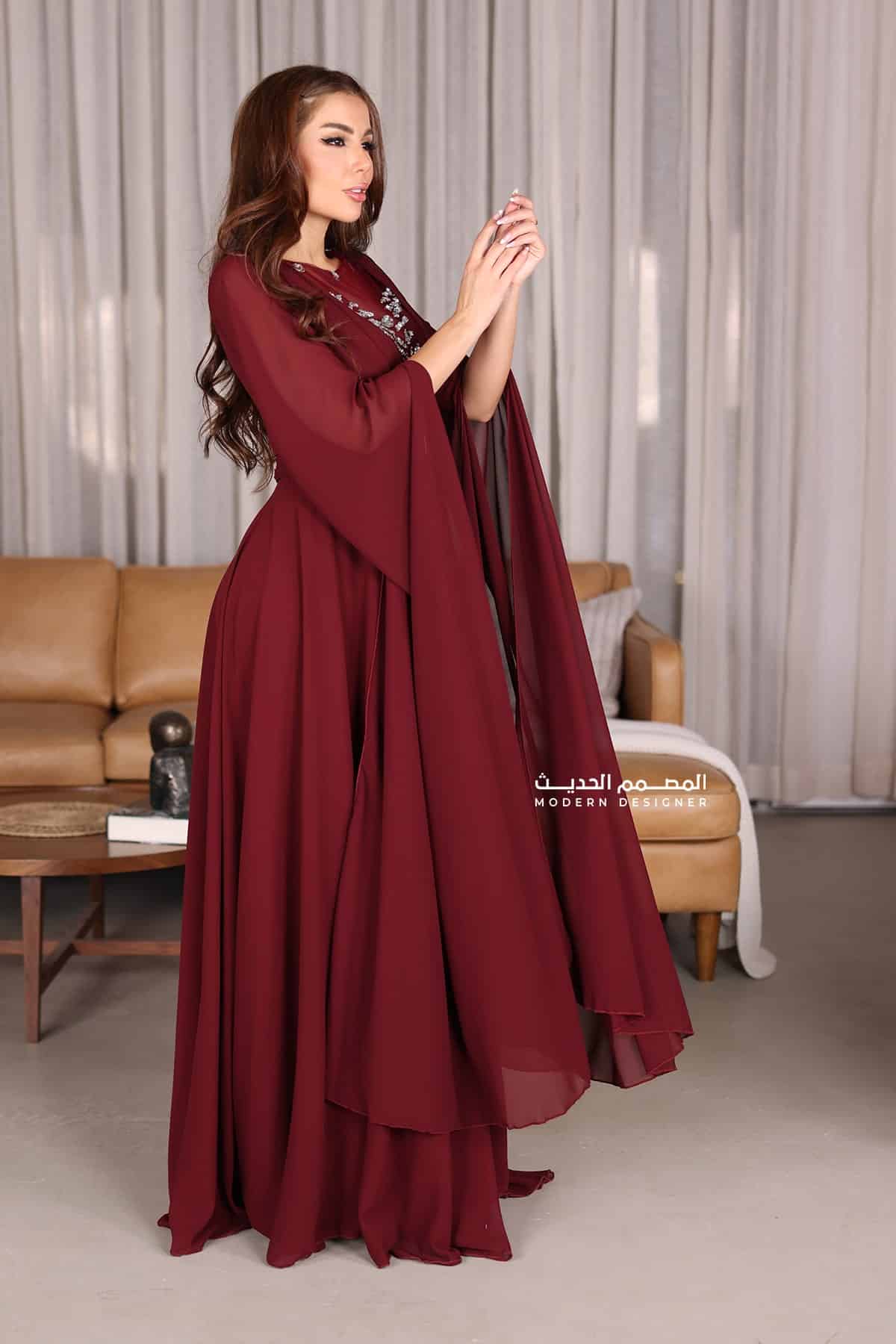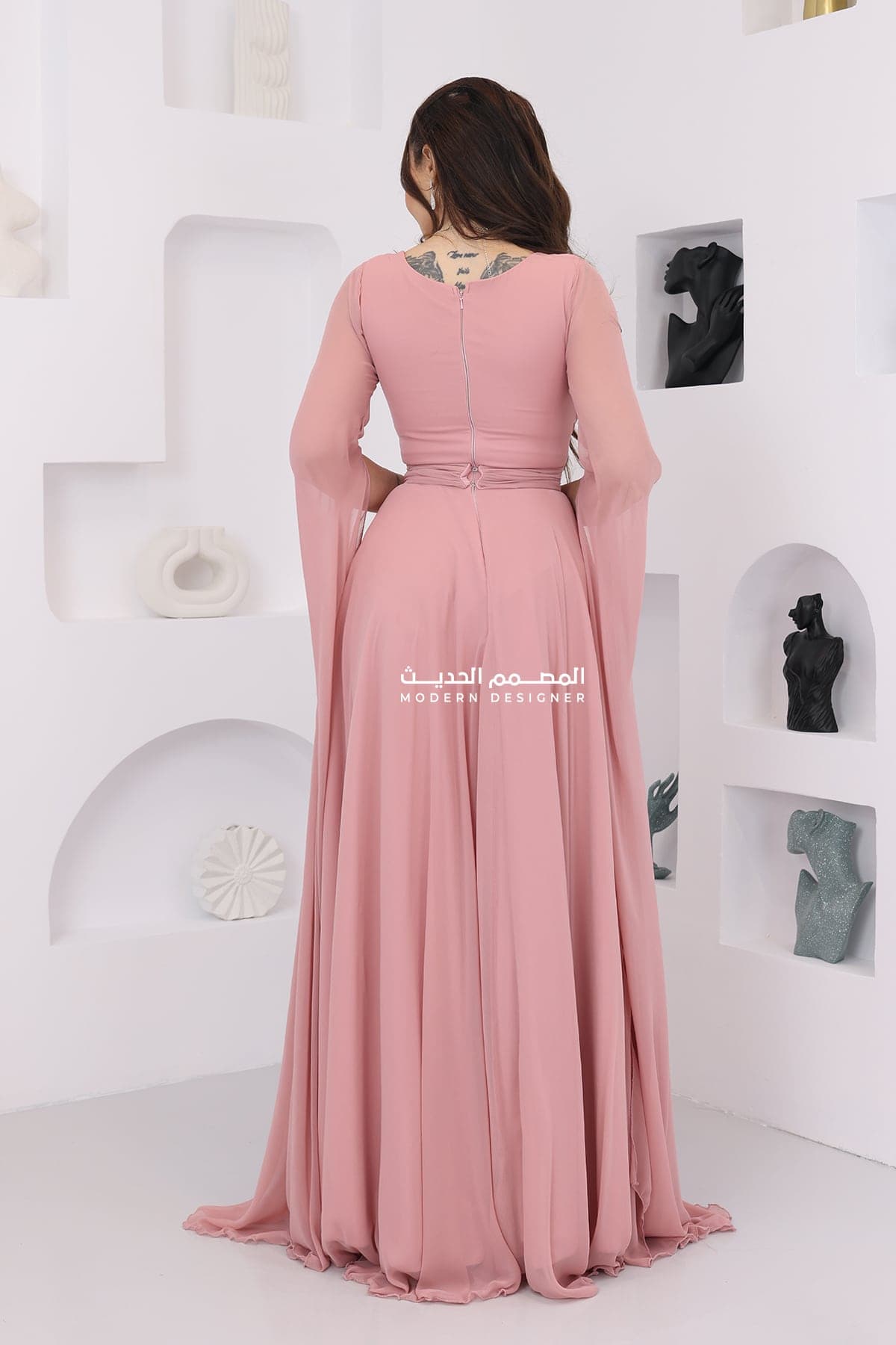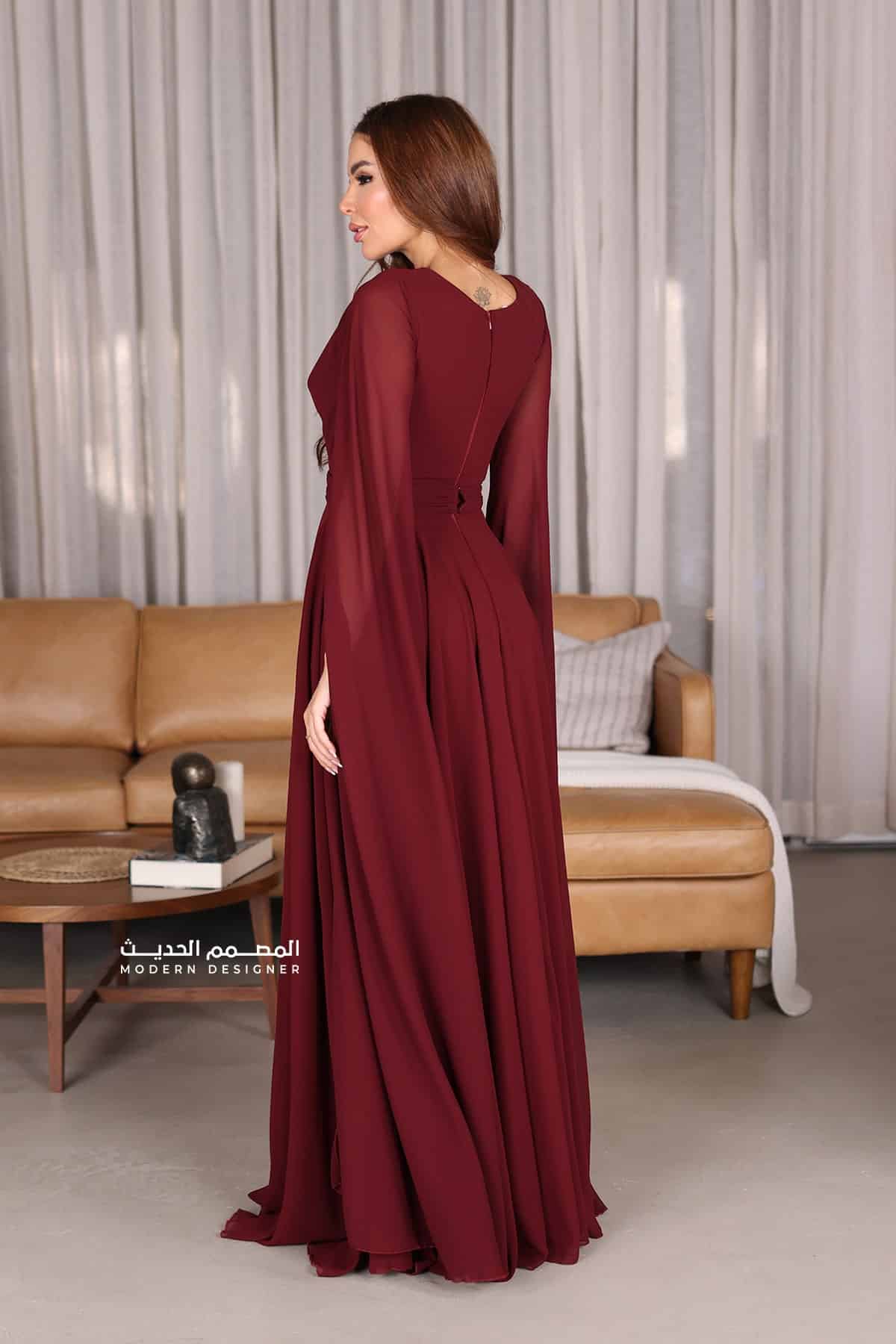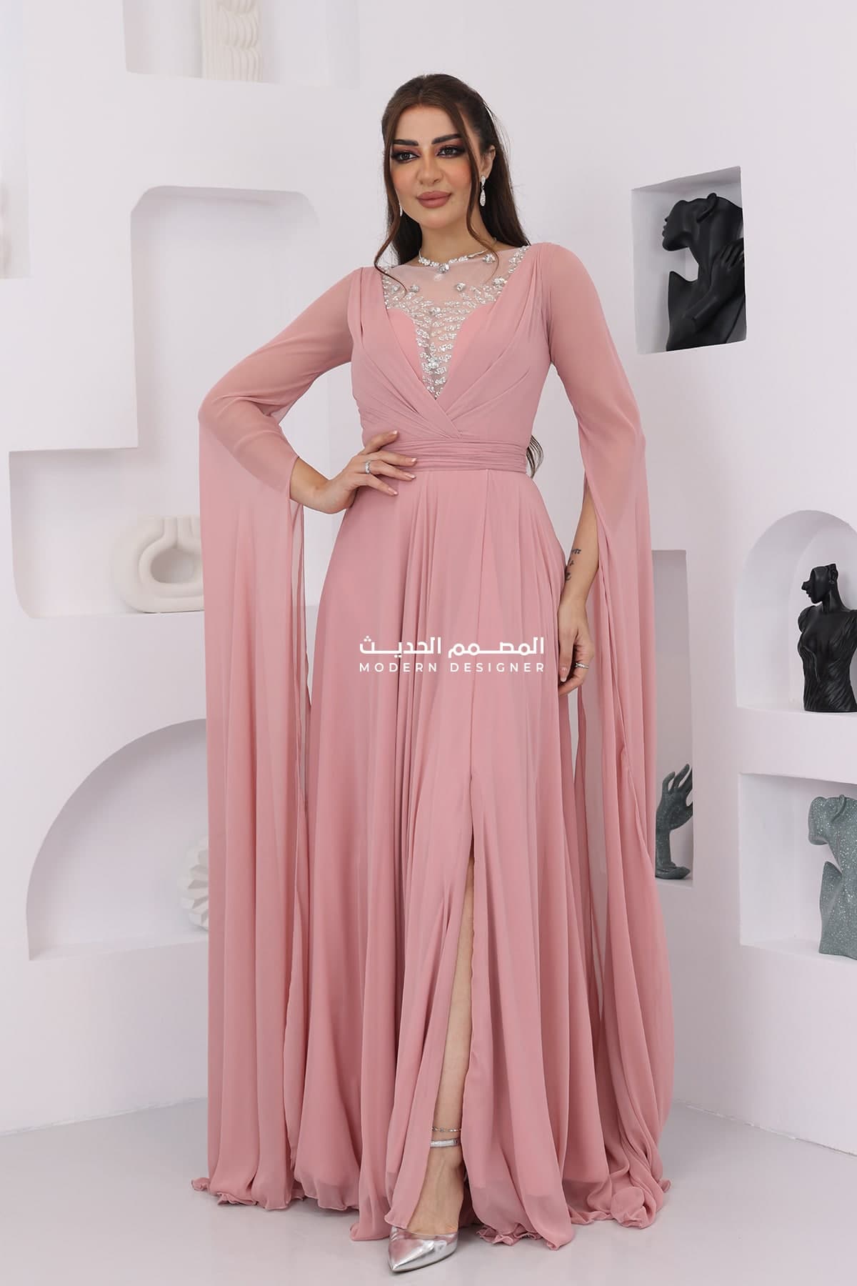 • التصميم : يتميز الفستان بتصميم منديل فريد وأنيق. يعطي شكل الأكمام شكل منديل يتدلى من الكتفين بشكل جميل وأنيق، مما يضفي لمسة فريدة على التصميم ويجعل الفستان يبرز بين الآخرين.