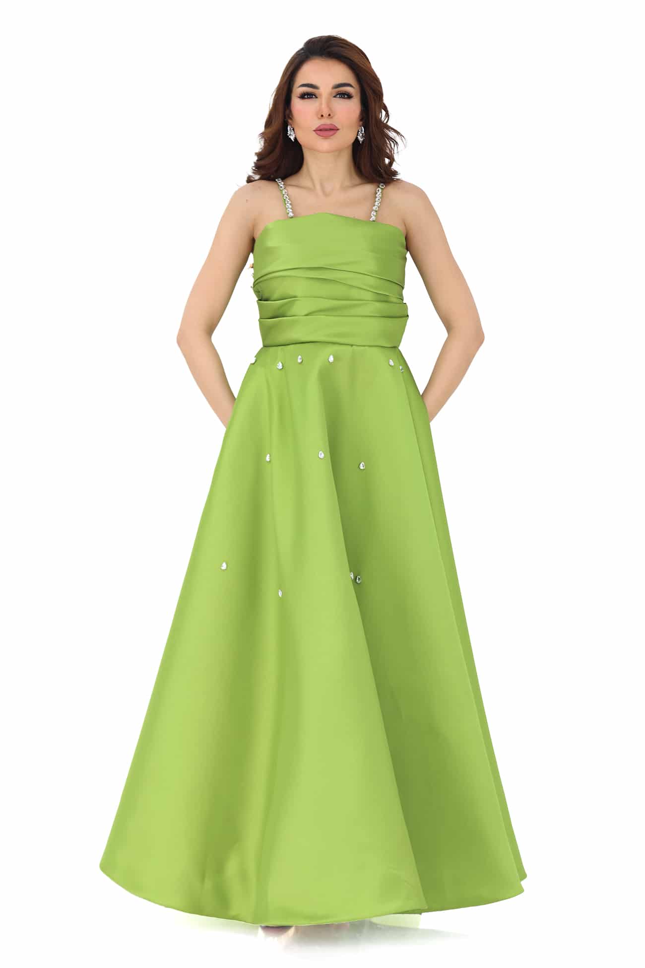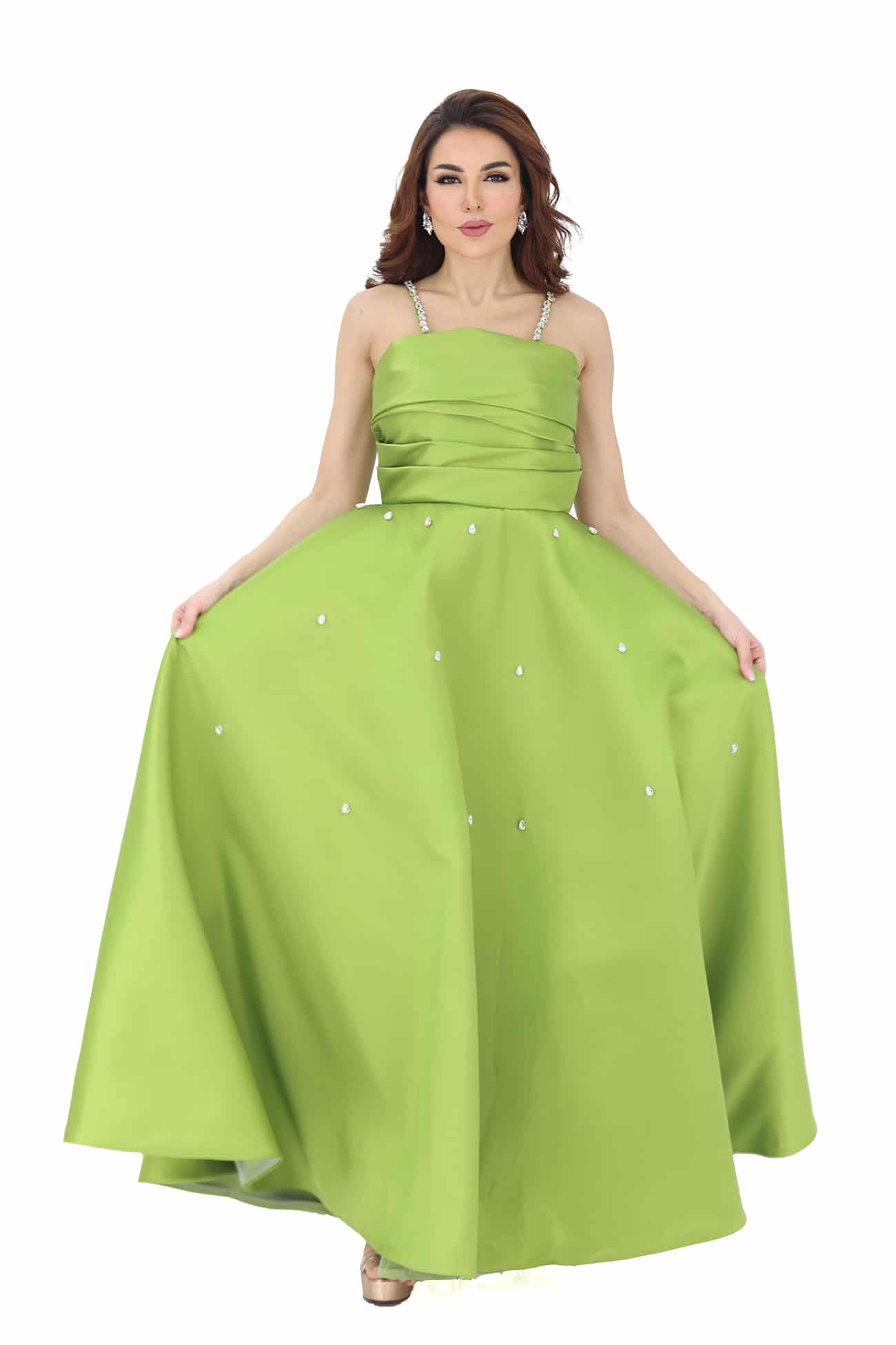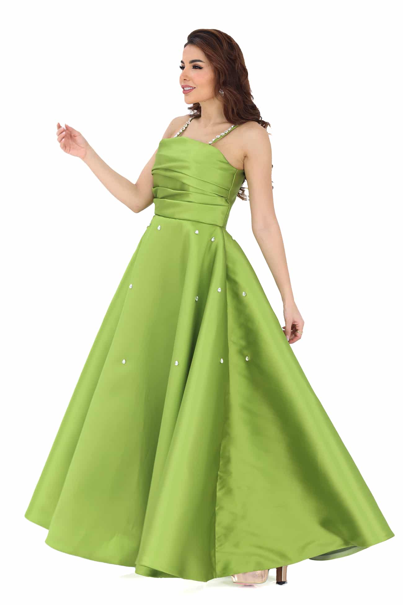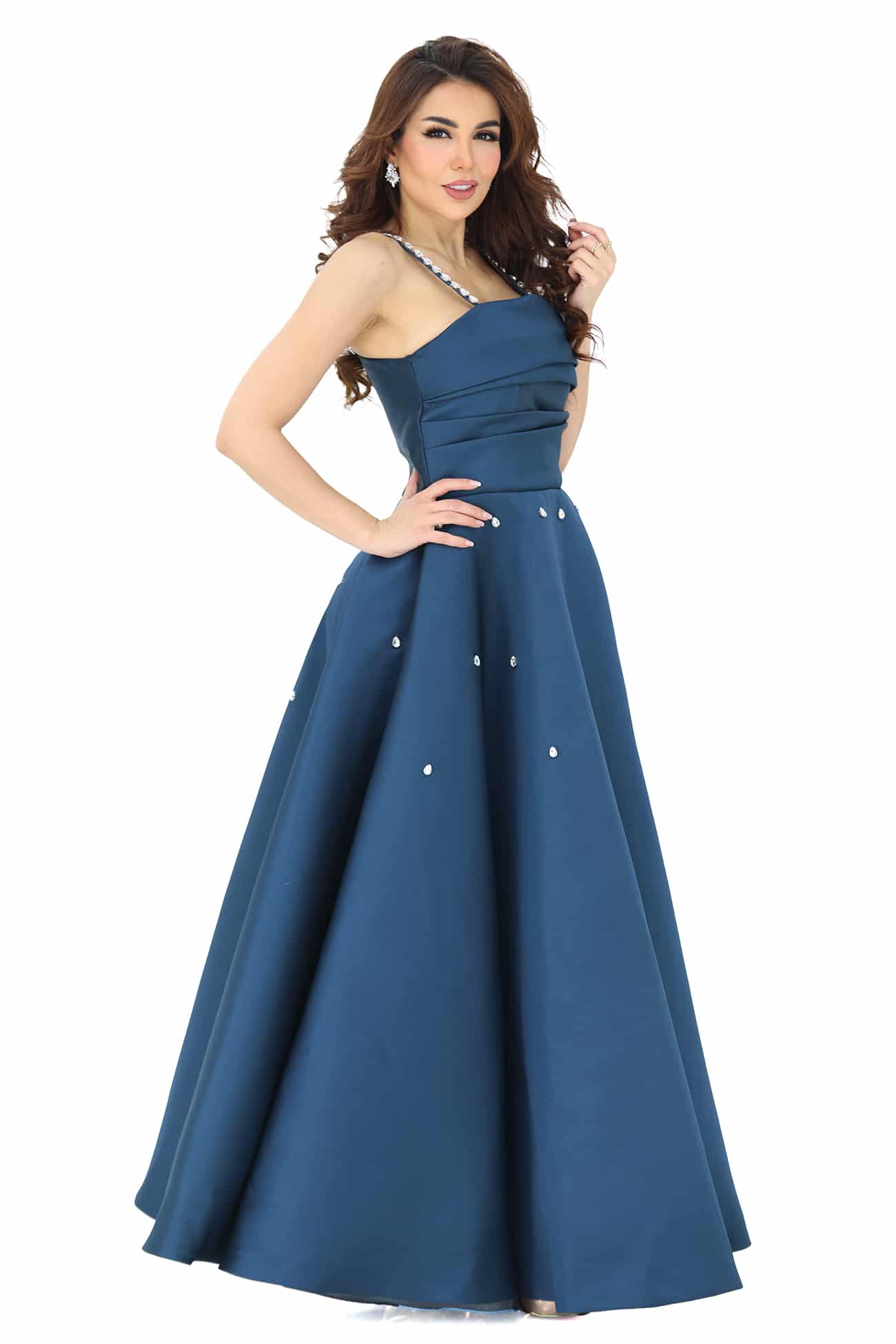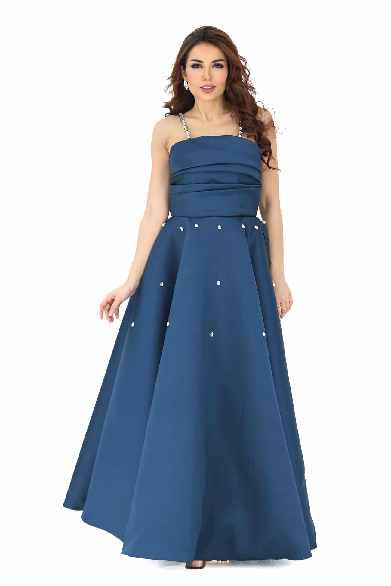 • التفصيل: يتم تزيين الفستان بتفاصيل كريستال أنيقة ومتلألئة. تكون الكريستالات منسقة على الصدر أو على طول الفستان بشكل متقن، مما يعزز بريق الفستان ويجعله يلتقط الأنظار بشكل لا يقاوم.