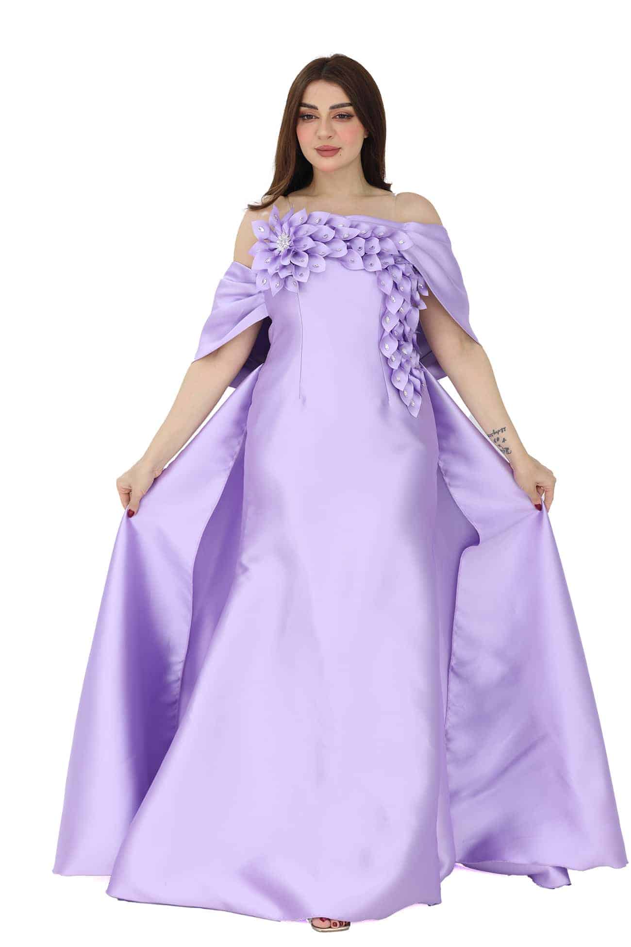 • اللون: يتميز الفستان بلون الموف الجذاب والمشرق، الذي يضفي لمسة من الرقي والفخامة على الإطلالة. يعتبر لونًا ملفتًا للأنظار ويتناسب مع مختلف ألوان البشرة.