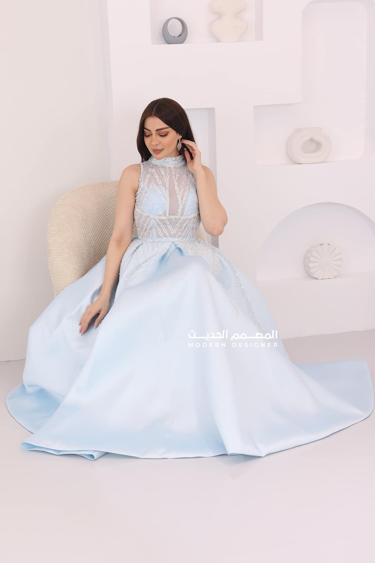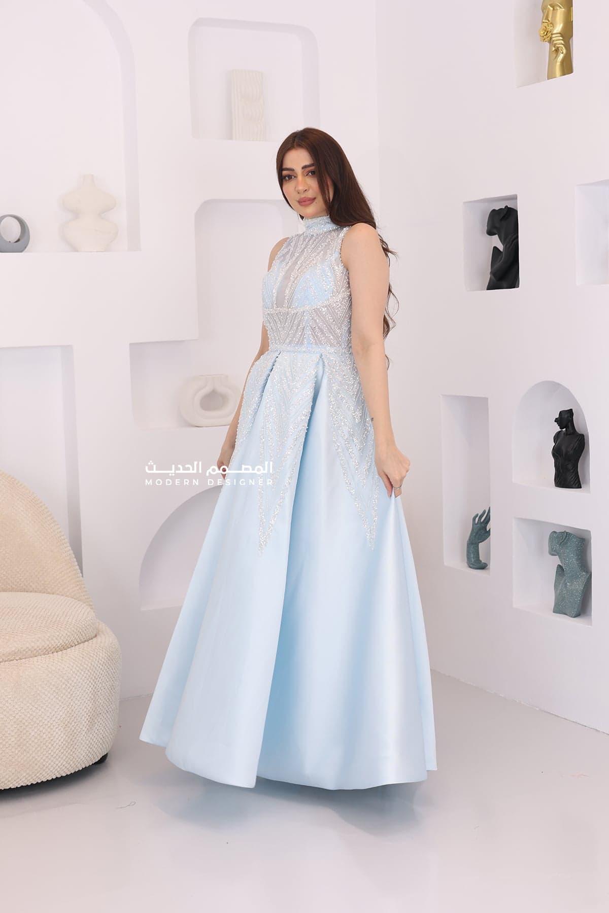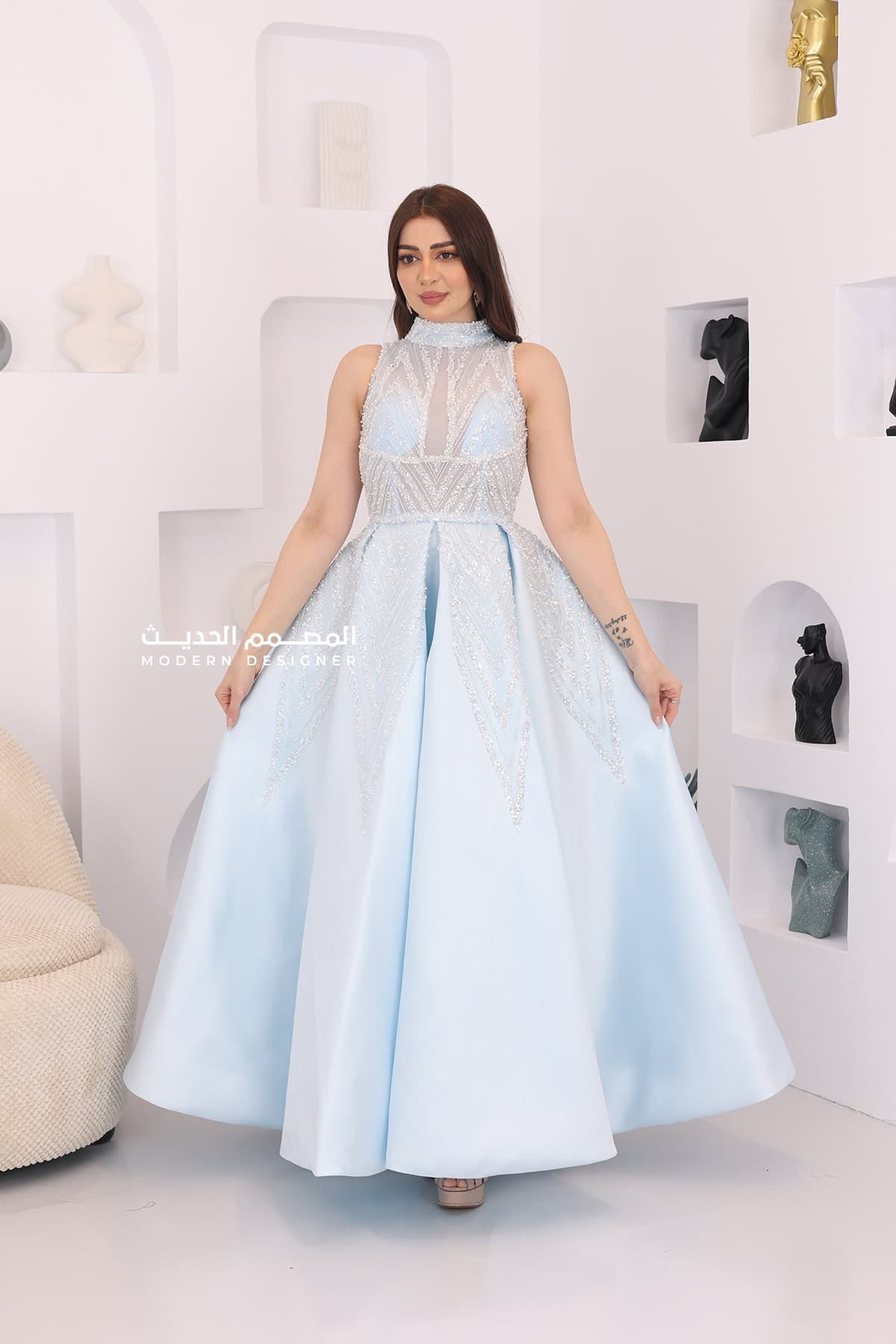 التخزين السليم: قومي بتخزين الفستان في مكان جاف ومنعزل عن الرطوبة للحفاظ على جمال الكريستالات والإكسسوارات.