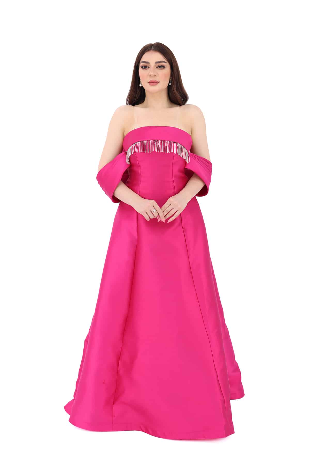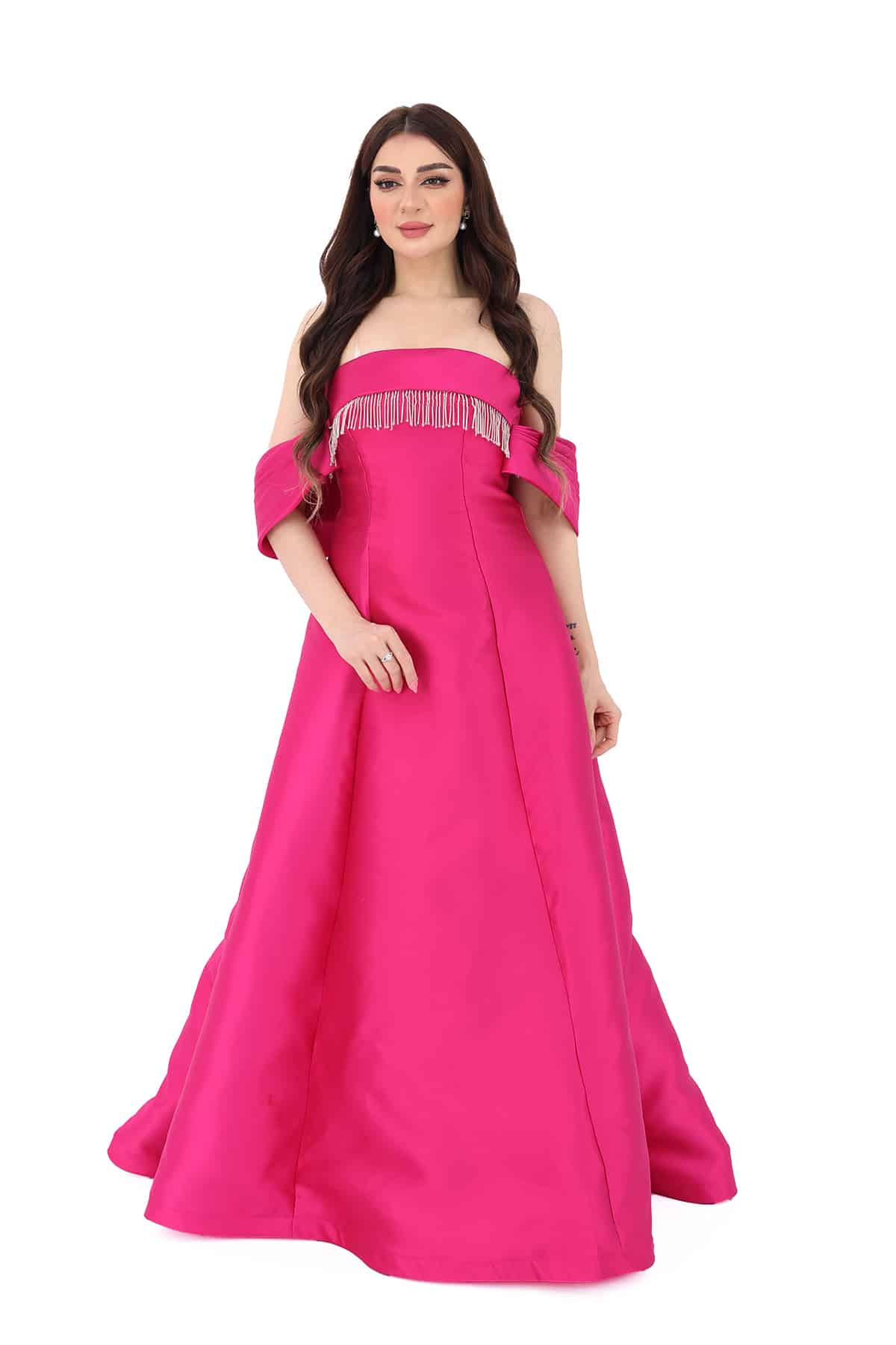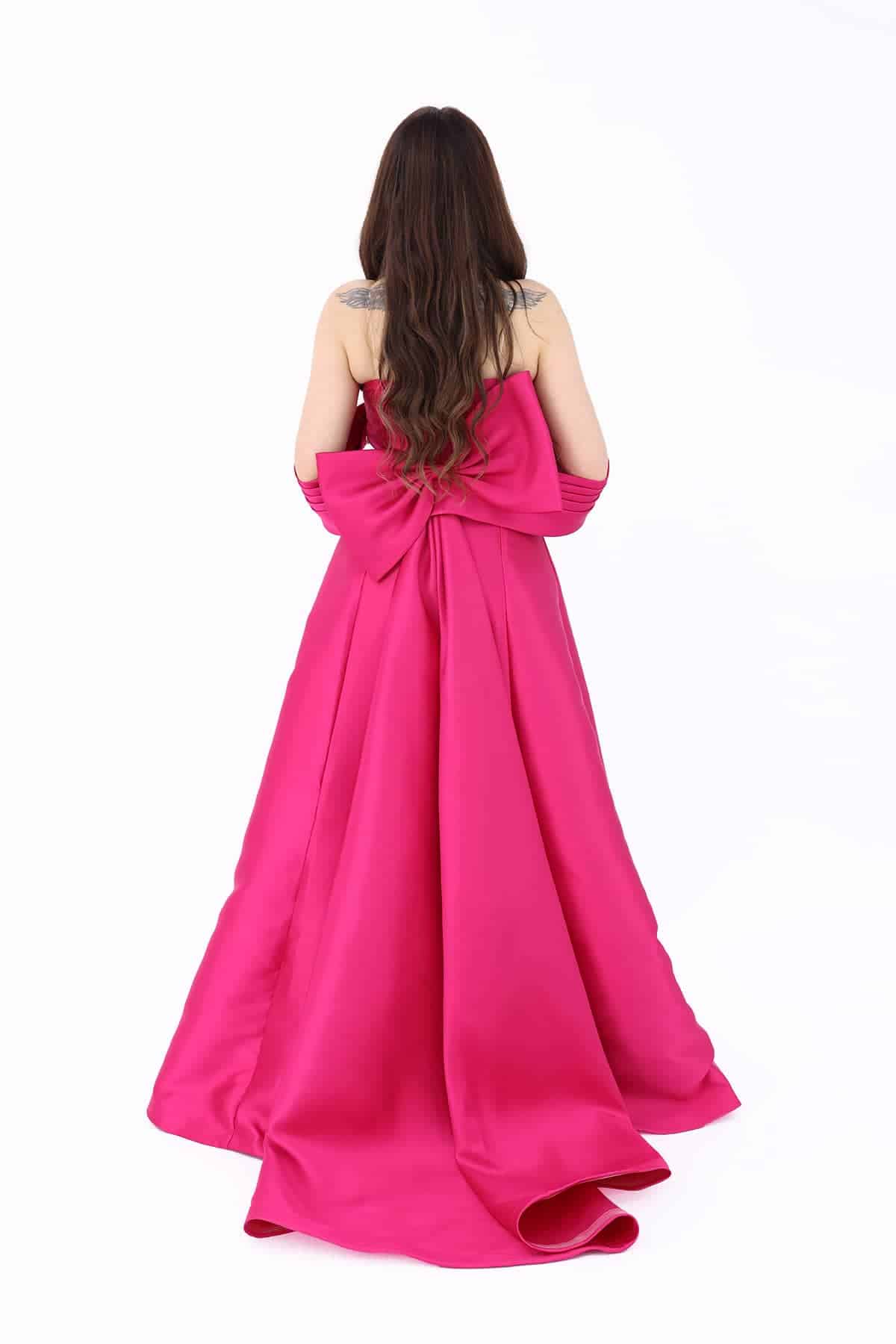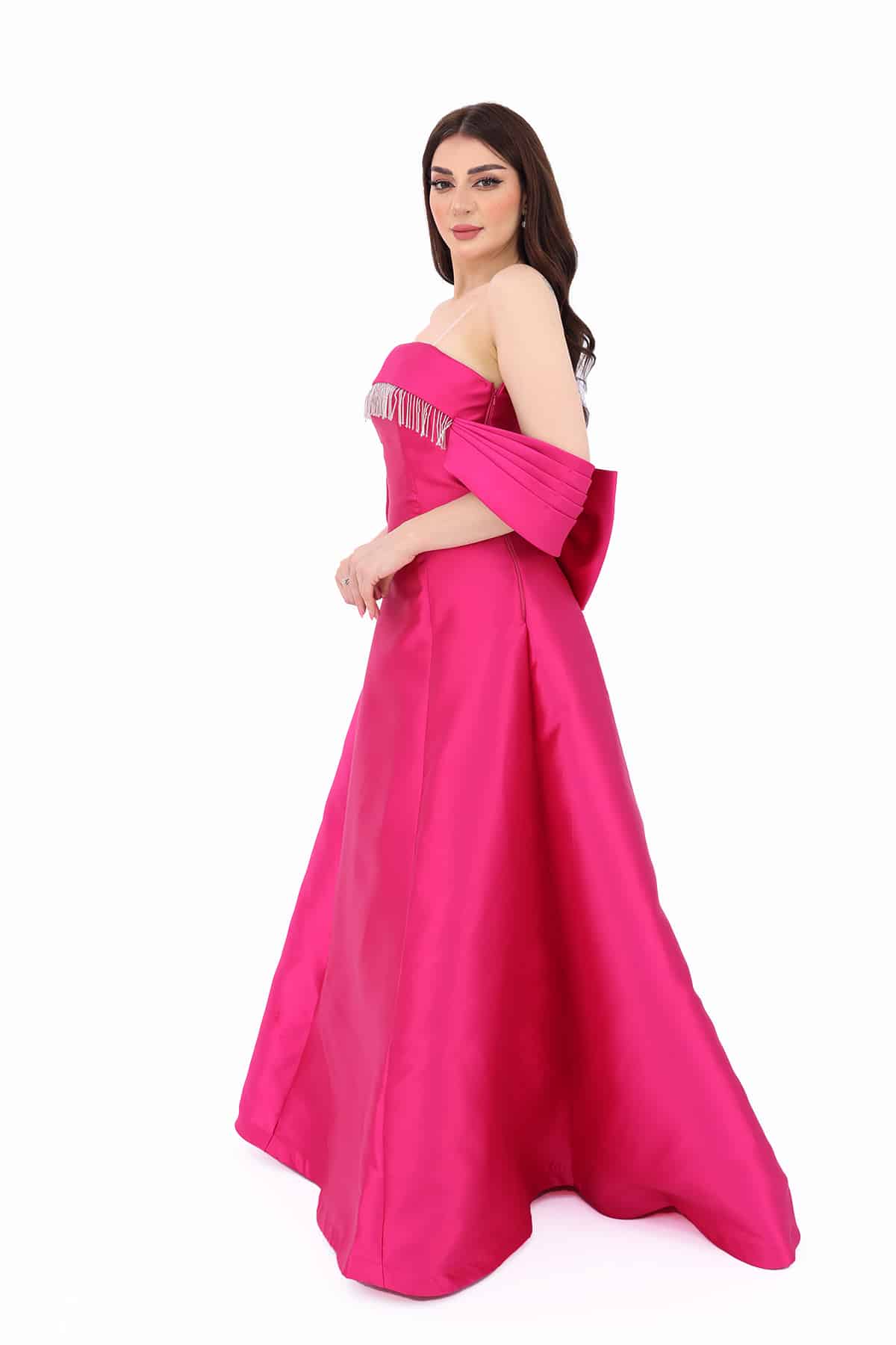 3- اللون الفوشي الراقي: يأتي الفستان بلون فوشي راقي وجذاب، يجعله يلائم الأذواق الحديثة ويتناسب مع معظم ألوان البشرة.