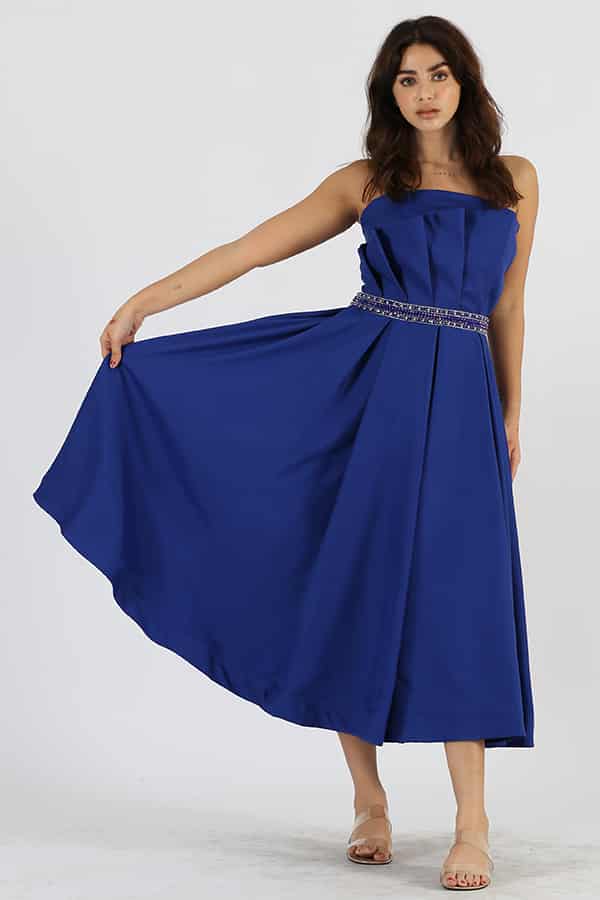 اللون النيلي الفاخر يضفي على الفستان جاذبية استثنائية، فهو يعكس الأنوثة والقوة في وقت واحد. يتمتع الفستان بتصميم ميدي أنيق يتناسب مع العديد من المناسبات، حيث يمكنكِ ارتداءه في حفلات السهرة أو المناسبات الخاصة التي تتطلب إطلالة راقية وفاخرة.