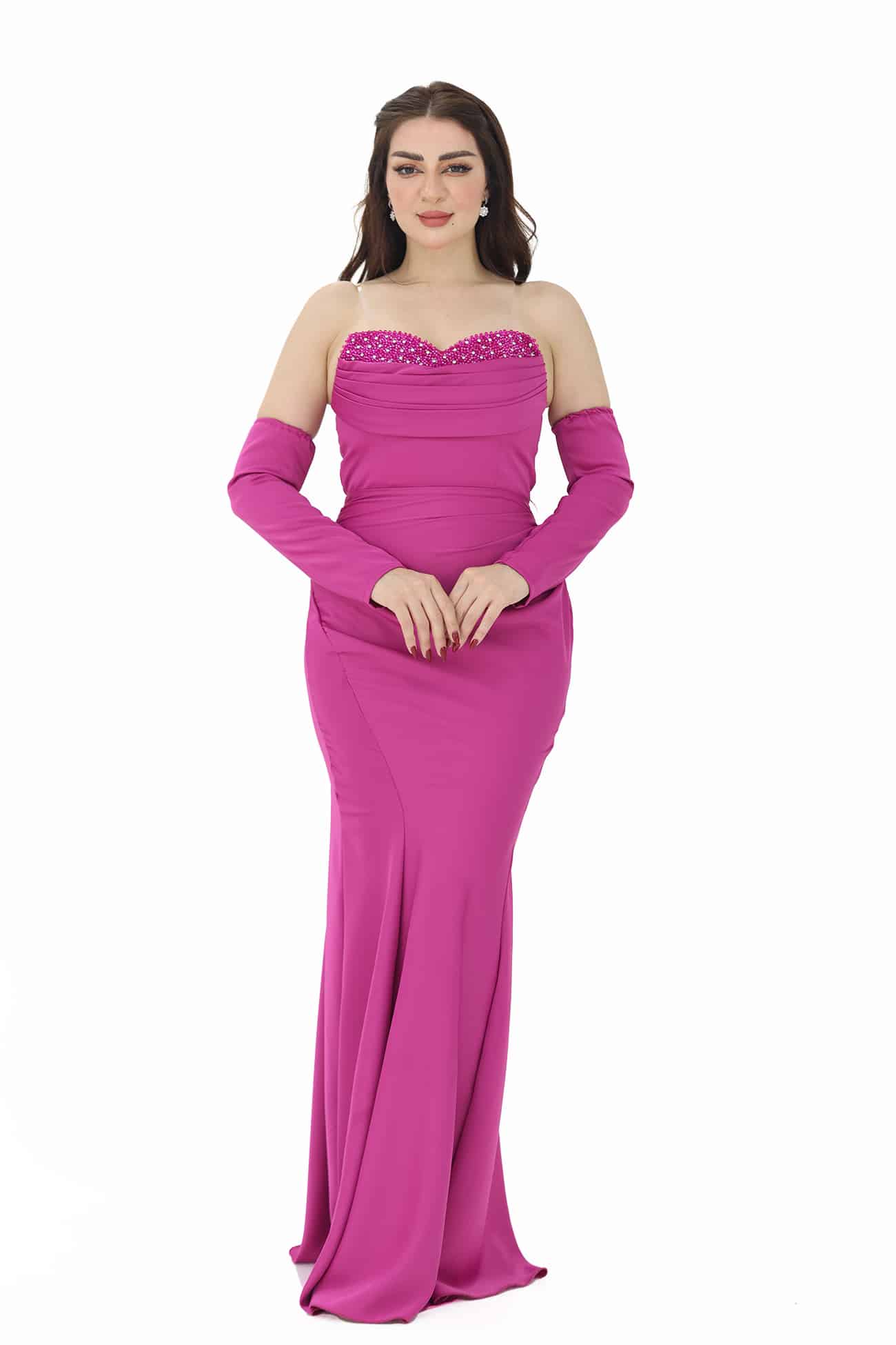 فستان ناعم بتطريز يدوي فاخر بالصدر بتصميم توب راقي بأكمام منفصلة بقصة ذيل سمكة يتوفر الفستان باللونين الفوشي والنيلي يتميز بالفخامة، الأناقة، والتفرد. إنه خيار رائع للمناسبات الخاصة والأحداث الرسمية، حيث ستتألقين بإطلالة ساحرة ومبهجة.