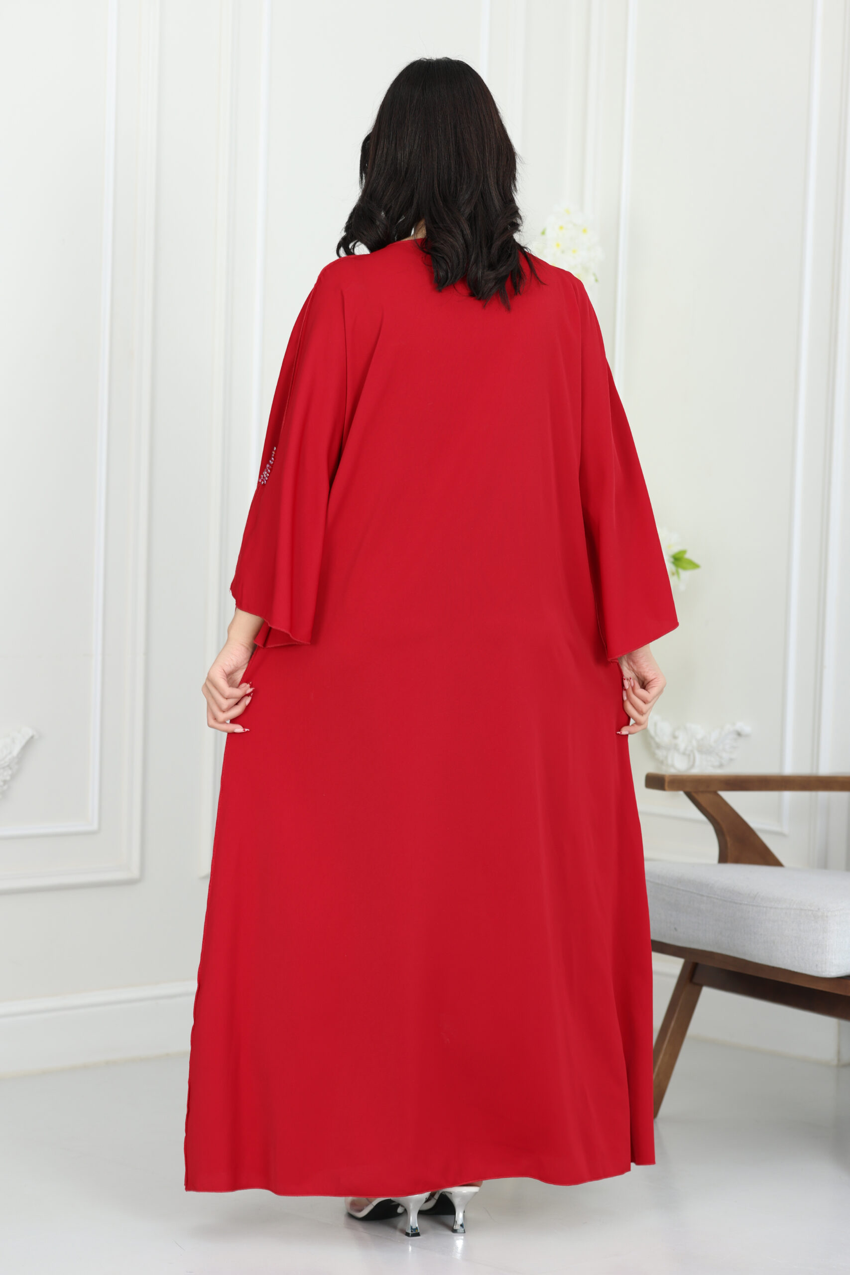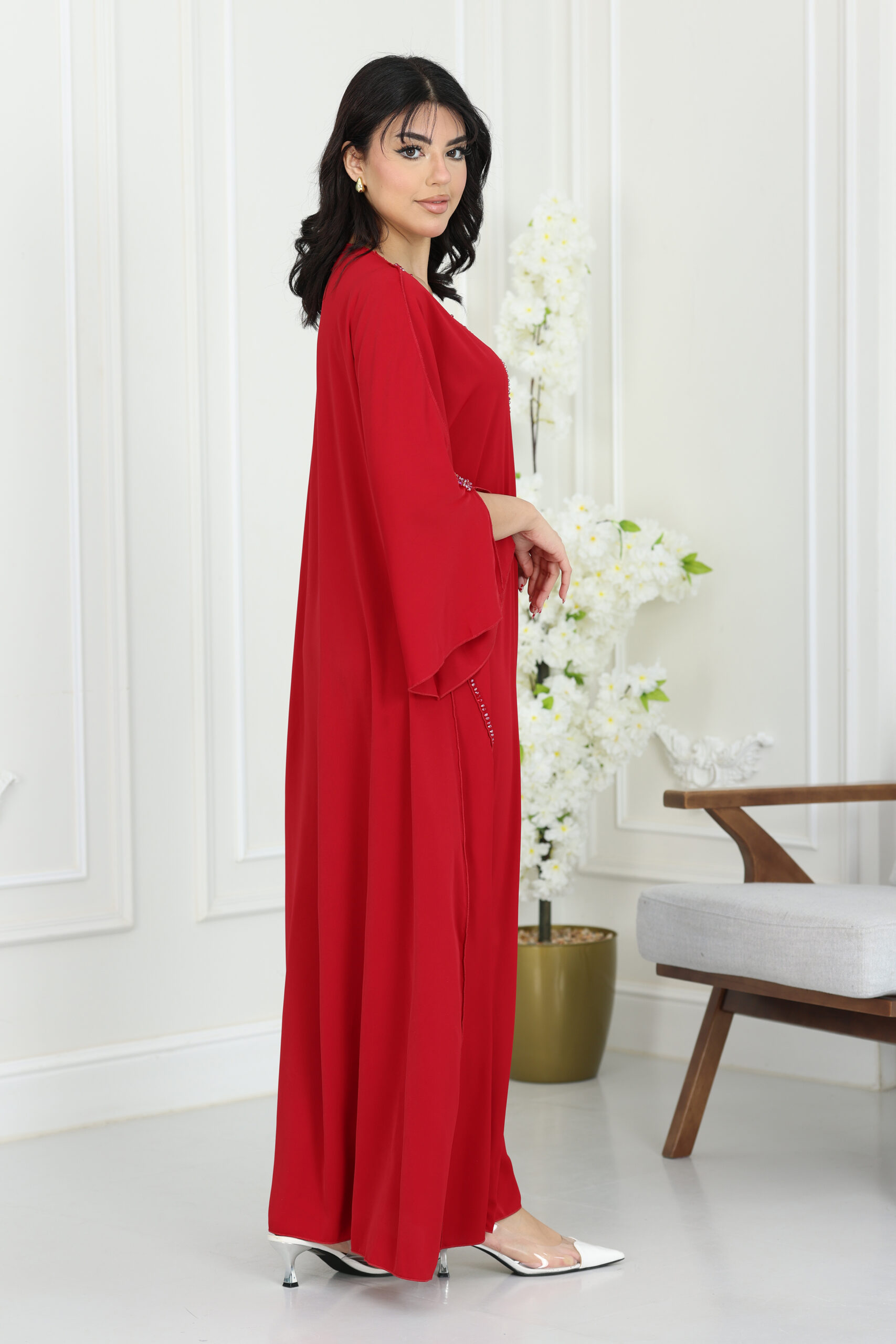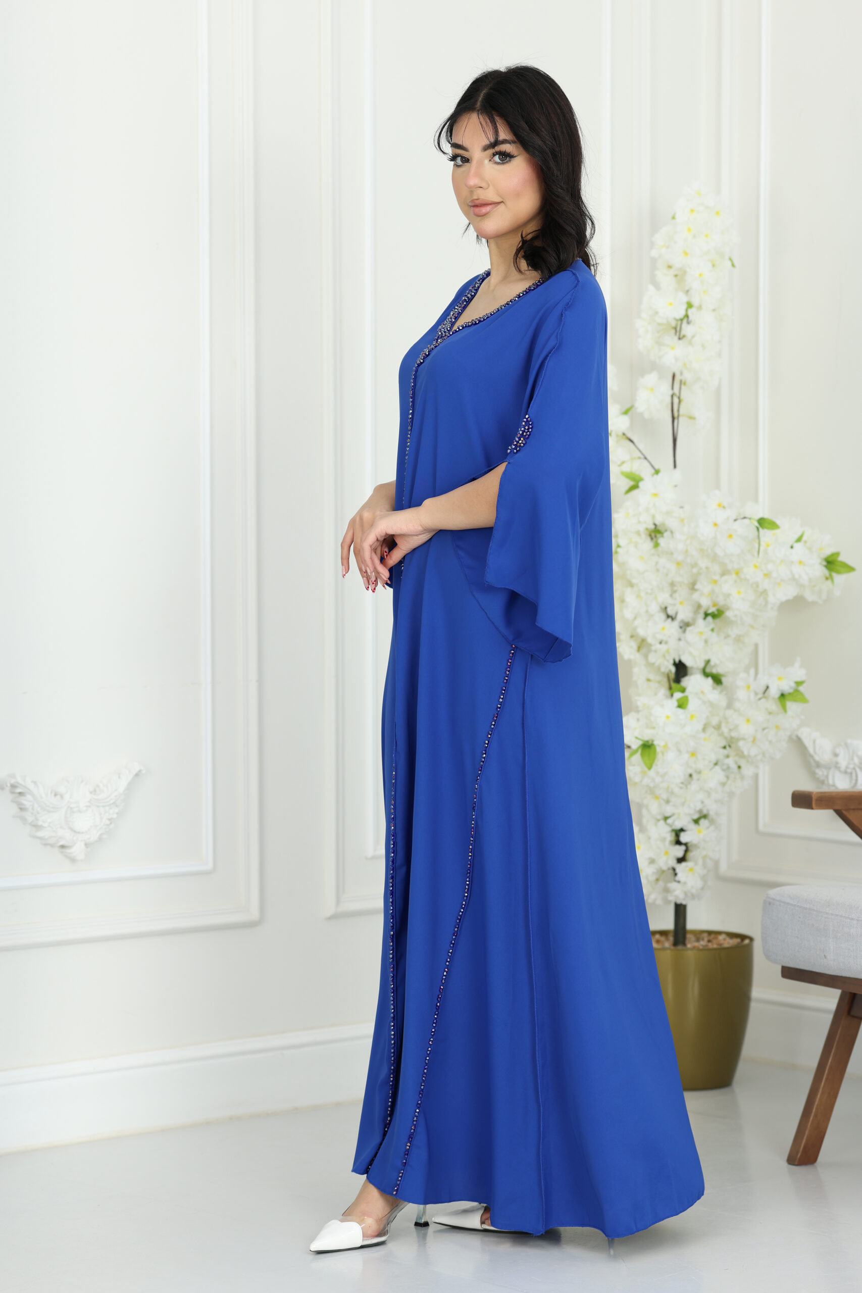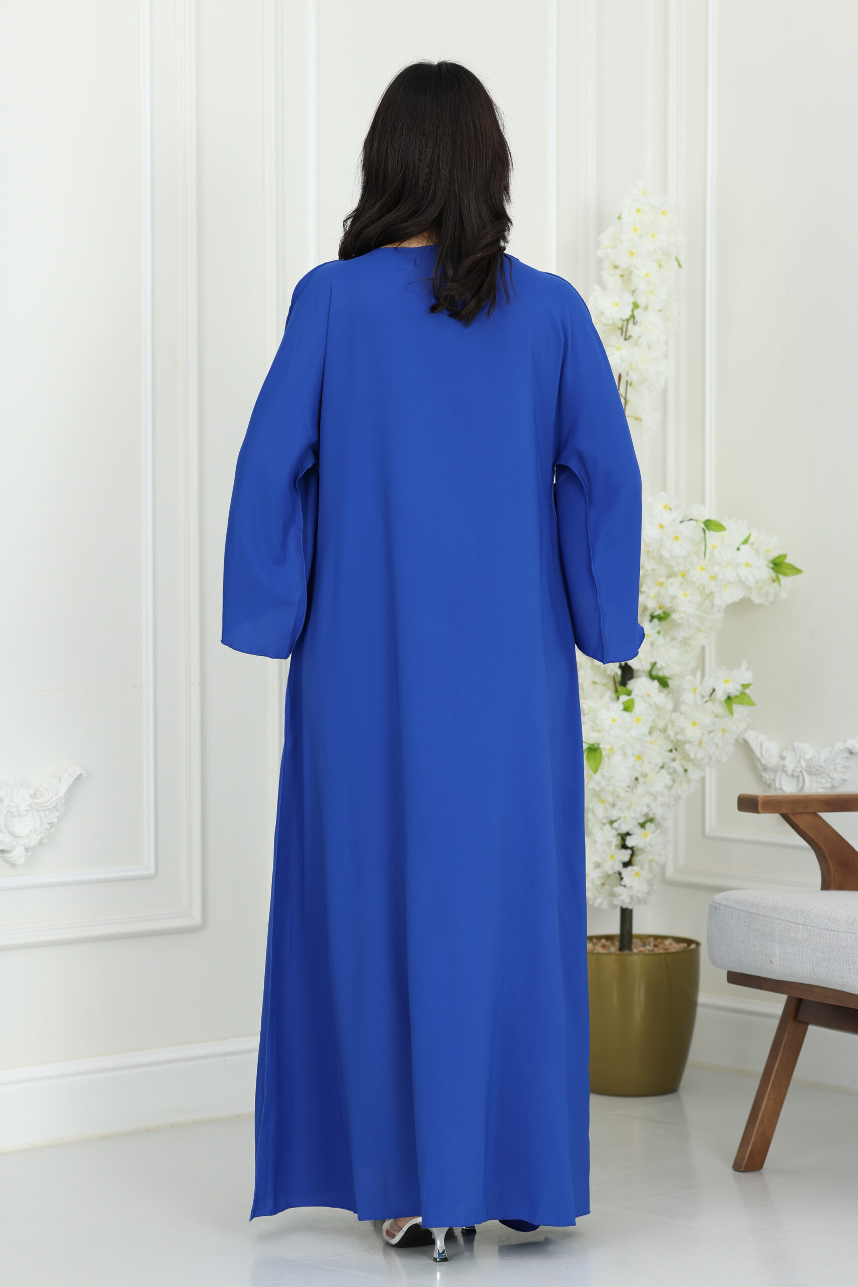 تتميز هذه الجلابية بقصة واسعة ومريحة تنسدل بنعومة على الجسم، حيث يزدان الصدر والواجهة الأمامية بتطريزات ذهبية فاخرة ومنقوشة بأسلوب “الشك” اليدوي والترتر اللامع الذي يمنحكِ حضوراً ملكياً. تأتي الجلابية بفتحة صدر “V” أنيقة وتصميم أكمام واسعة مزينة بنفس التطريزات الذهبية الفخمة على الأطراف، مما يضفي لمسة جمالية متكاملة. القصة الطويلة والواسعة تضمن لكِ الستر والوقار، مما يجعلها الخيار الأول للغبقات الرمضانية الفاخرة والمناسبات التي تتطلب مظهراً مهيباً يليق بكِ.
