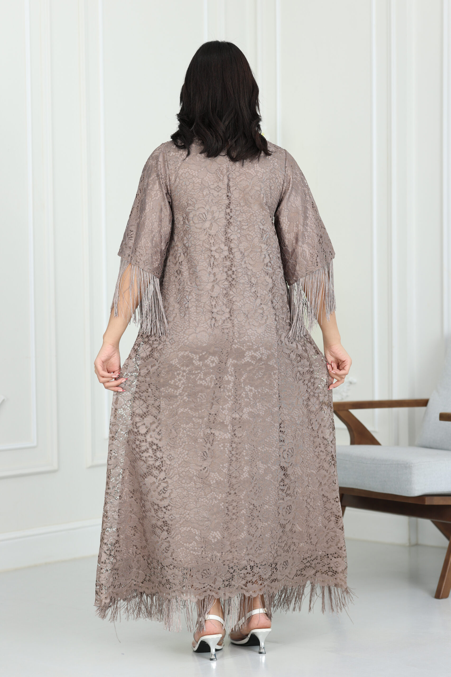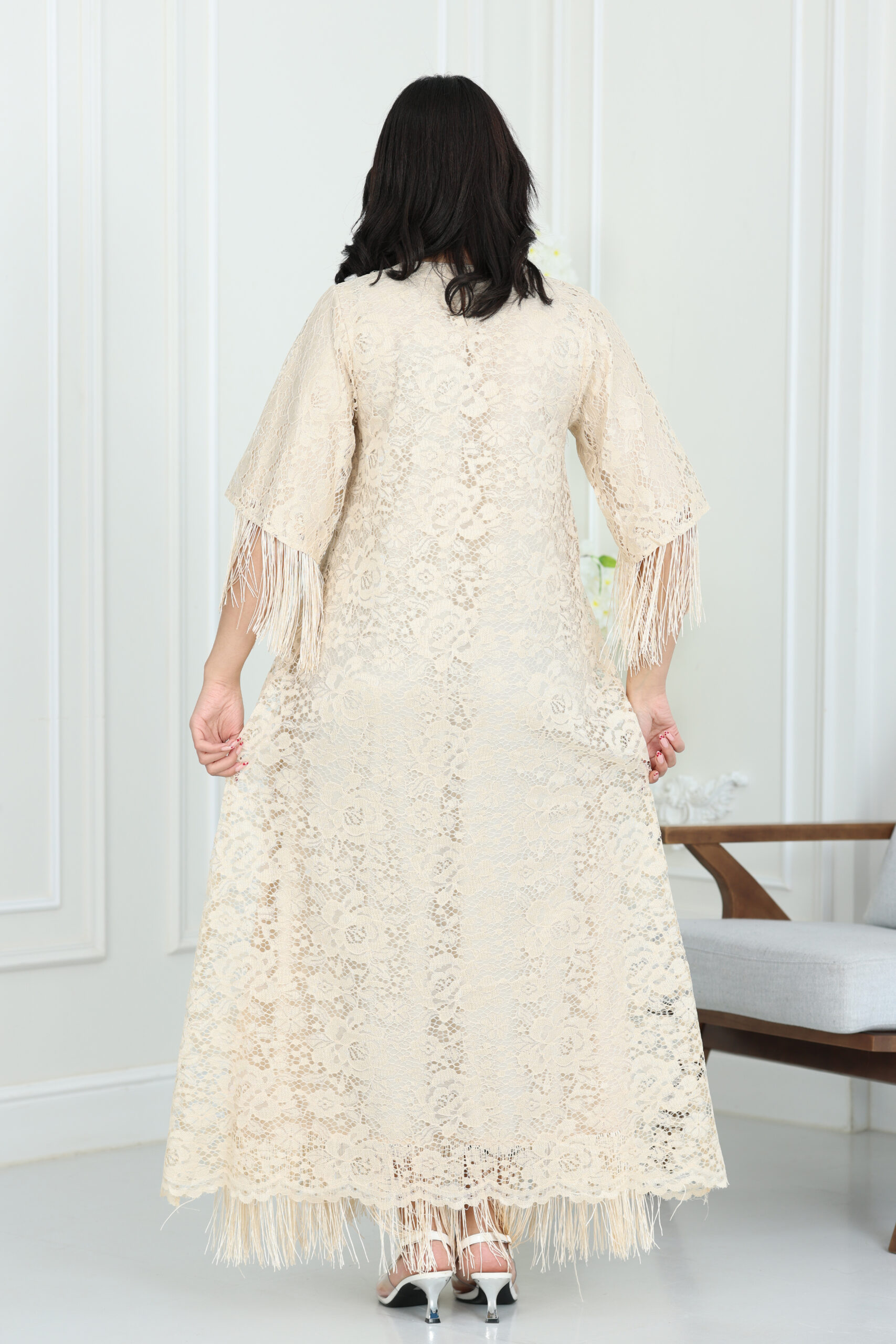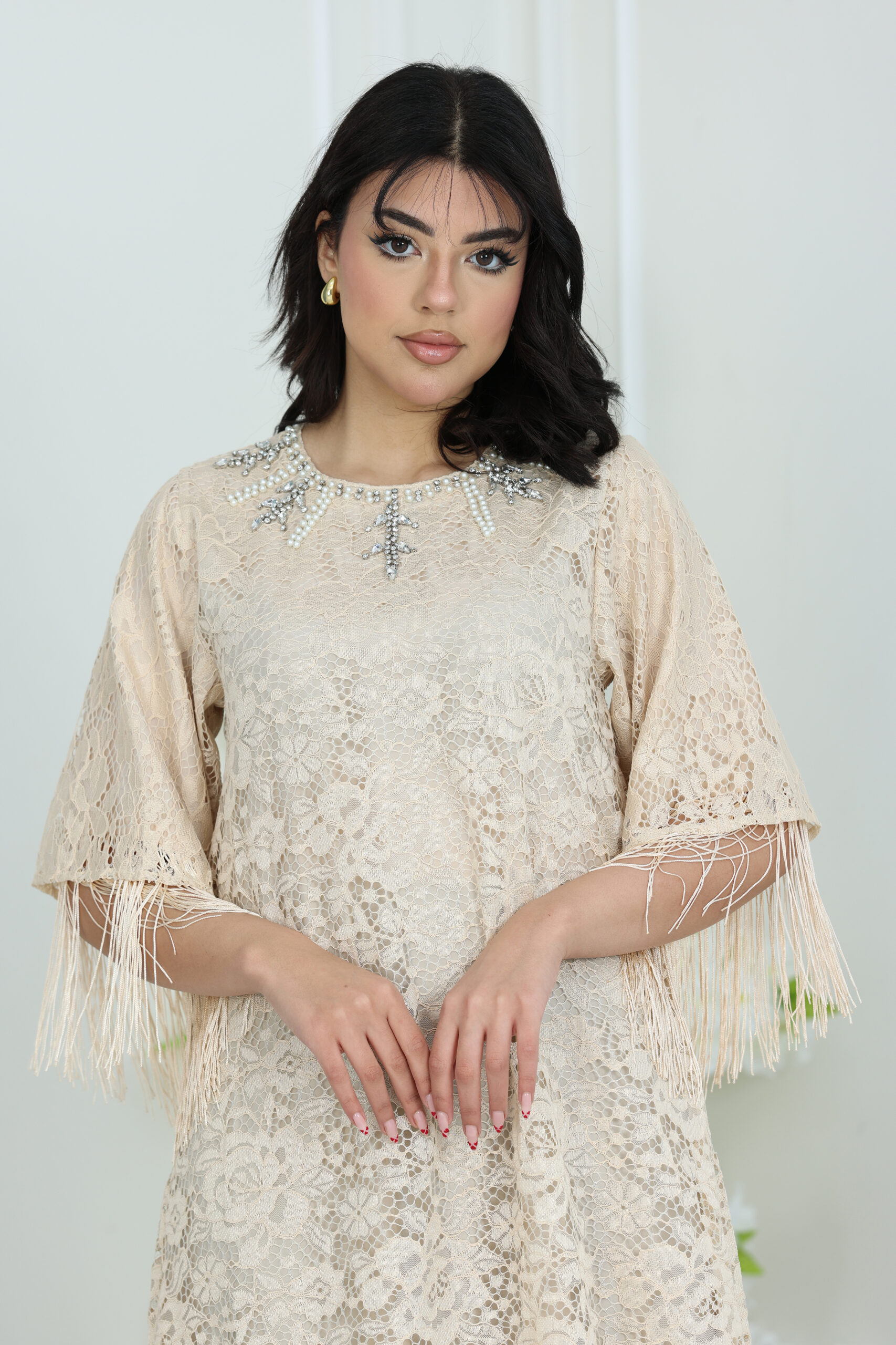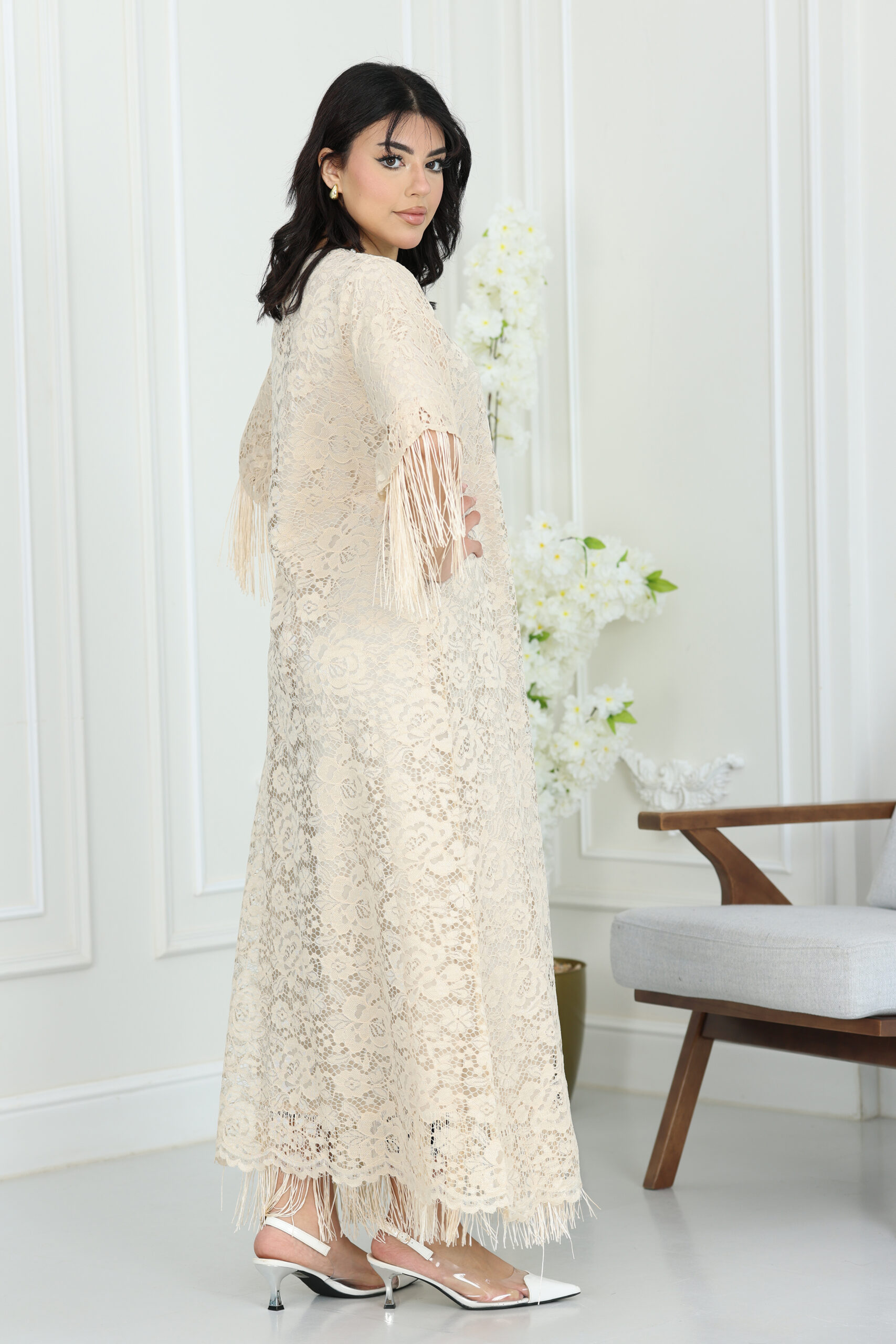 تأتي هذه الجلابية بتصميم عصري يواكب ترندات 2026، حيث تتميز بياقة مرصعة بالكامل بشغل الشك اليدوي من الكريستال واللؤلؤ والخرز اللامع الذي يمنح وجهكِ إشراقة ملكية ويغنيكِ عن المجوهرات. أكثر ما يميز الموديل هو قماش الدانتيل الفاخر المشغول بالكامل بنقوش زهرية دقيقة تنسدل بنعومة على الجسم، مع أكمام واسعة تنتهي بشراشيب انسيابية “هدب” تضفي لمسة من الحيوية والجاذبية مع كل إيماءة. التصميم يركز على إبراز جمالية التفاصيل الدقيقة التي تعودتِ عليها في تصاميمنا الفاخرة التي تناسب أرقى السهرات والمناسبات الرسمية.