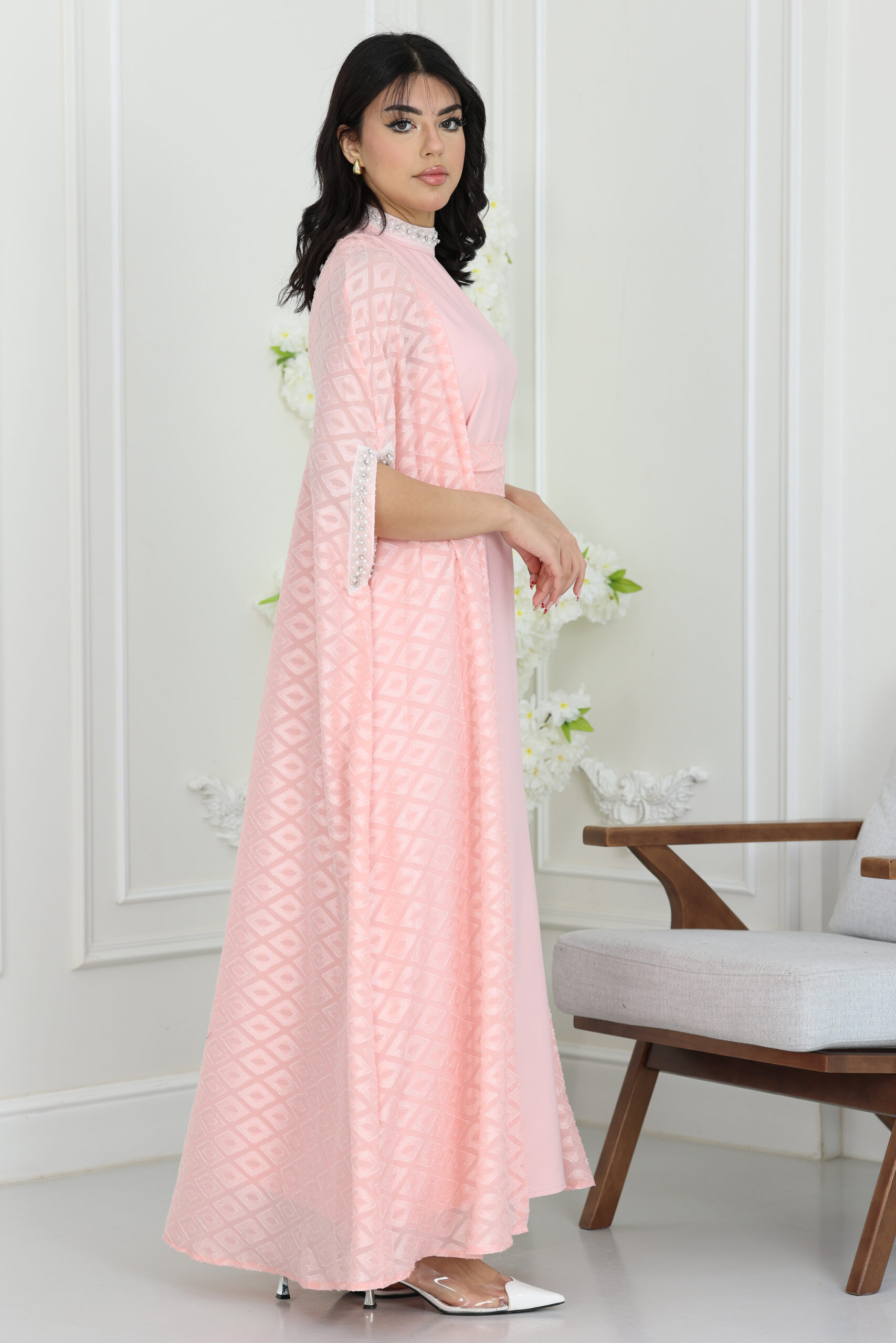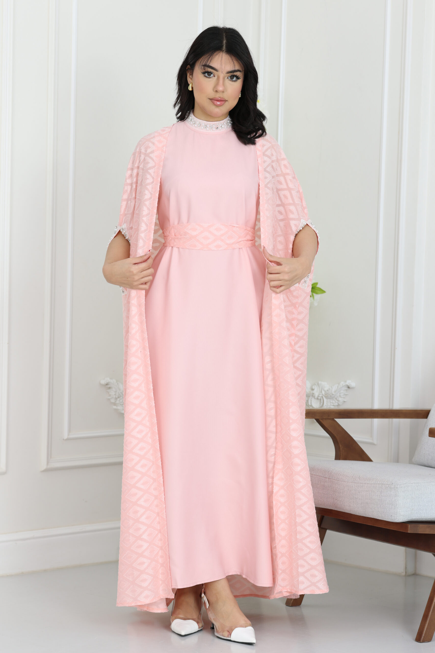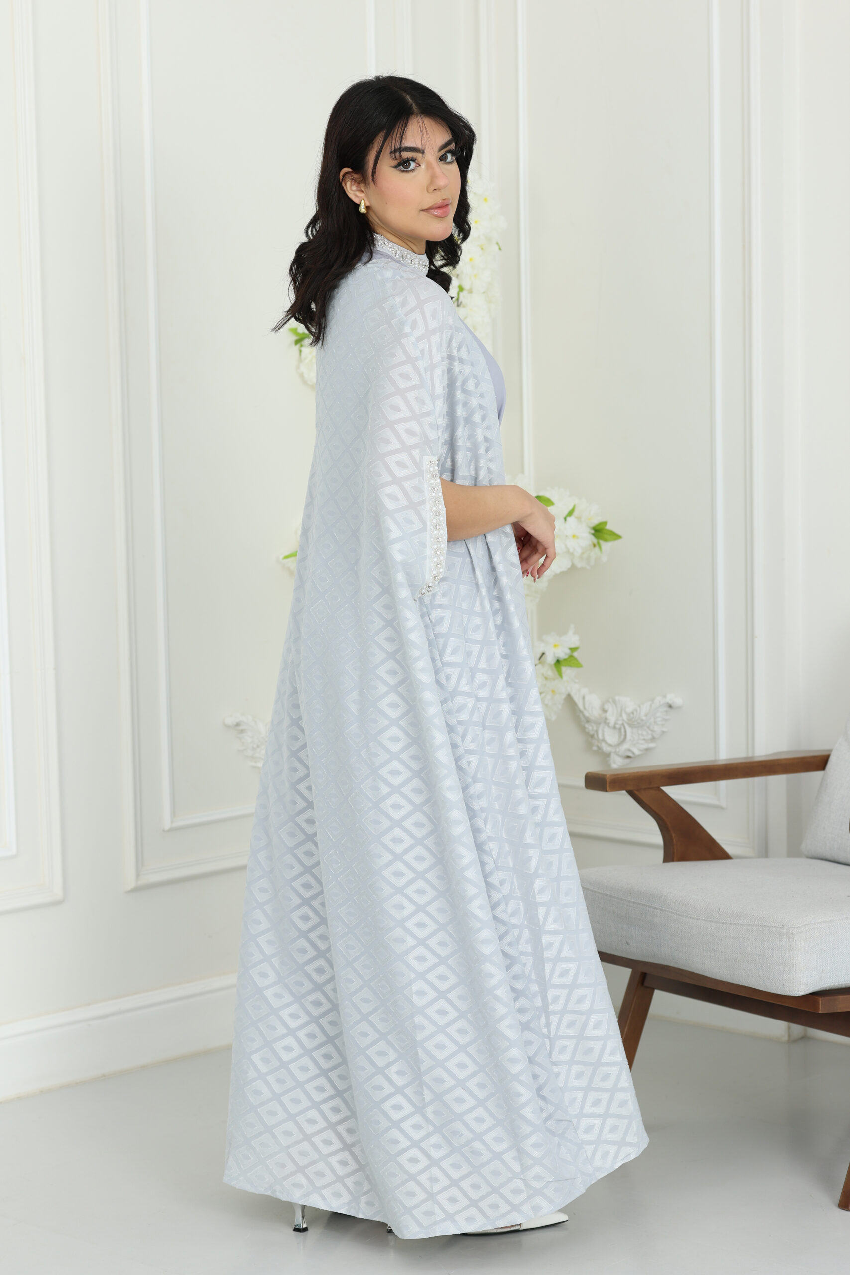 يتميز هذا الموديل بتصميم “الكيب” الملكي الذي ينسدل بنعومة على كامل القوام، مما يعطيكِ حركة انسيابية ووقار استثنائي أثناء الحركة. الياقة تأتي بتصميم “هاي نيك” مرصع بالكامل بشغل الشك اليدوي الفاخر، مع تطريزات كريستالية منثورة بدقة على كامل الجلابيه لتعطي بريقاً هادئاً يشبه النجوم. الأكمام مصممة بفتحات جانبية واسعة تسمح بظهور الأكمام الداخلية الضيقة، مما يدمج بين الاحتشام والعصرية في آن واحد، مع طول كامل يلامس الأرض ليمنحكِ هيبة الحضور في كل محفل
