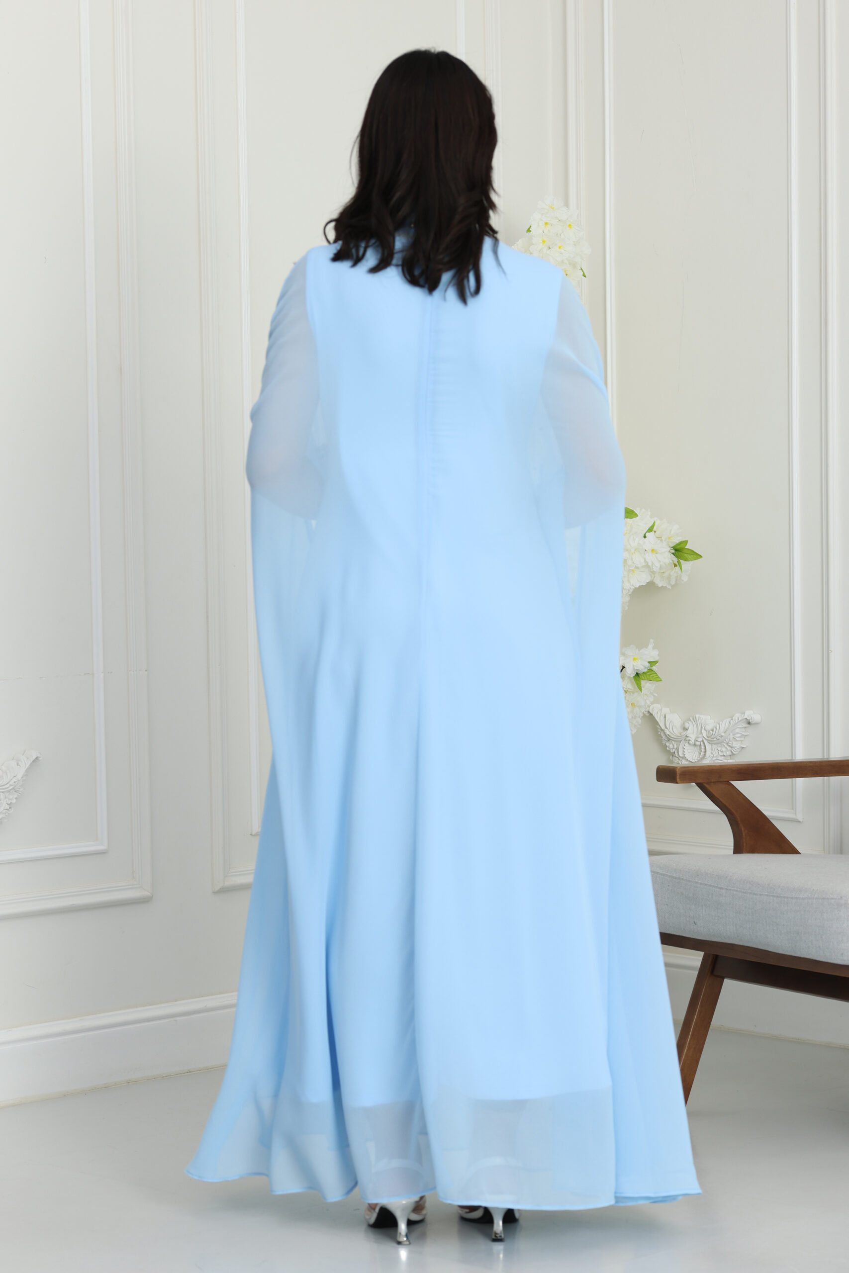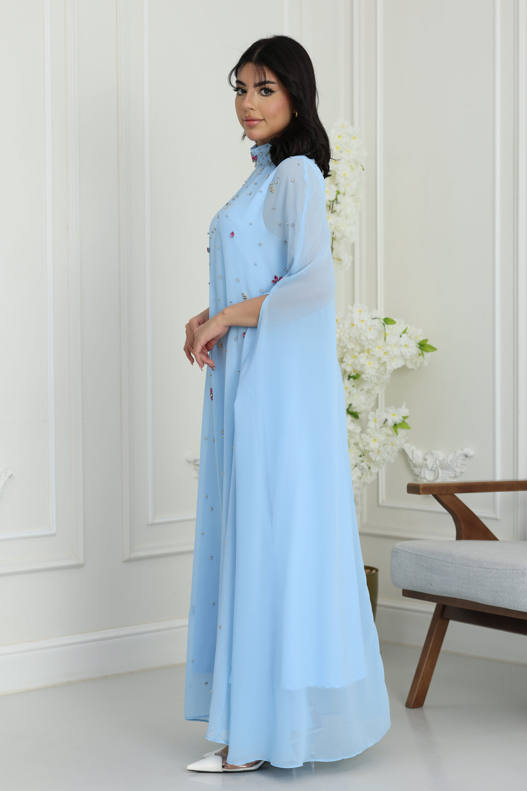 يبرز جمال هذا التصميم في الياقة العالية “هاي نيك” المرصعة بالكامل بشغل “الشك” اليدوي من الكريستال والخرز اللامع اللي يغنيكِ عن ارتداء العقد. أكثر ما يميز الموديل هو الأكمام الواسعة “فراشة” اللي تنسدل من الأكتاف لتعطي حركة انسيابية ساحرة، والمزينة بكريستالات وزهور لؤلؤية بارزة ومنثورة بأسلوب فني على كامل الفستان. القصة الطويلة والواسعة تضمن لكِ الستر والوقار المطلق مع لمسة عصرية تواكب أحدث صيحات الموضة العالمية بروح سعودية أصيلة.