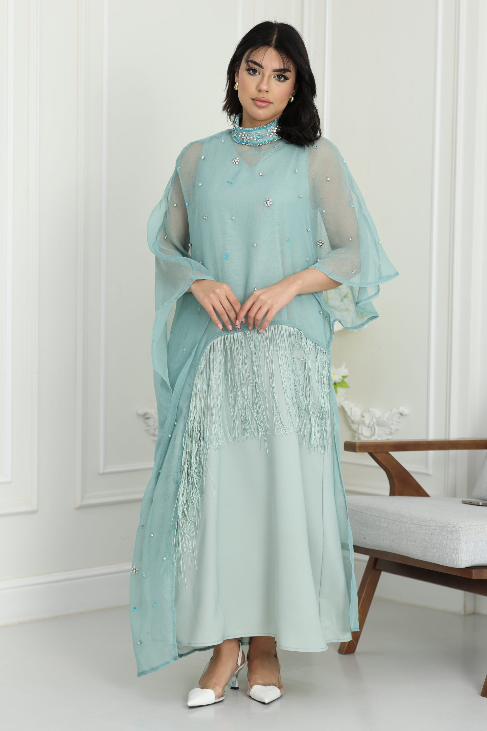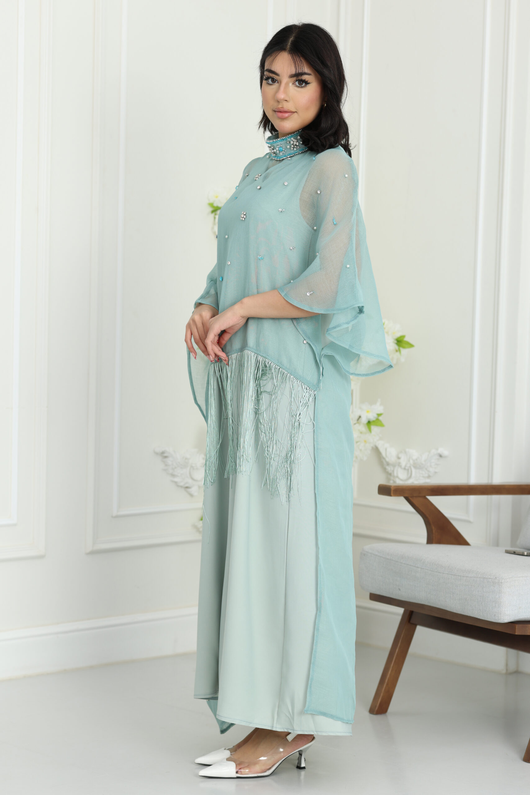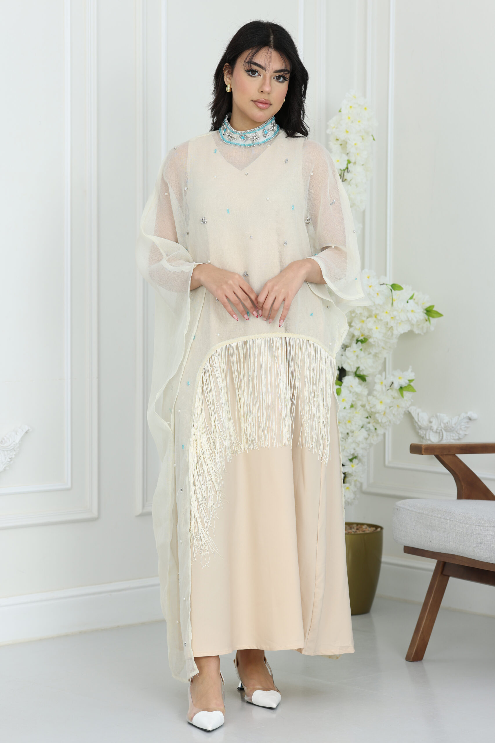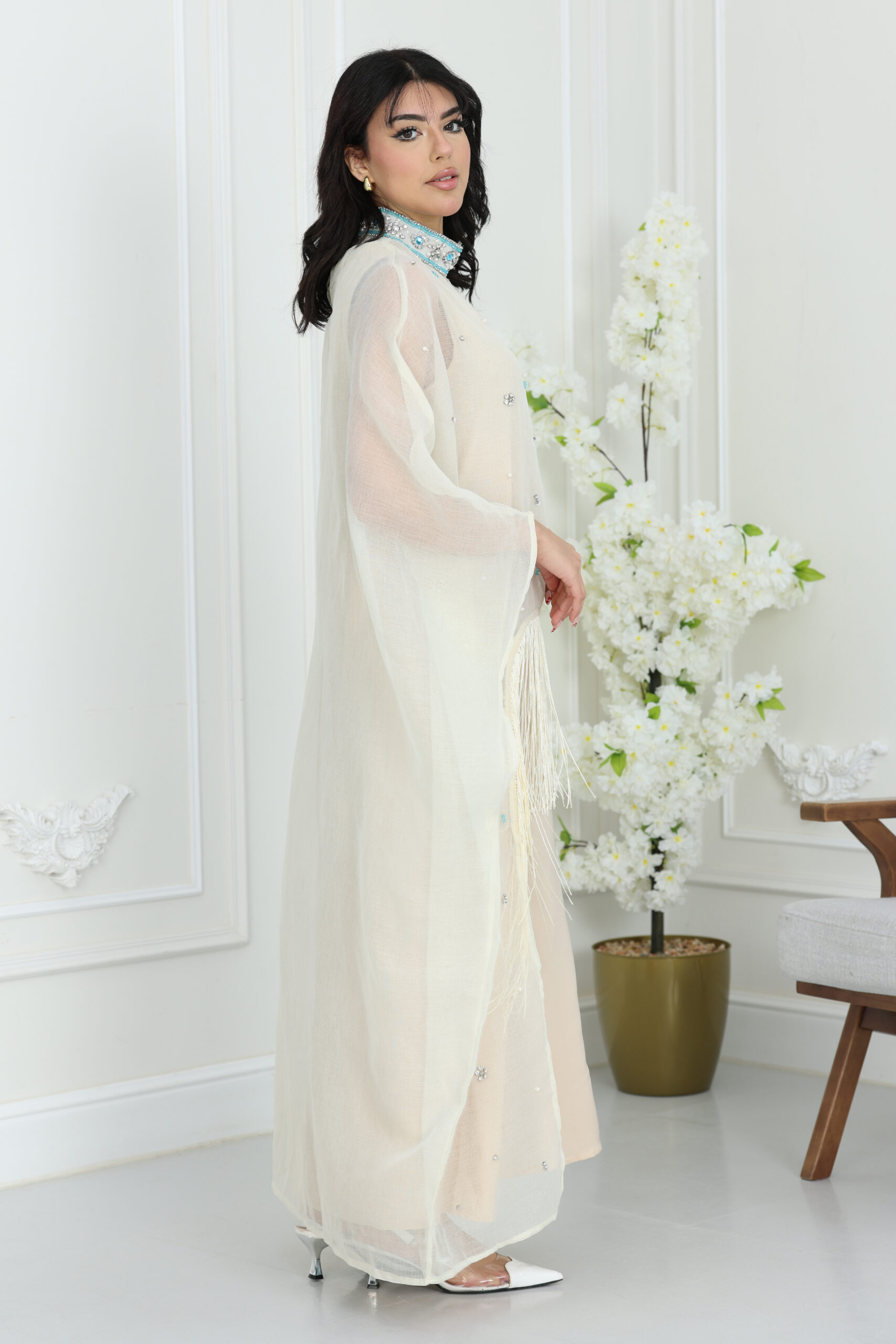 يتميز هذا الفستان بتصميم الكيب الانسيابي اللي ينسدل بنعومة فائقة من الأكتاف ليعطيك حركة ملكية ووقار ماله مثيل. الياقة تأتي بتصميم هاي نيك فخم مرصع بالكامل بشغل الشك اليدوي والكريستال اللامع اللي يغنيك عن المجوهرات ويبرز ملامح وجهك ببريق ساحر. أكثر ما يميز الموديل هو إضافة الهدب الناعم “الشراشيب” أسفل الصدر وبشكل مائل يعطي حركة جذابة مع كل خطوة، مع توزيع دقيق لحبات اللؤلؤ والكريستال المنثورة على كامل الفستان ليعطيك مظهر الكوتور الراقي اللي تبحثين عنه في سهراتك الكبرى