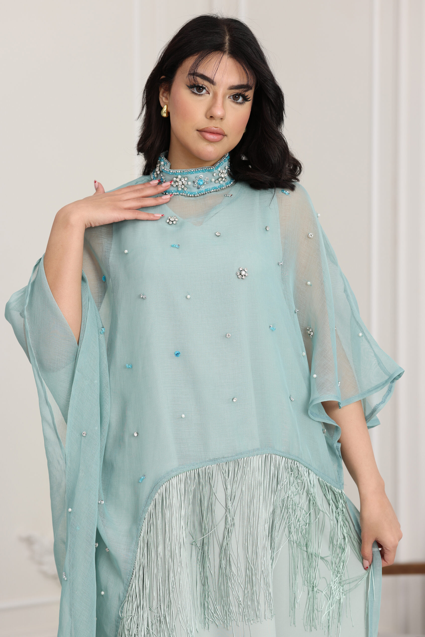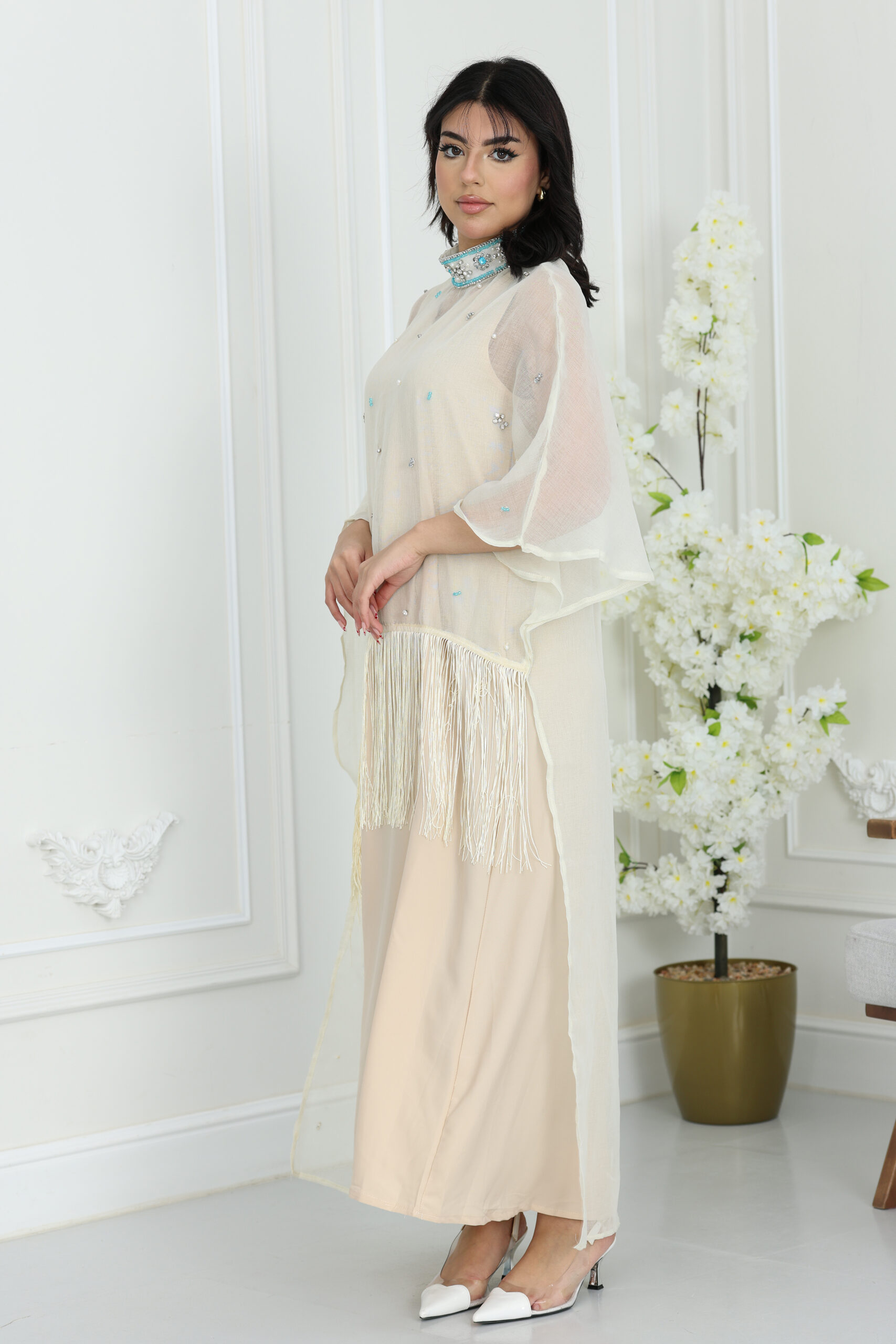 التصميم ياقة مطرزة بالشك اليدوي مع إضافات الهدب واللؤلؤ