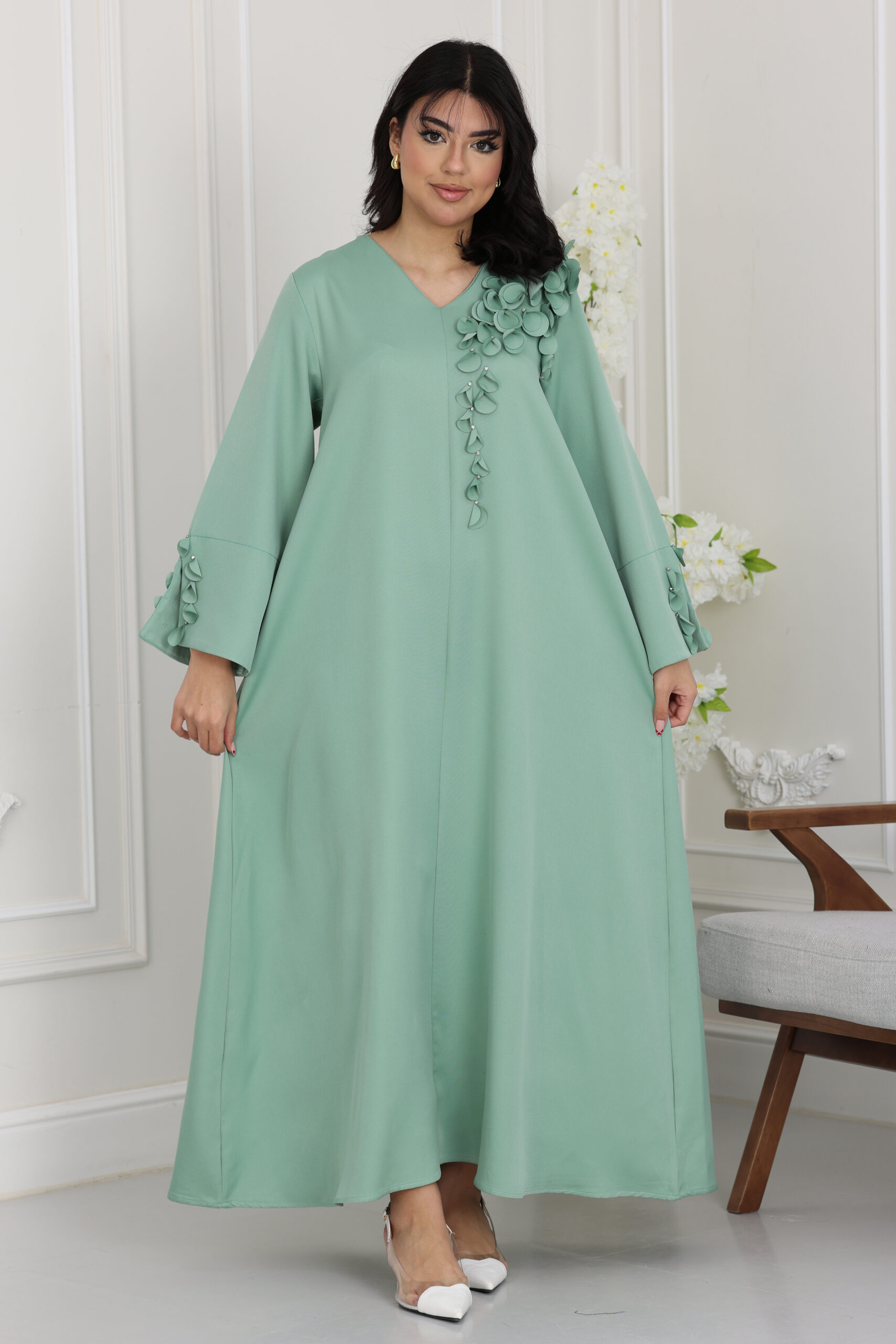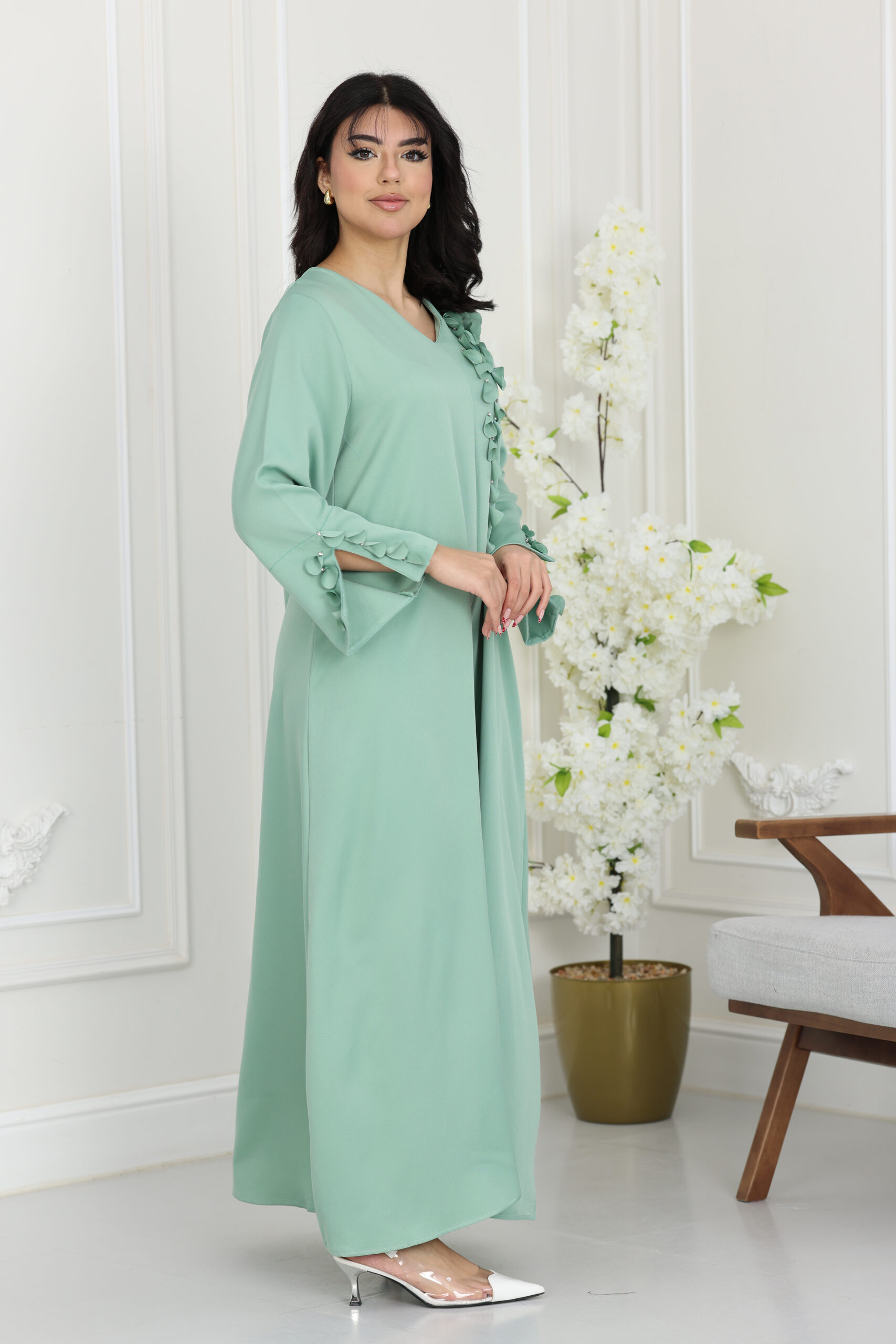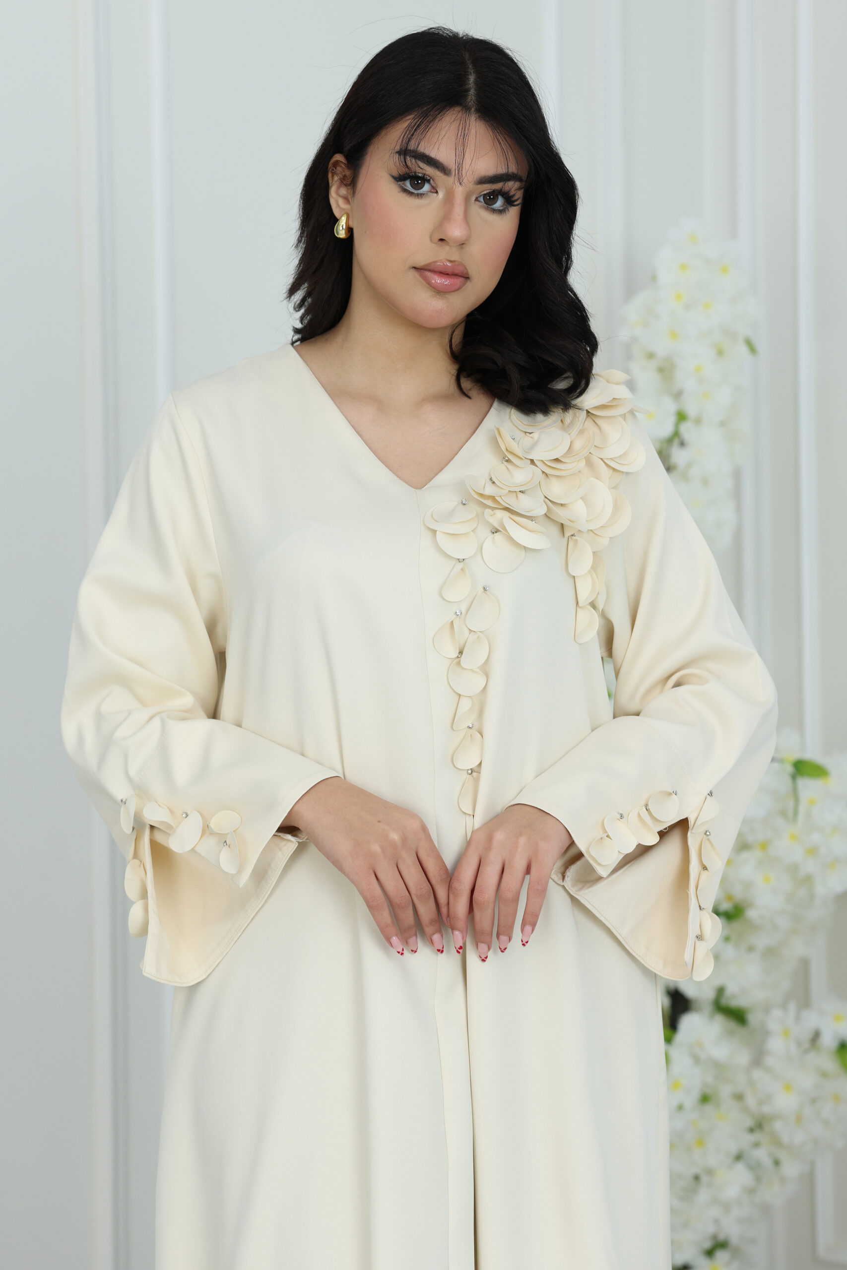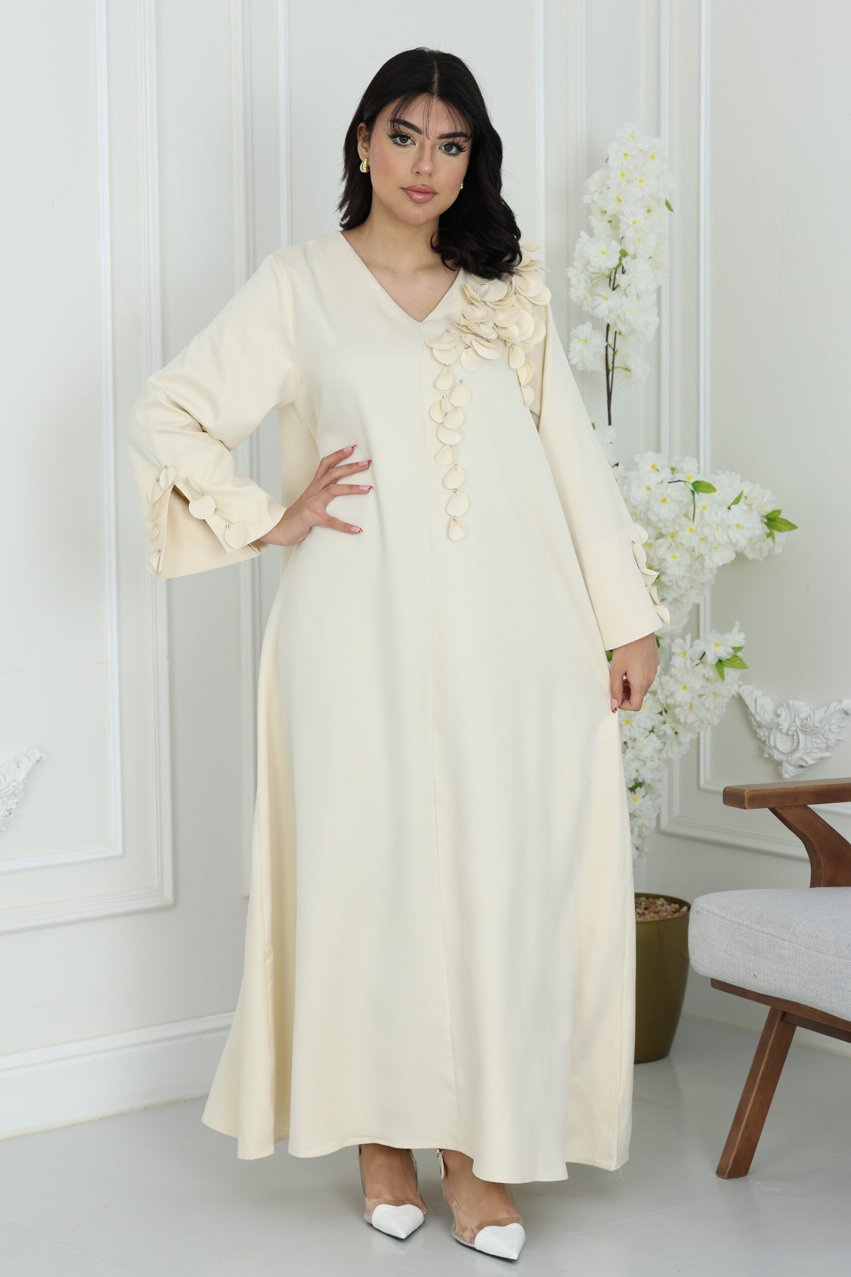 يتميز هذا الفستان بقصة واسعة وانسيابية مريحة جداً تعطيكِ حضوراً مهيباً ووقاراً ماله مثيل. الياقة تأتي بتصميم فتحة V أنيقة مزينة ببتلات ورد قماشية بارزة ومنفذة يدوياً بحرفية عالية، حيث تمتد هذه الورود من الكتف حتى منتصف الصدر لتضفي لمسة فنية فريدة. الأكمام واسعة وتنتهي بزم عند المعصم مع تزيينها ببتلات الورد الكبيرة التي تتحرك معكِ بنعومة في كل إيماءة، مع طول كامل يلامس الأرض ليعطيكِ مظهر الكوتور الراقي اللي تبحثين عنه في سهراتك الكبرى