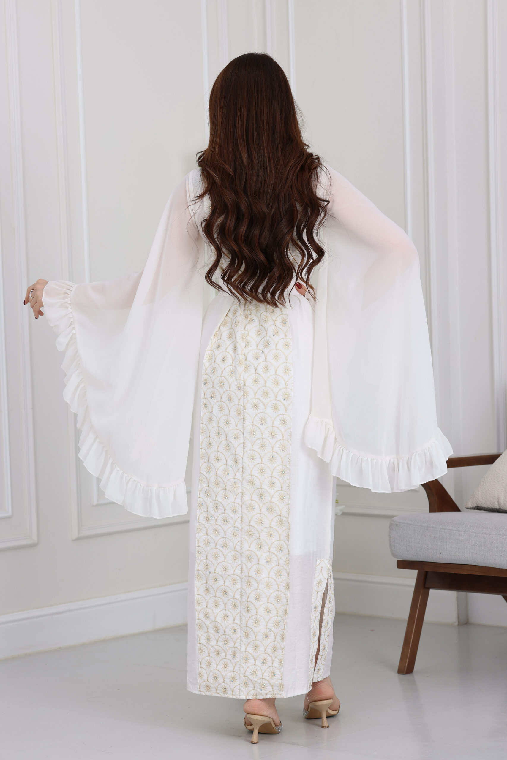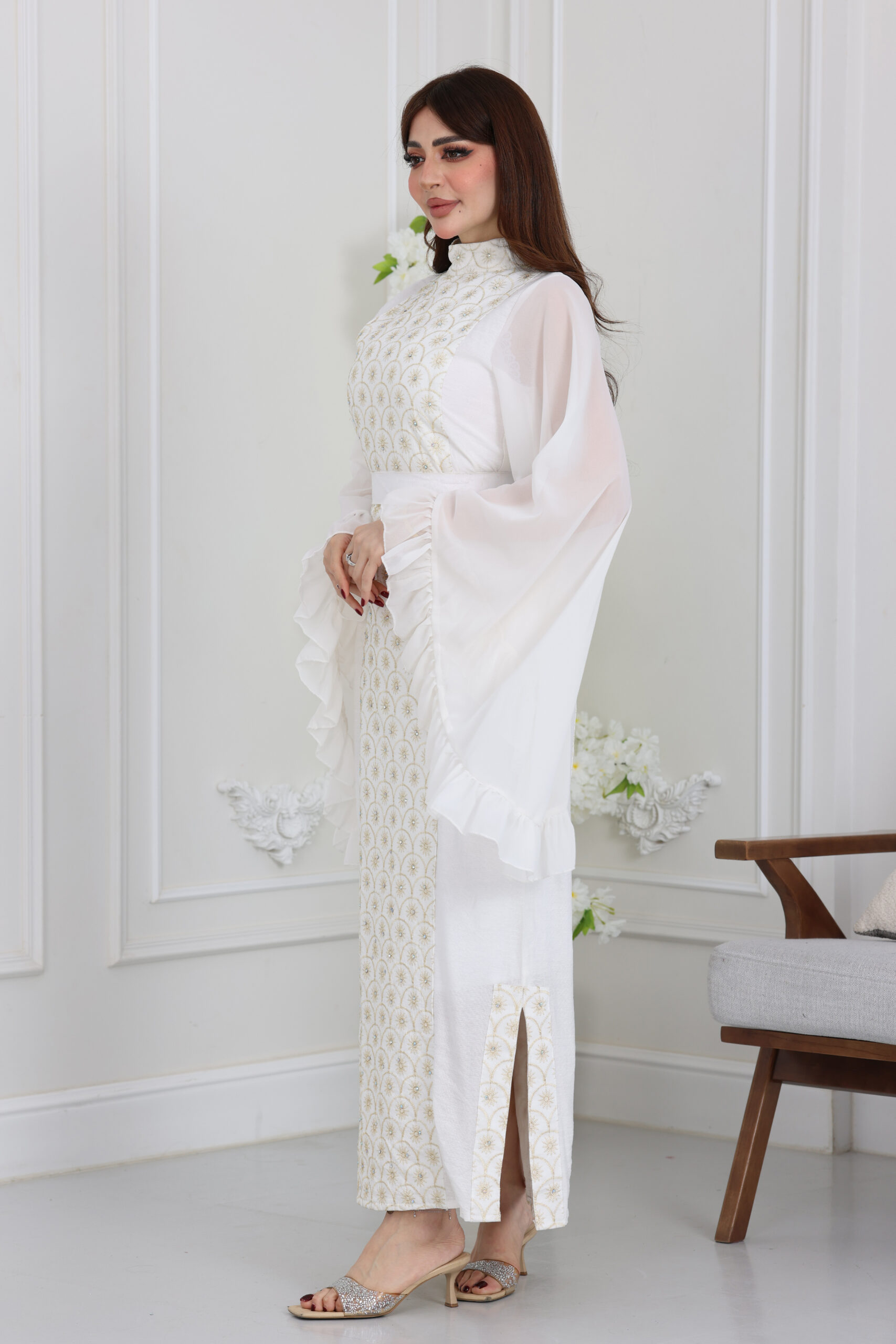 يتميز هذا الفستان بقصة “ميدي” كلاسيكية تبرز جمال القوام بأسلوب راقي ومحتشم في نفس الوقت. الياقة تأتي بتصميم هاي نيك فخم مرصع بالكامل بشغل التطريز الذهبي الفاخر على شكل شموع وشمس منسقة بدقة، مما يغنيكِ عن ارتداء الكثير من المجوهرات. أكثر ما يميز الموديل هو الأكمام الواسعة جداً من الشيفون الرقيق التي تنتهي بكشكشة “رافلز” ناعمة تعطي حركة انسيابية ملكية مع كل خطوة، مع حزام خصر عريض يبرز جمال الخصر بشكل متناسق وجذاب.
