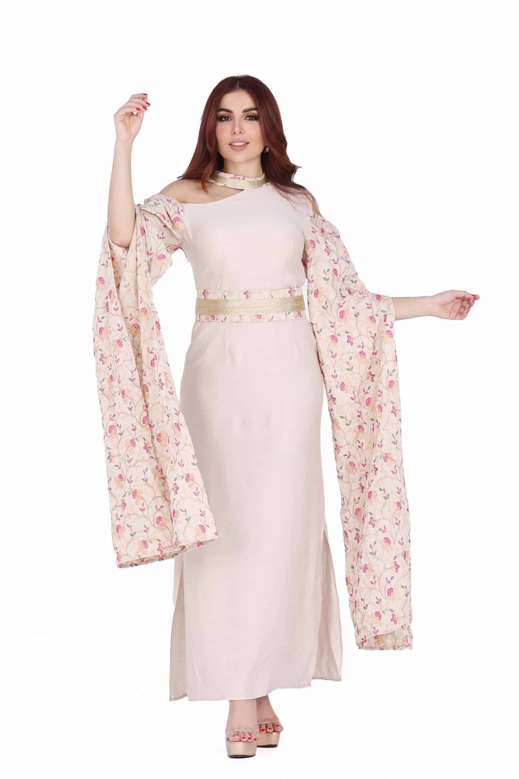 الأكمام: تتميز الجلابية بأكمام طويلة وفضفاضة، مما يوفر راحة وحرية الحركة. قد يتم تزيين أطراف الأكمام بتطريز مشجر بلون بيج لإضفاء لمسة جمالية وأناقة.