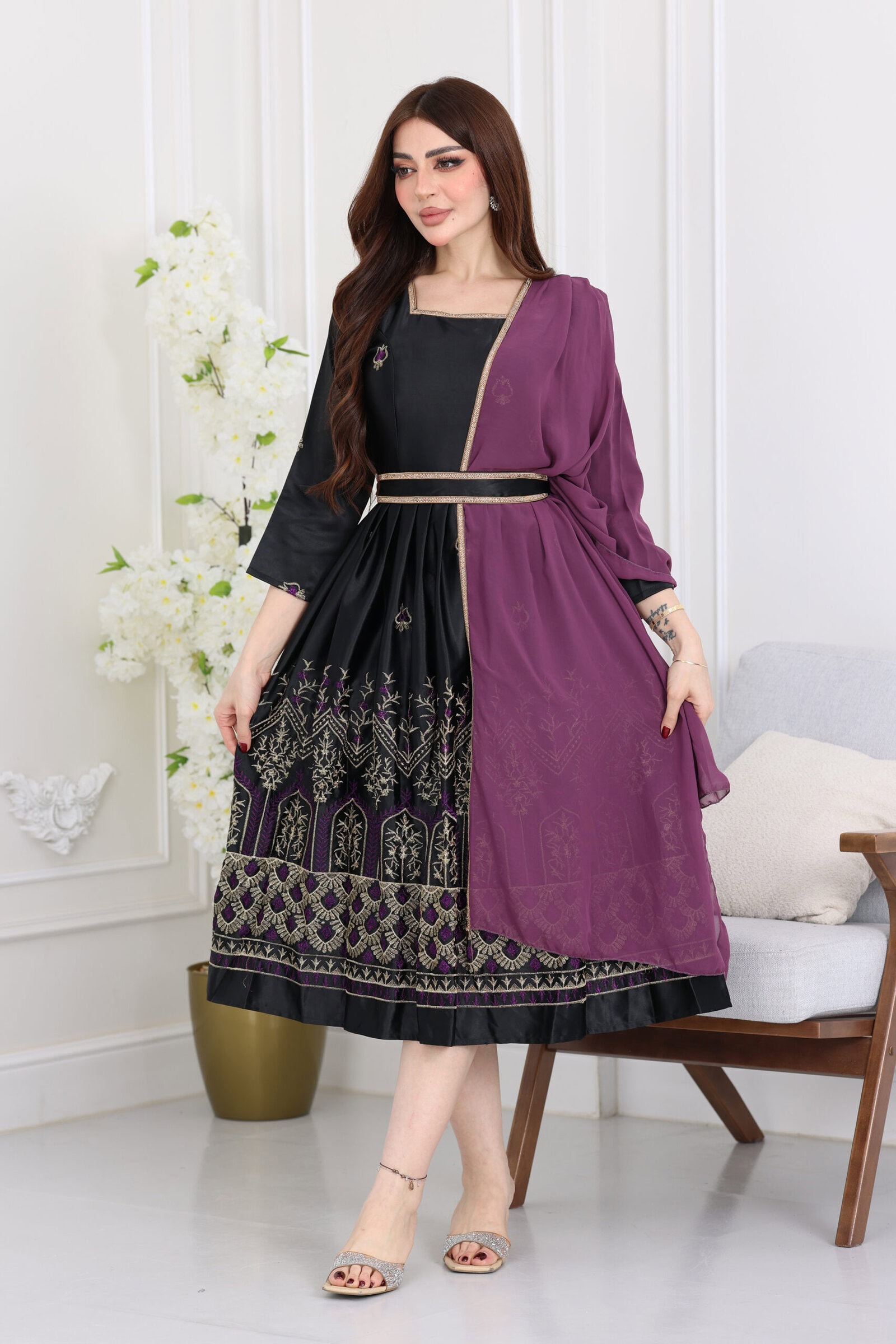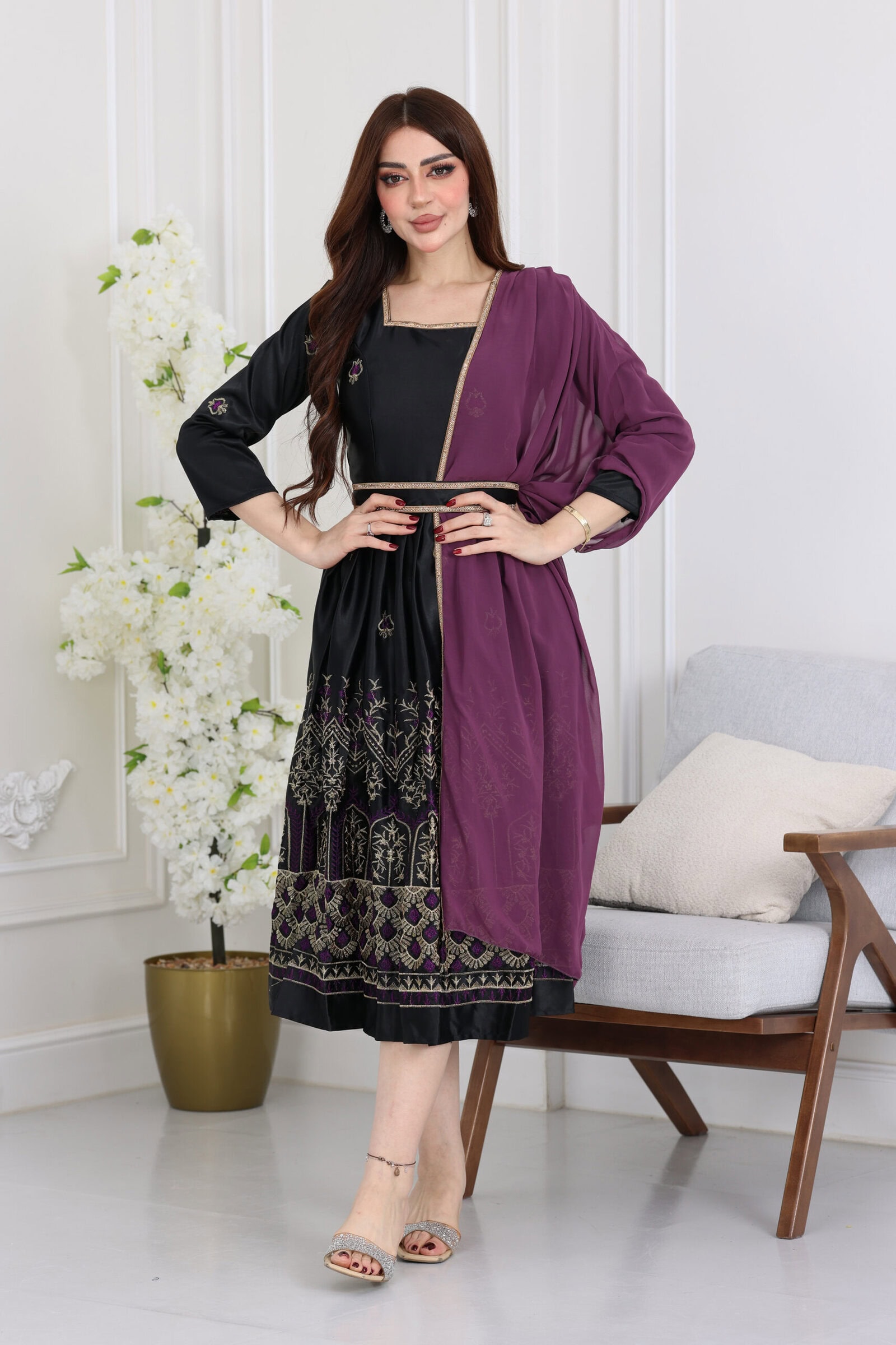 جلابيه رمضانيه بشال جانبي من خامة التفتة استرتش يتميز الجلابية بتطريز كمبيوتر  فخم بأكمام طويلة بشال جاني موف بخط ذهبي على اطراف الجلابية تضفي التطريز الكمبيوتري والأكمام الطويلة والشال الجانبي والخط الذهبي على أطراف الجلابية لمسات جمالية مميزة. هذه الجلابية مثالية للاحتفال بشهر رمضان وتعكس الأناقة والأناقة الخاصة بالمناسبة.