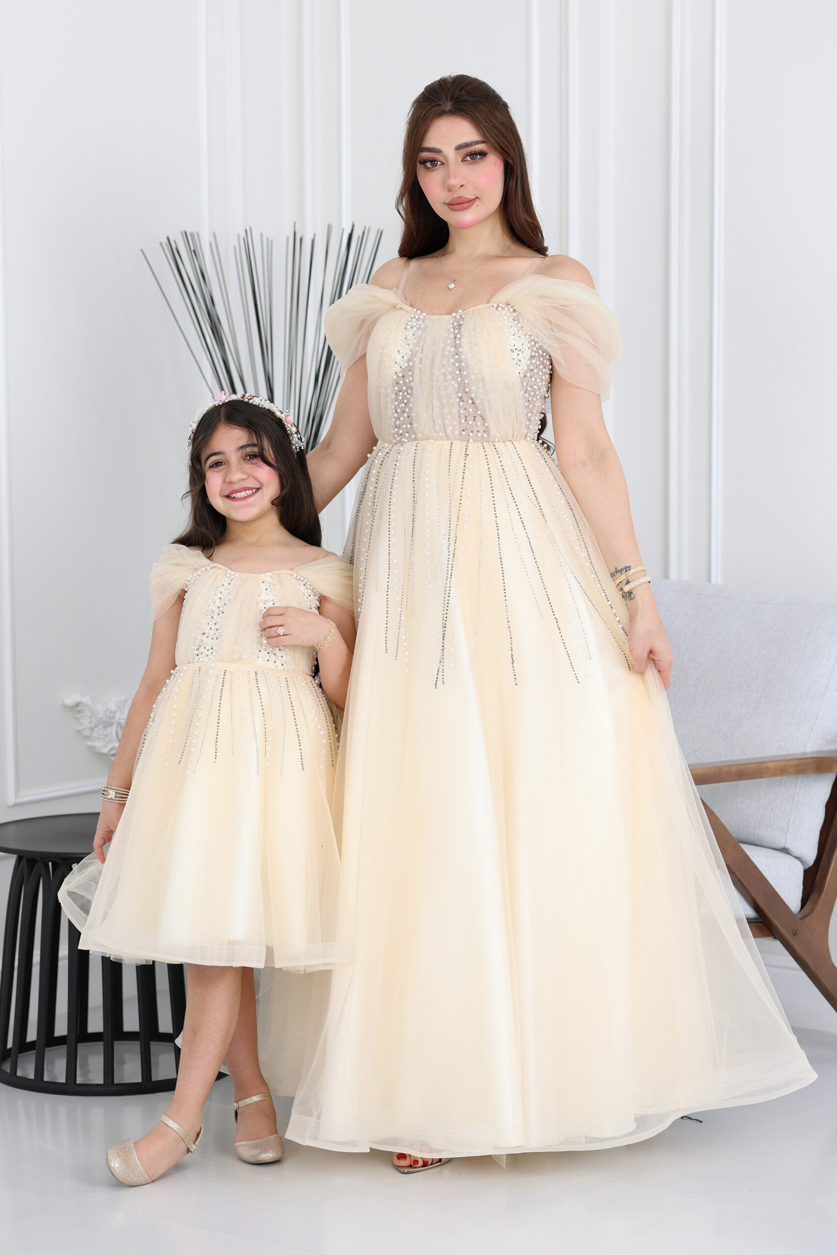 فستان بناتي تل لؤلؤ  يُعد هذا التصميم الخيار الأمثل للأمهات اللواتي يبحثن عن فساتين سهرة أطفال و فساتين بناتي للعيد تجمع بين الفخامة والبراءة. يتميز الفستان بقماش التل الناعم بطبقات تمنحه نفشة “منفوش” محببة للفتيات الصغيرات، مع أكمام منسدلة تزيد من رقة المظهر تكتمل روعة التصميم بتفاصيل الشك وحبات اللولو الموزعة بدقة على الصدر والمنسدلة كخيوط مضيئة، مما يجعله مناسباً جداً  ولأن راحة طفلتك أولويتنا، الفستان مبطن بخامة مريحة وناعمة على الجلد. يمكنكِ تنسيق هذا الموديل مع الفستان النسائي المشابه لدينا للحصول على إطلالة “الأم وبنتها” المميزة التي تخطف الأنظار.