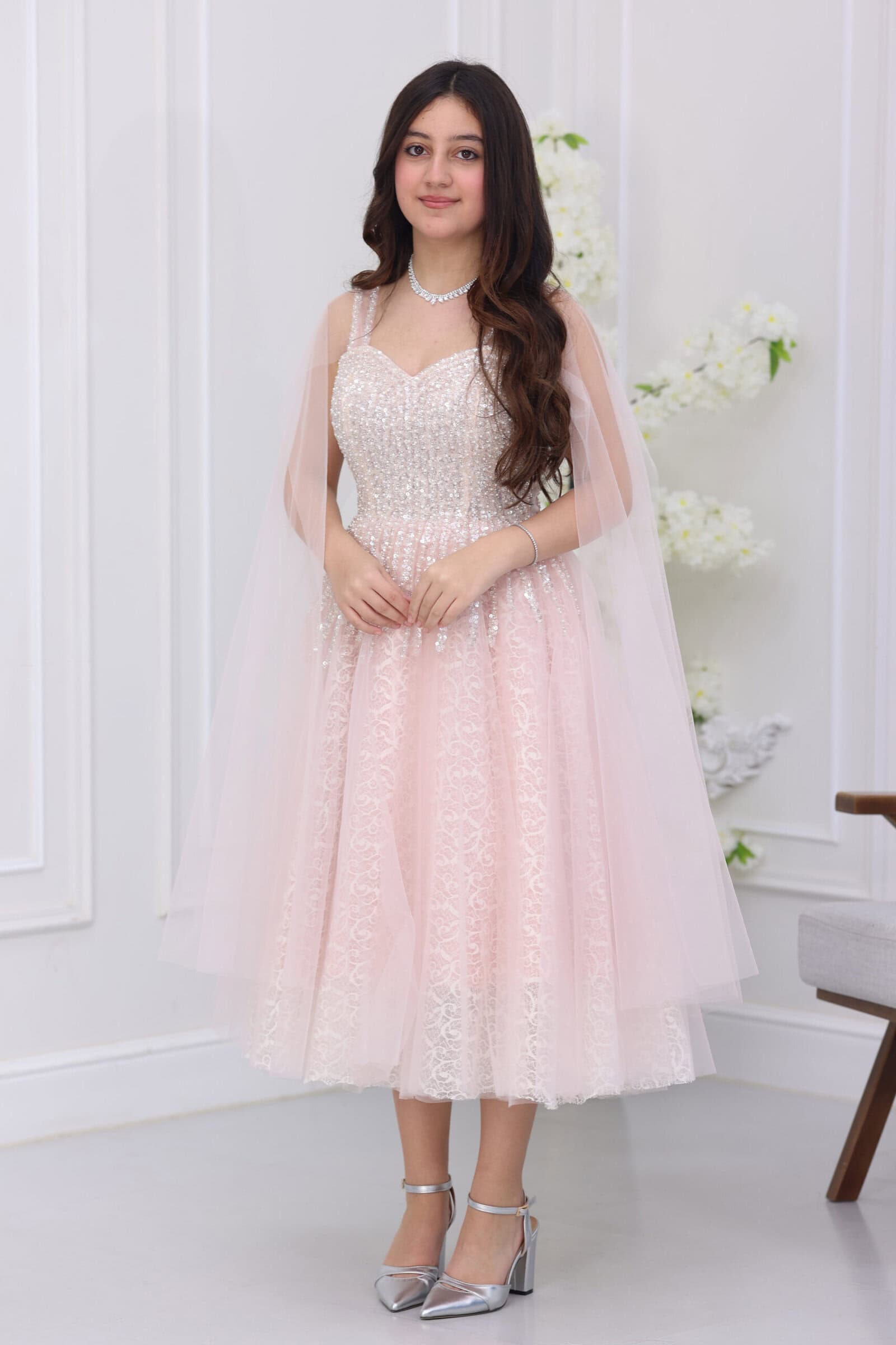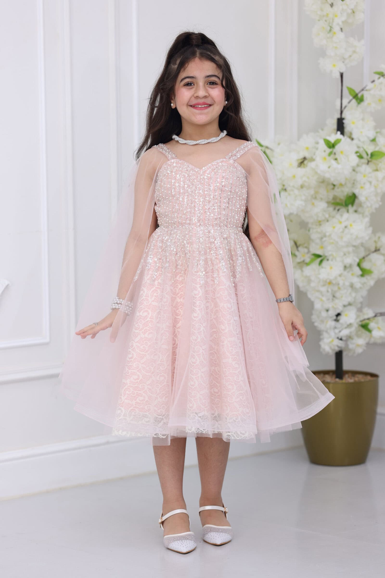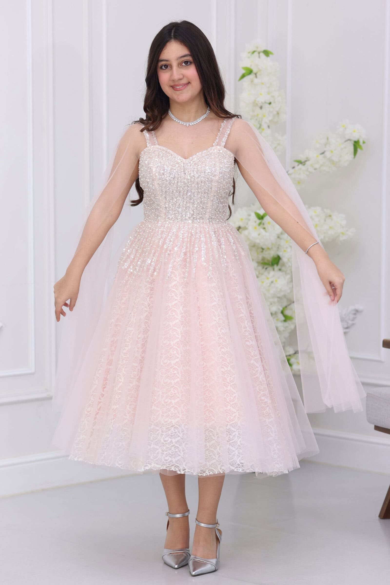 يتميز الفستان بتصميم كلاسيكي منفوش (Ball Gown) يعطي طفلتكِ حضوراً ملكياً، مع صدرية مطرزة بالكامل بشك يدوي كثيف من اللؤلؤ والكريستال اللامع الذي ينسدل برقة نحو الخصر. الموديل يأتي بياقة “قلب” أنيقة مع حمالات رفيعة، ويزينه وشاح شيفون ناعم (كيب) ينسدل من الأكتاف ليمنحها لمسة من السحر والخيال، مع طول ميدي (متوسط) يسمح لها بالحركة واللعب بكل راحة وتميز.