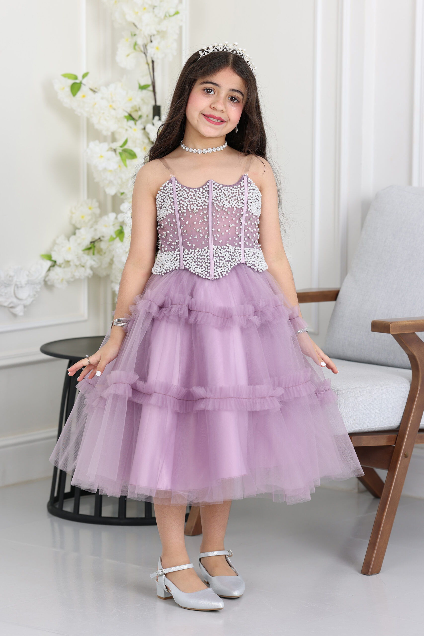 فستان بناتي طبقات تل بتصميم يركز على الفخامة المبهجة وحرية الحركة. يتميز الجزء العلوي بالشك البراق والخرز الفاخر، وهذا الشغل المتقن يضمن لها بريقاً وجاذبية تخطف الأنظار. الفستان مصمم بقصة أنيقة ومريحة في الصدر، ومناسب جداً للبس في الحفلات الطويلة.الجمال كله في التنورة القصيرة المصنوعة من طبقات تل مكشكشة ومنفوشة، وهذا يعطيها حجماً جميلاً ويسمح لها بالدوران واللعب بكل سهولة. هذا الموديل الأنيق من المصمم الحديث يعتبر أفضل فساتين البنات