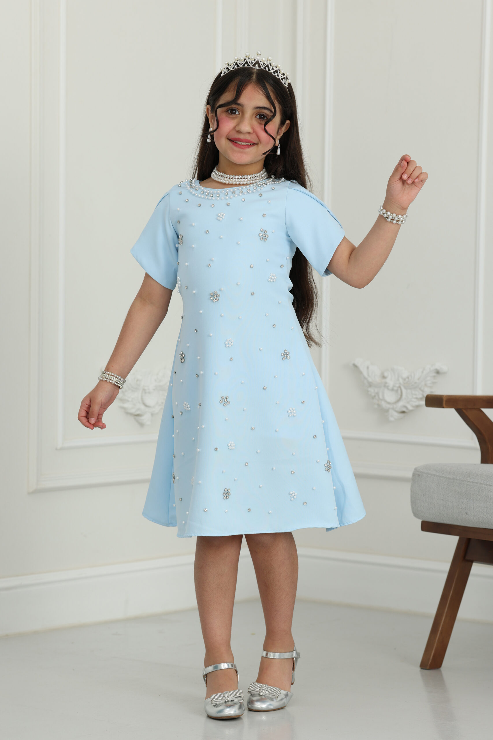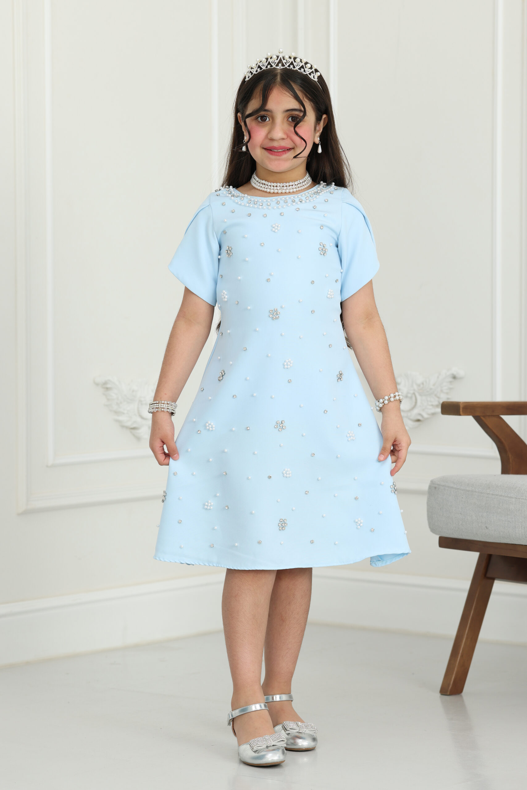 الفستان يجي بتصميم “ميدي” كلاسيكي وقصة انسيابية مريحة تسمح للبنت بالحركة واللعب بكل ثقة. يتميز بياقة أنيقة على شكل حرف V ممتدة، ومزين بأزرار لؤلؤية فخمة تضفي لمسة من الرقي الكلاسيكي. الأكمام الطويلة مصنوعة من الدانتيل المشغول بنقوش دقيقة تنتهي بزمّة ناعمة عند المعصم لتعطي طابعاً فرنسياً جذاباً، مع حزام خصر ثابت يبرز جمال التصميم ويجعله متناسقاً تماماً كأجمل فساتين سهرة للأطفال.
