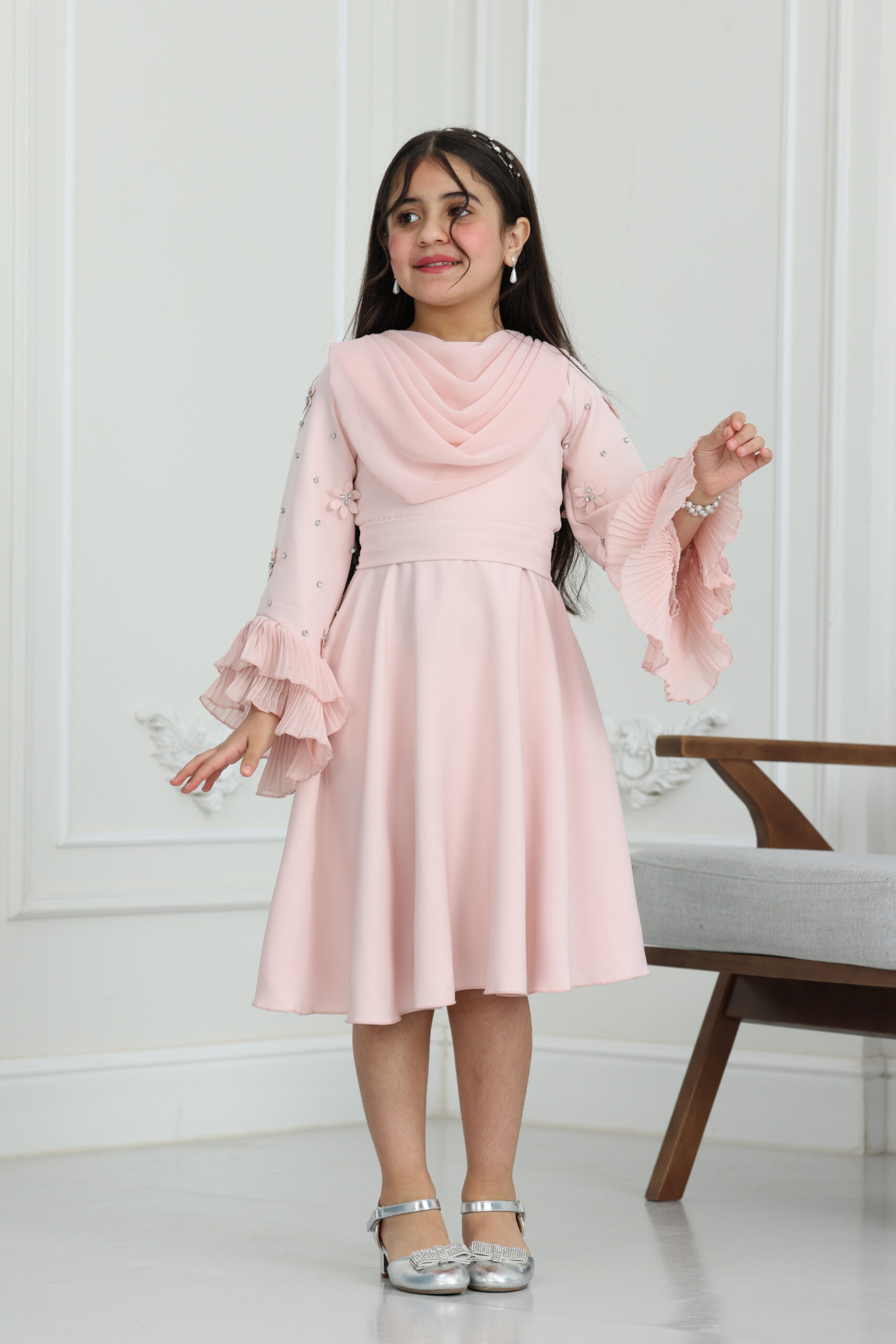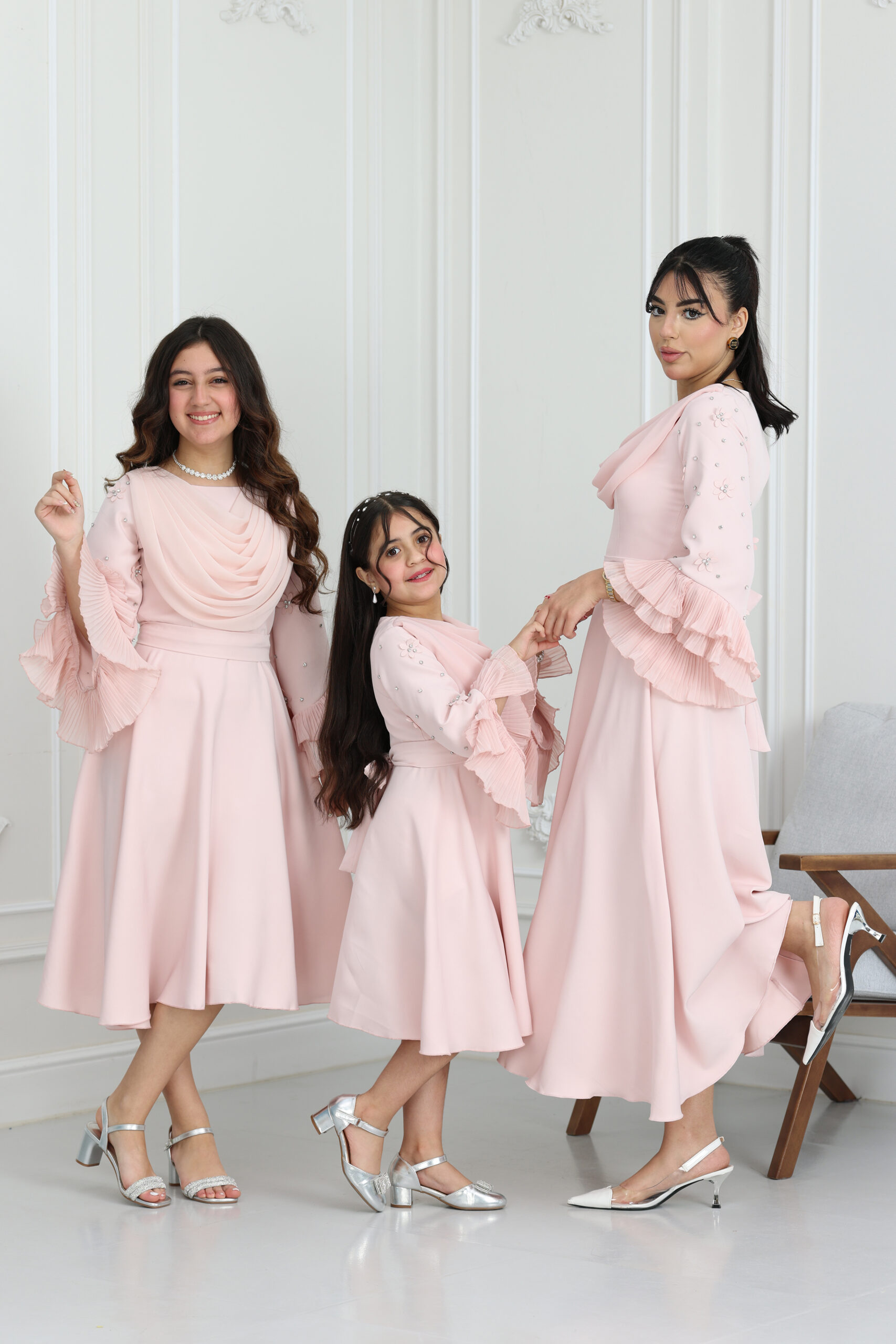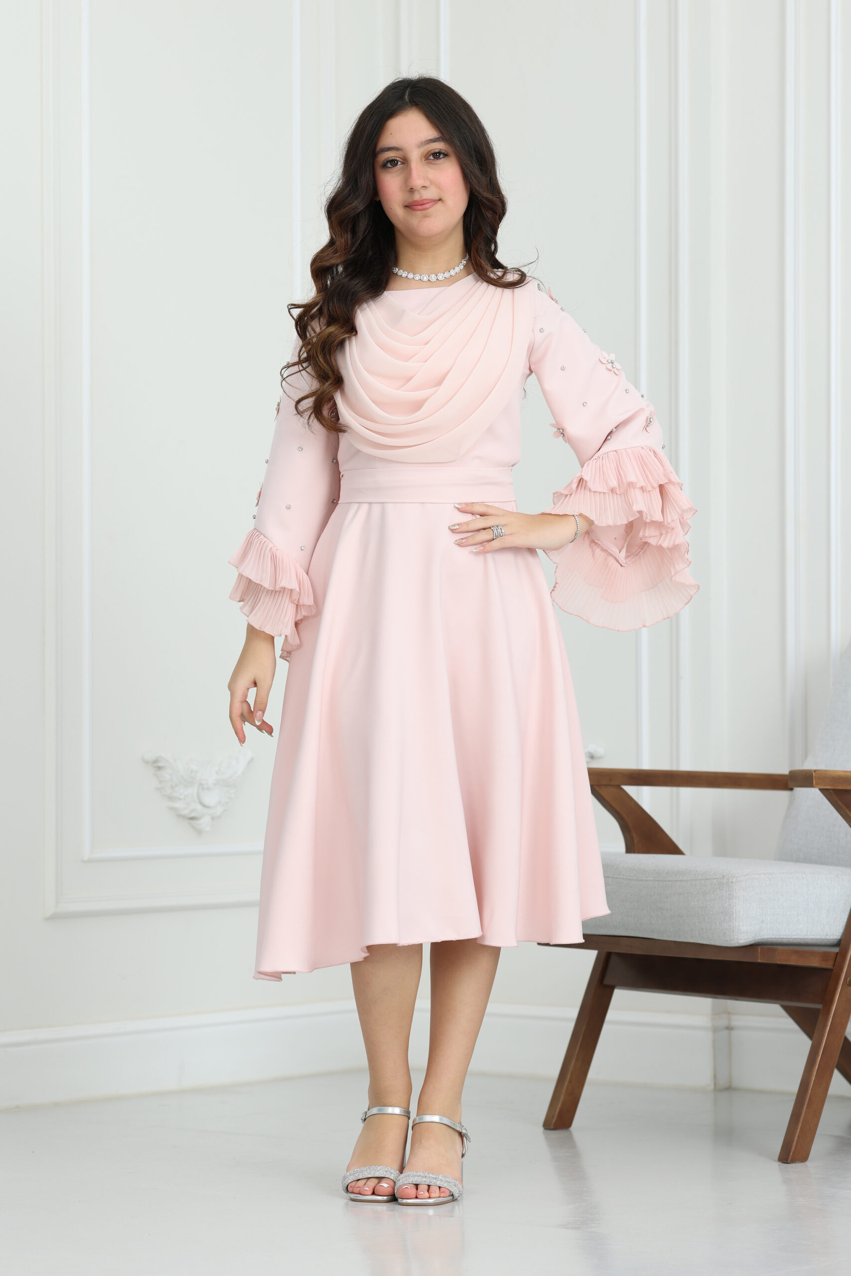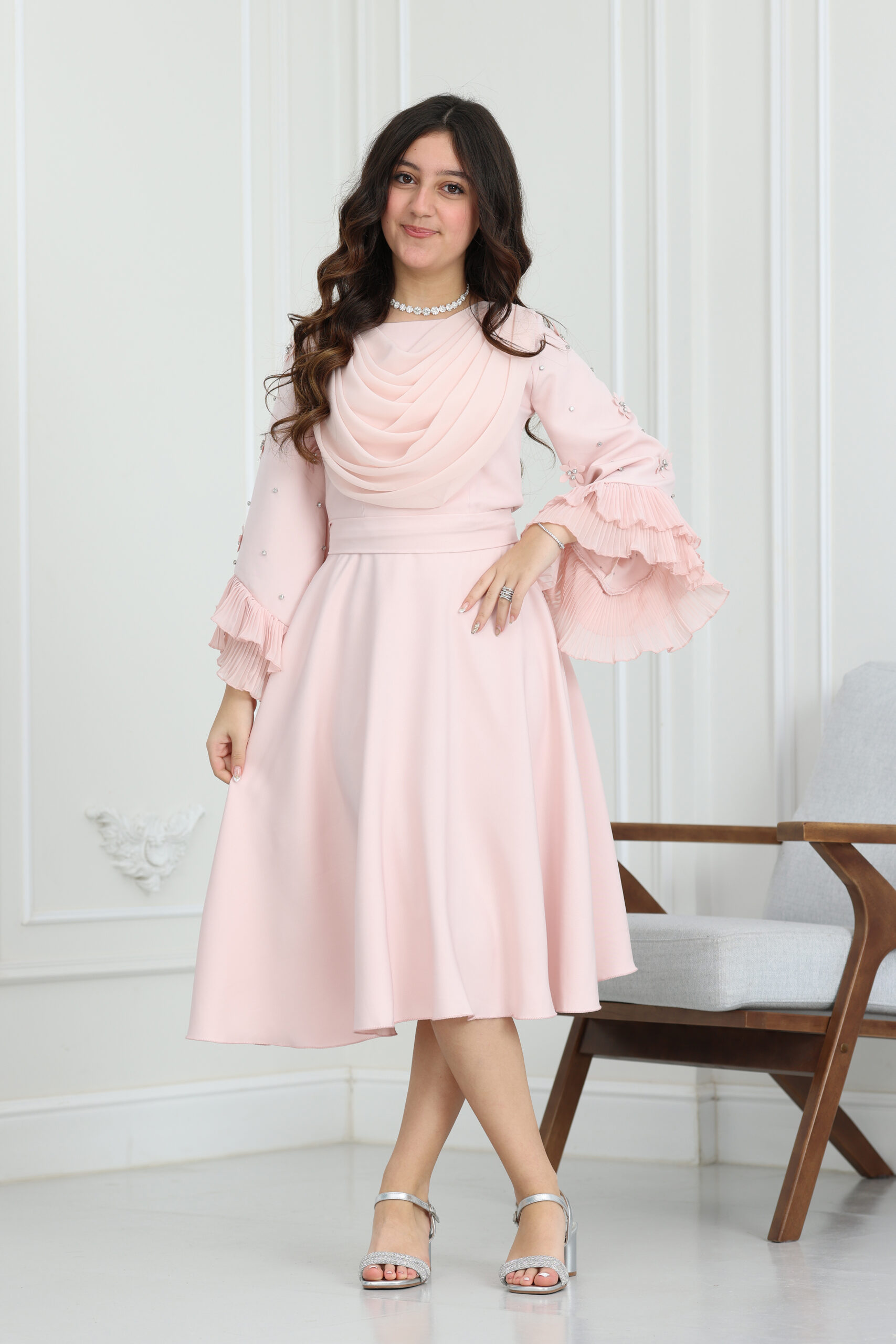 يتميز الفستان بقصة كلاسيكية واسعة من الأسفل تمنح البنت طابعاً انثوياً ساحراً، مع تفاصيل “درابيه” (Drapery) أنيقة تنسدل حول الرقبة والكتف لتعطي مظهراً غنياً وراقياً. الأكمام هي سر جمال الموديل، حيث تنتهي بكسرات (Pleats) واسعة ومنسقة بدقة تضفي حركة حيوية وفخامة مع كل إشارة. كما يتزين الفستان بتطريزات ناعمة من الكريستال والورود الصغيرة الموزعة بإتقان على الصدر والأكمام، مع حزام خصر يحدد القوام بجمالية فائقة وطول ميدي يتناسب مع ذوق المجتمع السعودي الراقي.