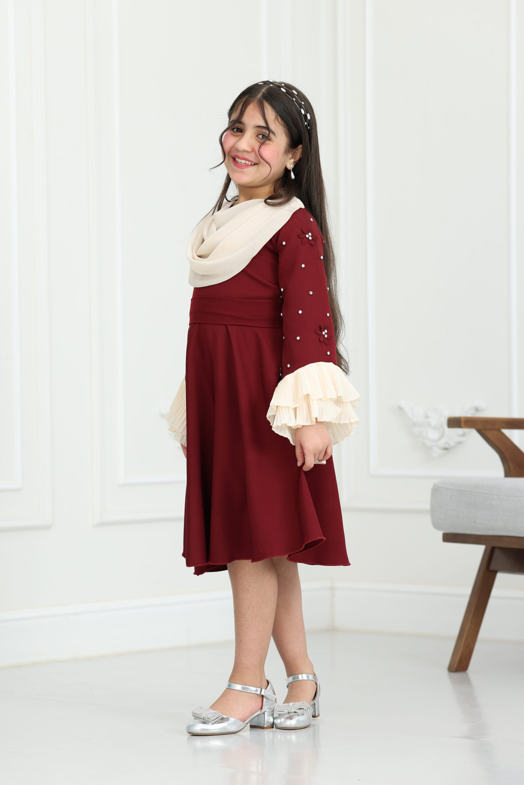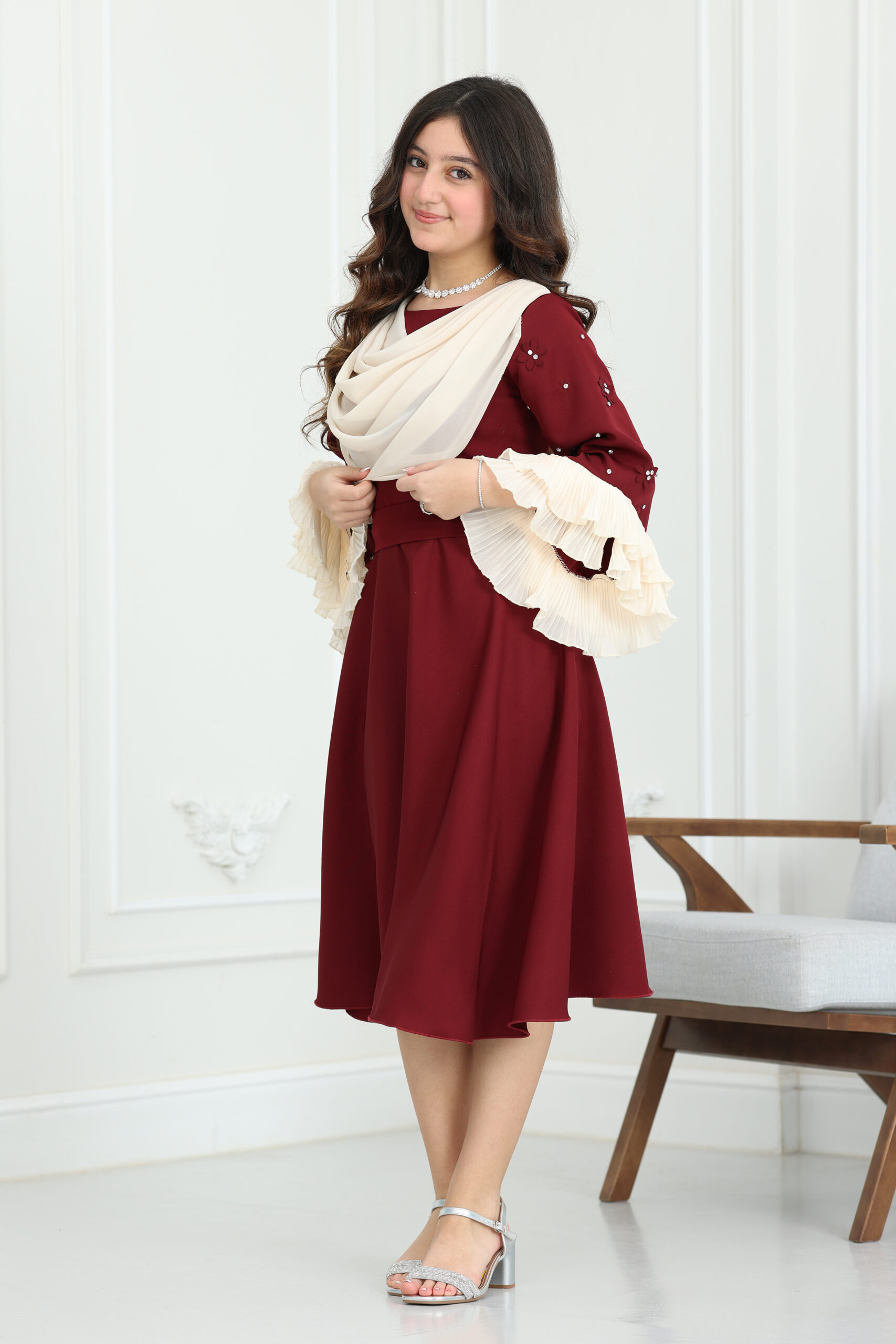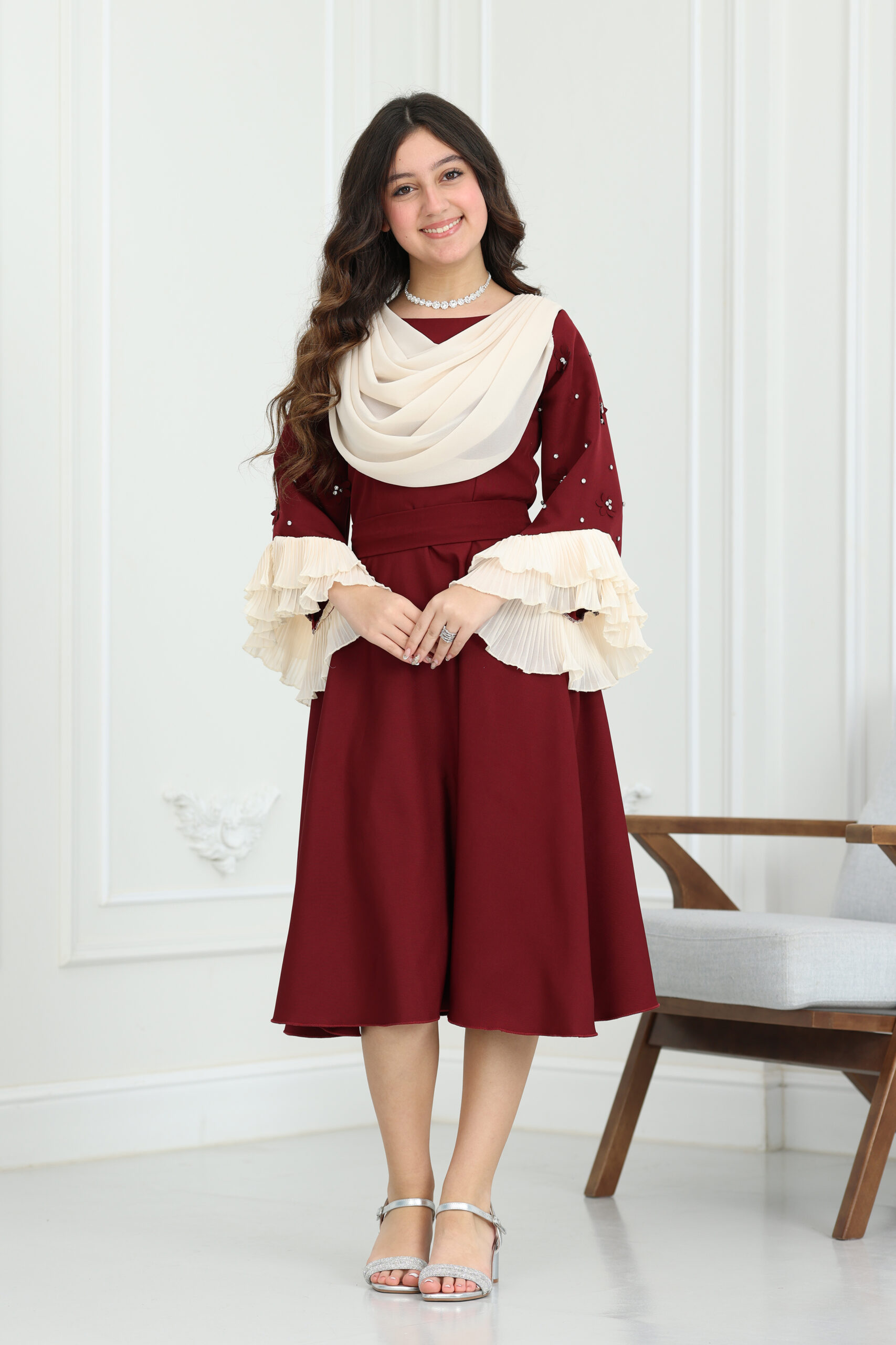 يتميز الفستان بقصة كلاسيكية واسعة من الأسفل تمنح البنت طابعاً انثوياً ساحراً، مع تفاصيل “درابيه” (Drapery) أنيقة تنسدل حول الرقبة والكتف لتعطي مظهراً غنياً وراقياً. الأكمام هي سر جمال الموديل، حيث تنتهي بكسرات (Pleats) واسعة ومنسقة بدقة تضفي حركة حيوية وفخامة مع كل إشارة. كما يتزين الفستان بتطريزات ناعمة من الكريستال والورود الصغيرة الموزعة بإتقان على الصدر والأكمام، مع حزام خصر يحدد القوام بجمالية فائقة وطول ميدي يتناسب مع ذوق المجتمع السعودي الراقي.
