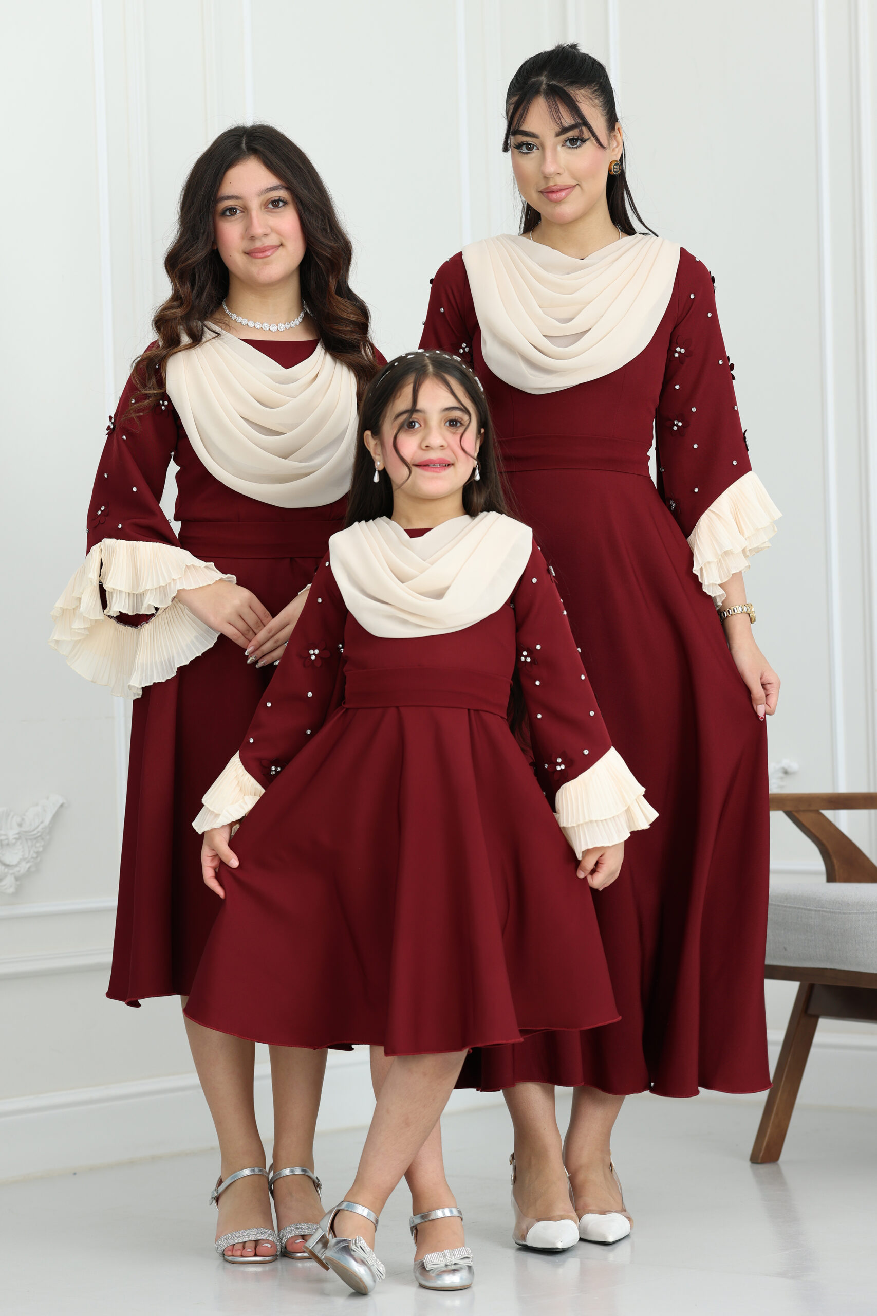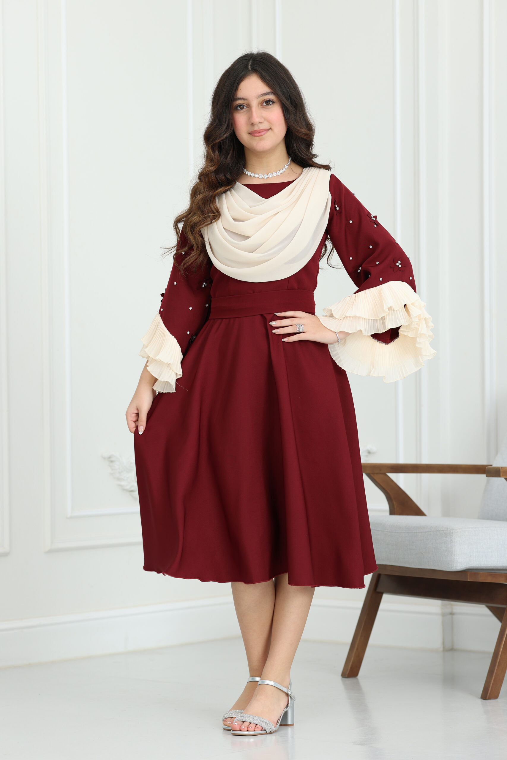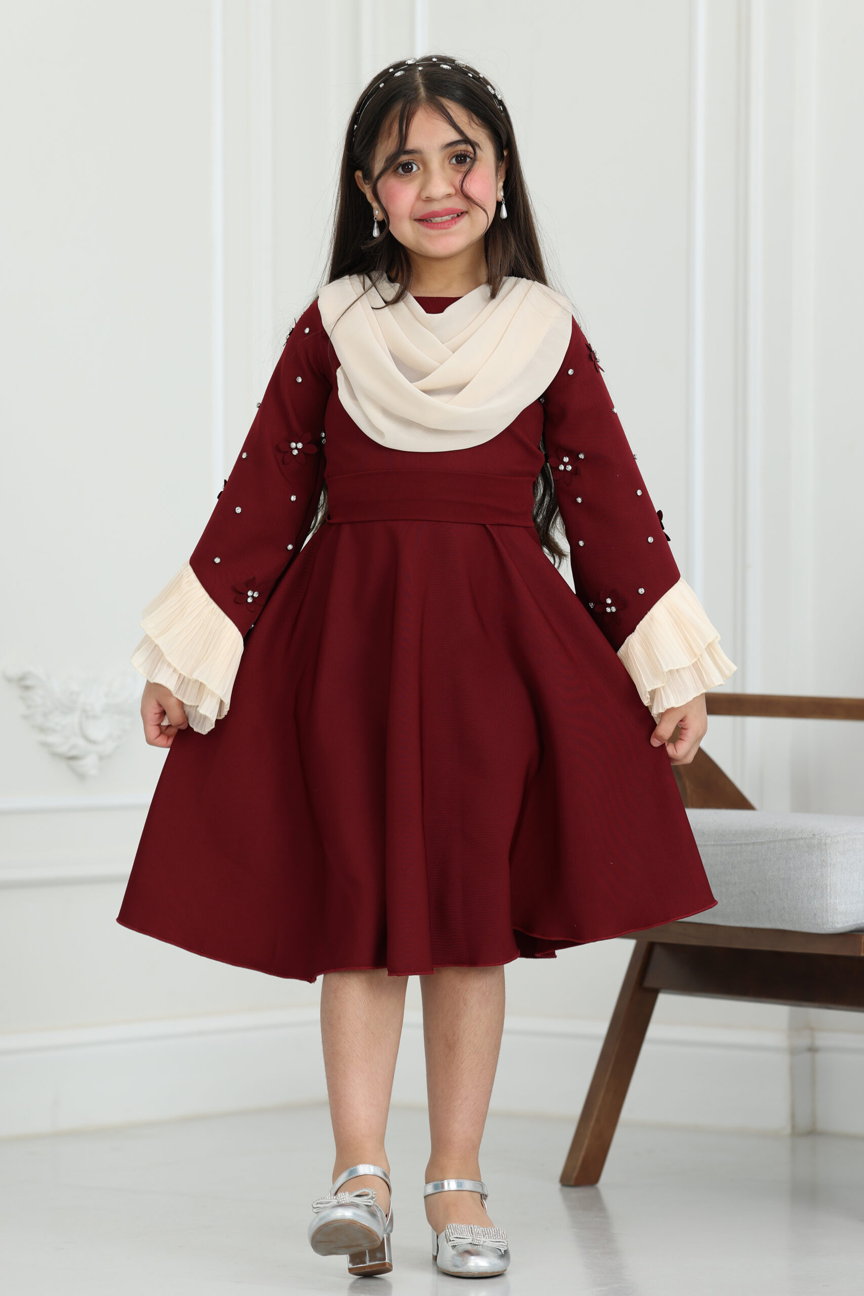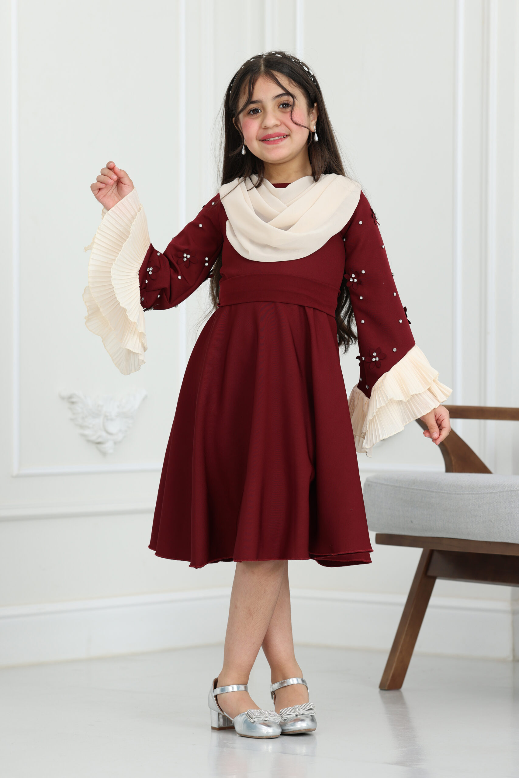 يتميز الفستان بقصة كلاسيكية واسعة من الأسفل تمنح البنت طابعاً انثوياً ساحراً، مع تفاصيل “درابيه” (Drapery) أنيقة تنسدل حول الرقبة والكتف لتعطي مظهراً غنياً وراقياً. الأكمام هي سر جمال الموديل، حيث تنتهي بكسرات (Pleats) واسعة ومنسقة بدقة تضفي حركة حيوية وفخامة مع كل إشارة. كما يتزين الفستان بتطريزات ناعمة من الكريستال والورود الصغيرة الموزعة بإتقان على الصدر والأكمام، مع حزام خصر يحدد القوام بجمالية فائقة وطول ميدي يتناسب مع ذوق المجتمع السعودي الراقي.