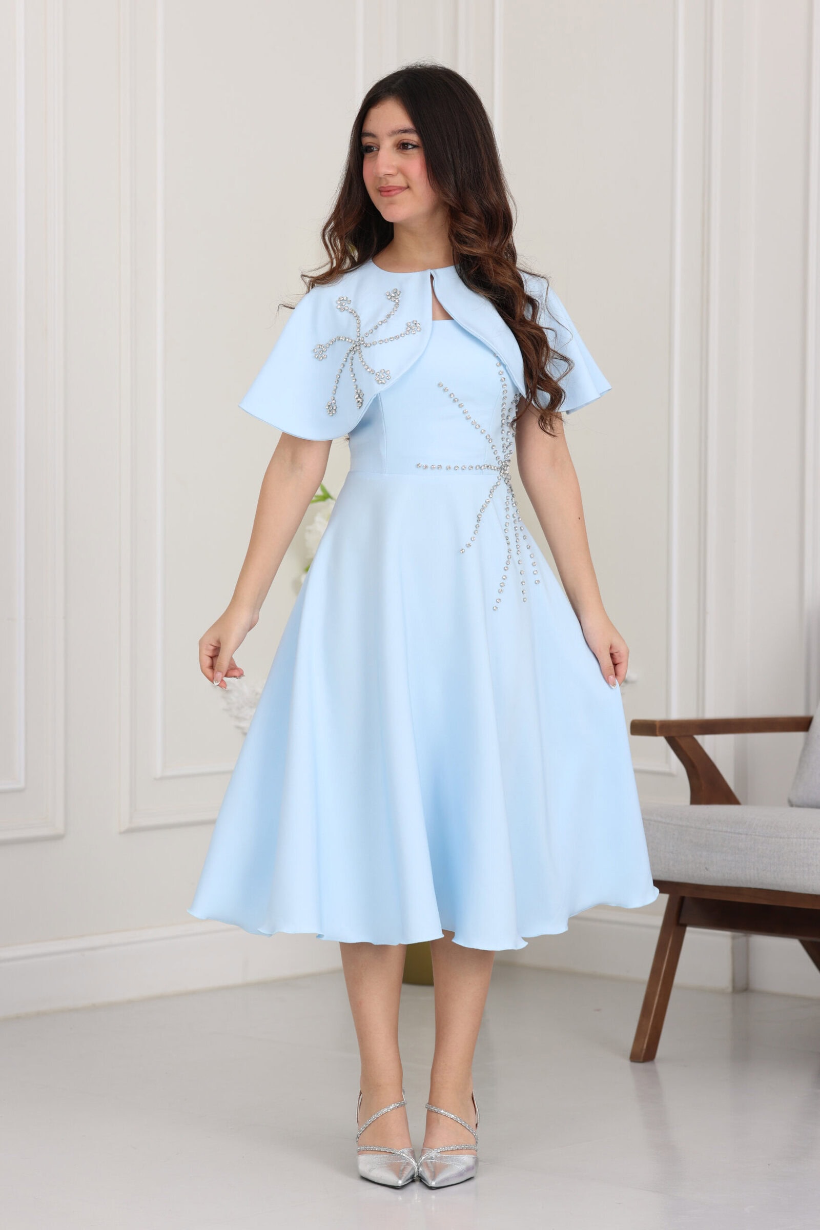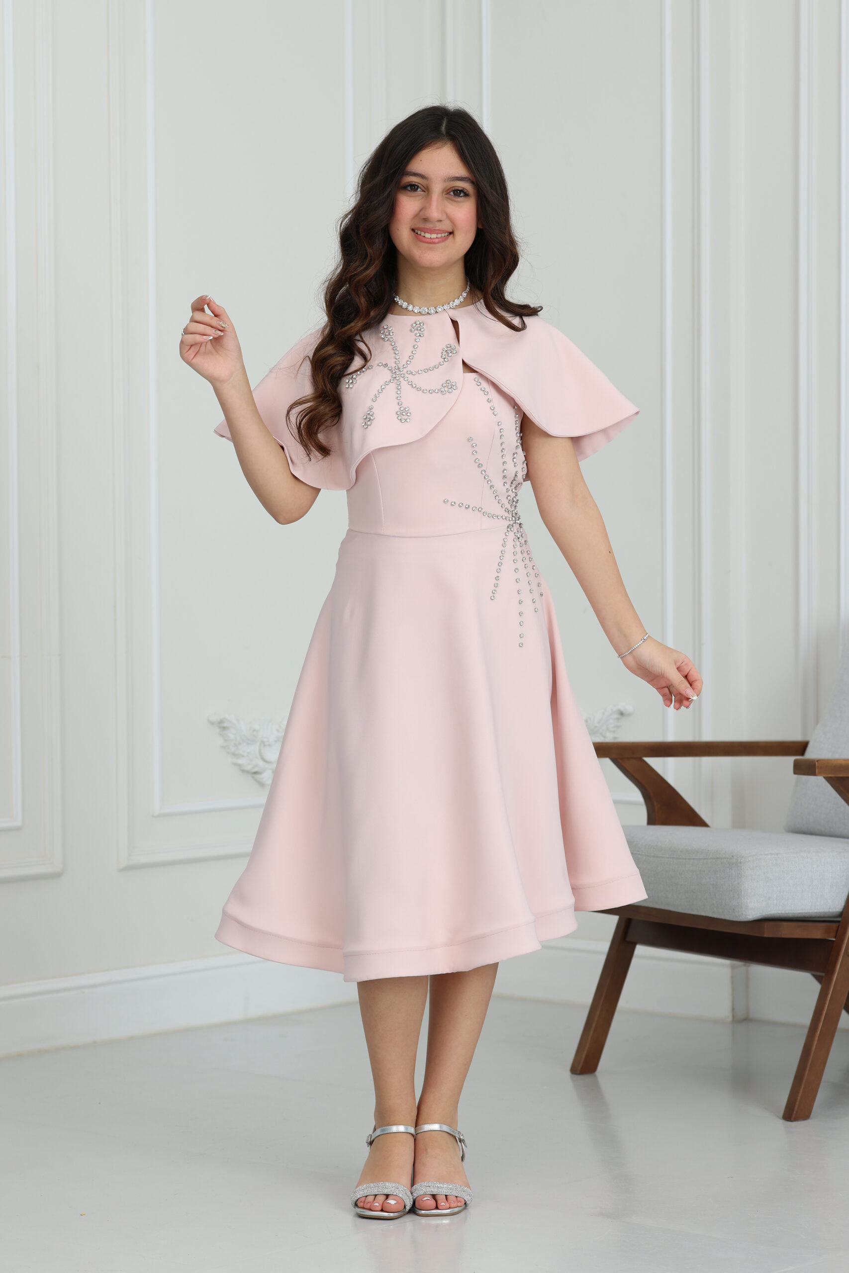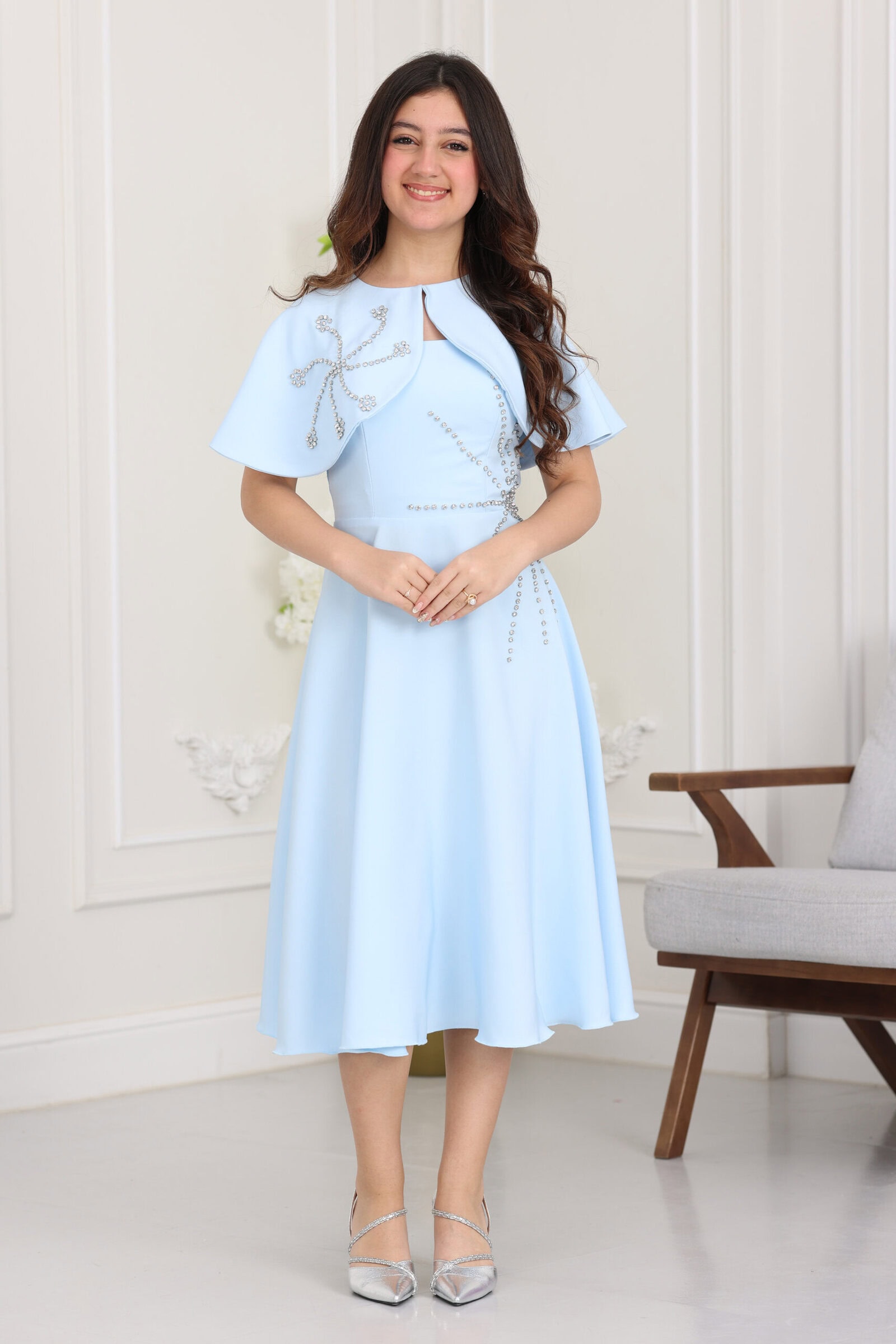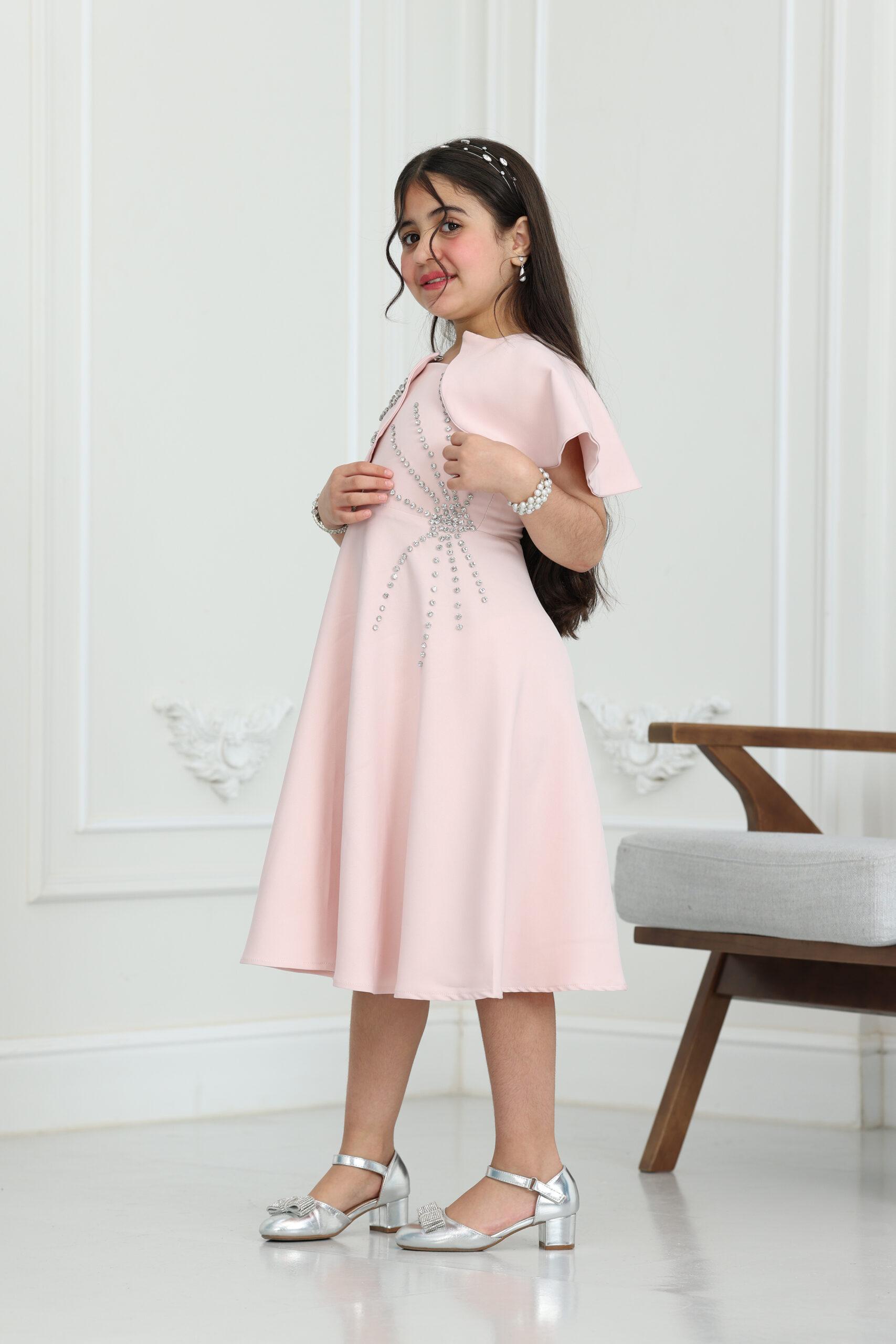 يتميز الفستان بتصميم عصري من قطعتين، الفستان الأساسي بقصة انسيابية مريحة، والجاكيت القصير يتميز بأكمام “باف” (Puff) قصيرة تمنح الموديل طابعاً فرنسياً راقياً. ما يميز هذا التصميم هو الشك اليدوي بقطع اللؤلؤ والكريستال اللامعة الموزعة بإتقان على كامل الجاكيت، مما يعطي بريقاً هادئاً وجذاباً. طول الفستان ميدي متناسق جداً، ويأتي مع حزام خصر يبرز جمال التصميم، مما يجعله قطعة لا غنى عنها في قائمة فساتين مناسبات لهذا العام.