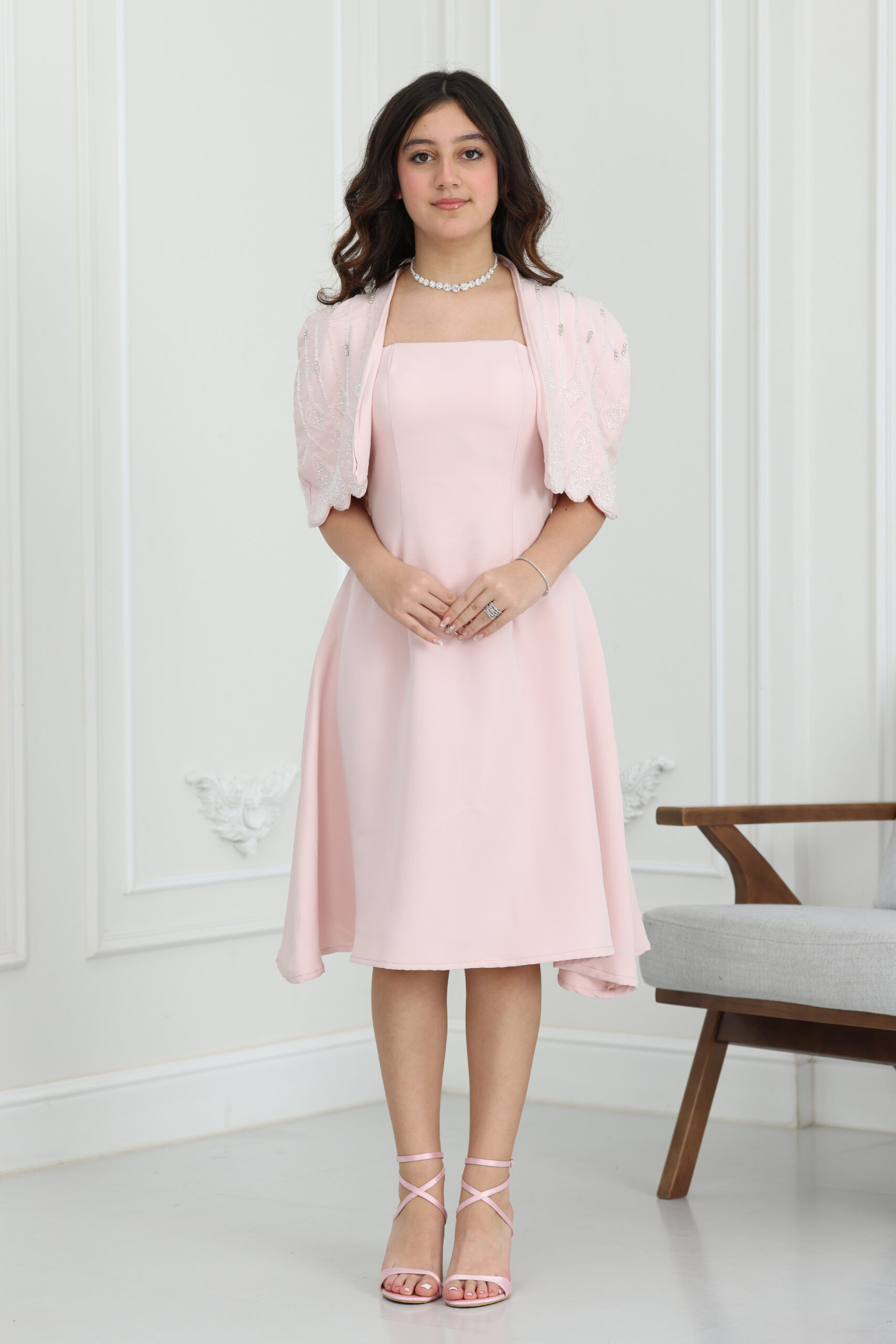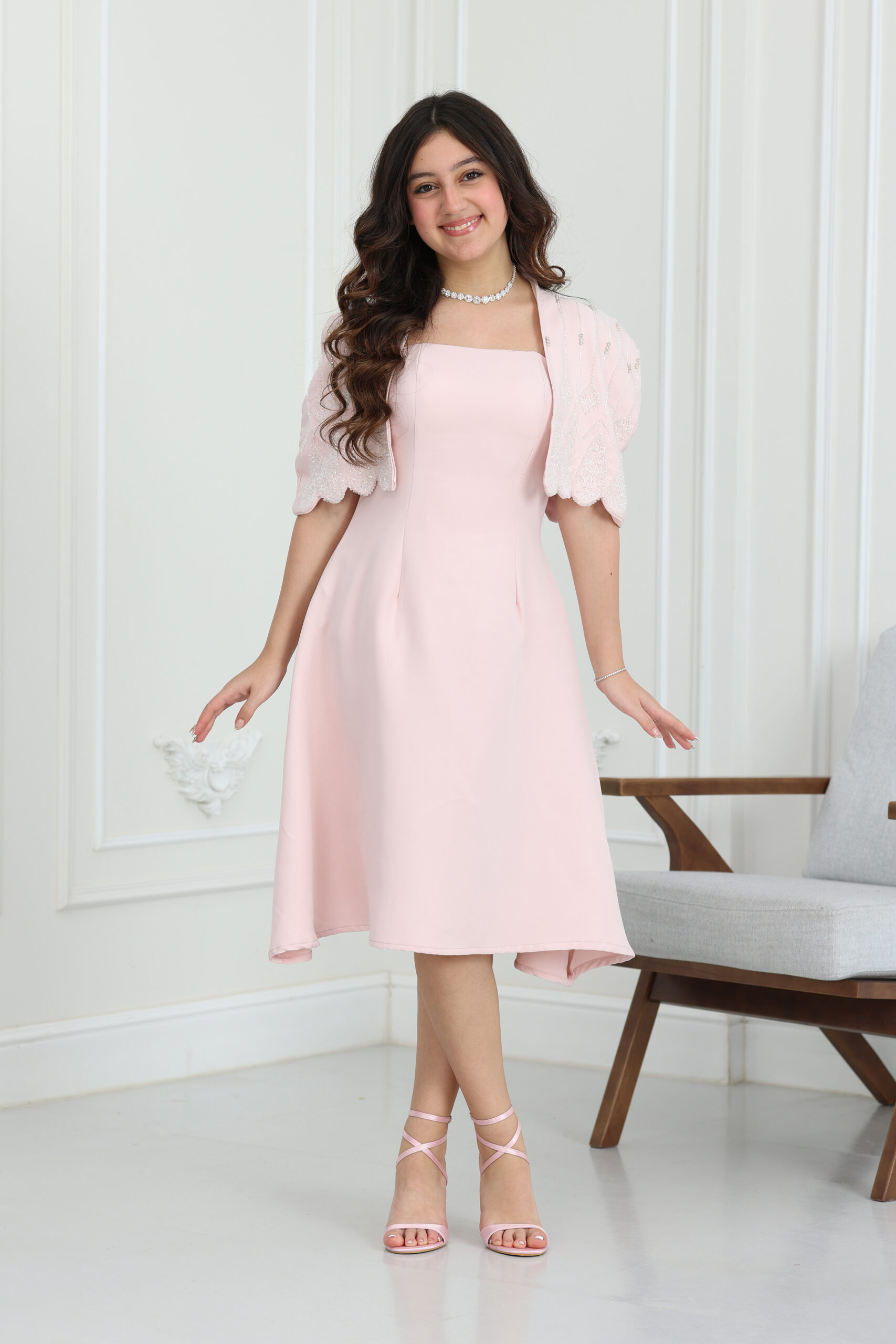 يتميز الفستان بتصميم عصري من قطعتين، الفستان الأساسي بقصة انسيابية مريحة، والجاكيت القصير يتميز بأكمام “باف” (Puff) قصيرة تمنح الموديل طابعاً فرنسياً راقياً. ما يميز هذا التصميم هو الشك اليدوي بقطع اللؤلؤ والكريستال اللامعة الموزعة بإتقان على كامل الجاكيت، مما يعطي بريقاً هادئاً وجذاباً. طول الفستان ميدي متناسق جداً، ويأتي مع حزام خصر يبرز جمال التصميم، مما يجعله قطعة لا غنى عنها في قائمة فساتين مناسبات لهذا العام.
