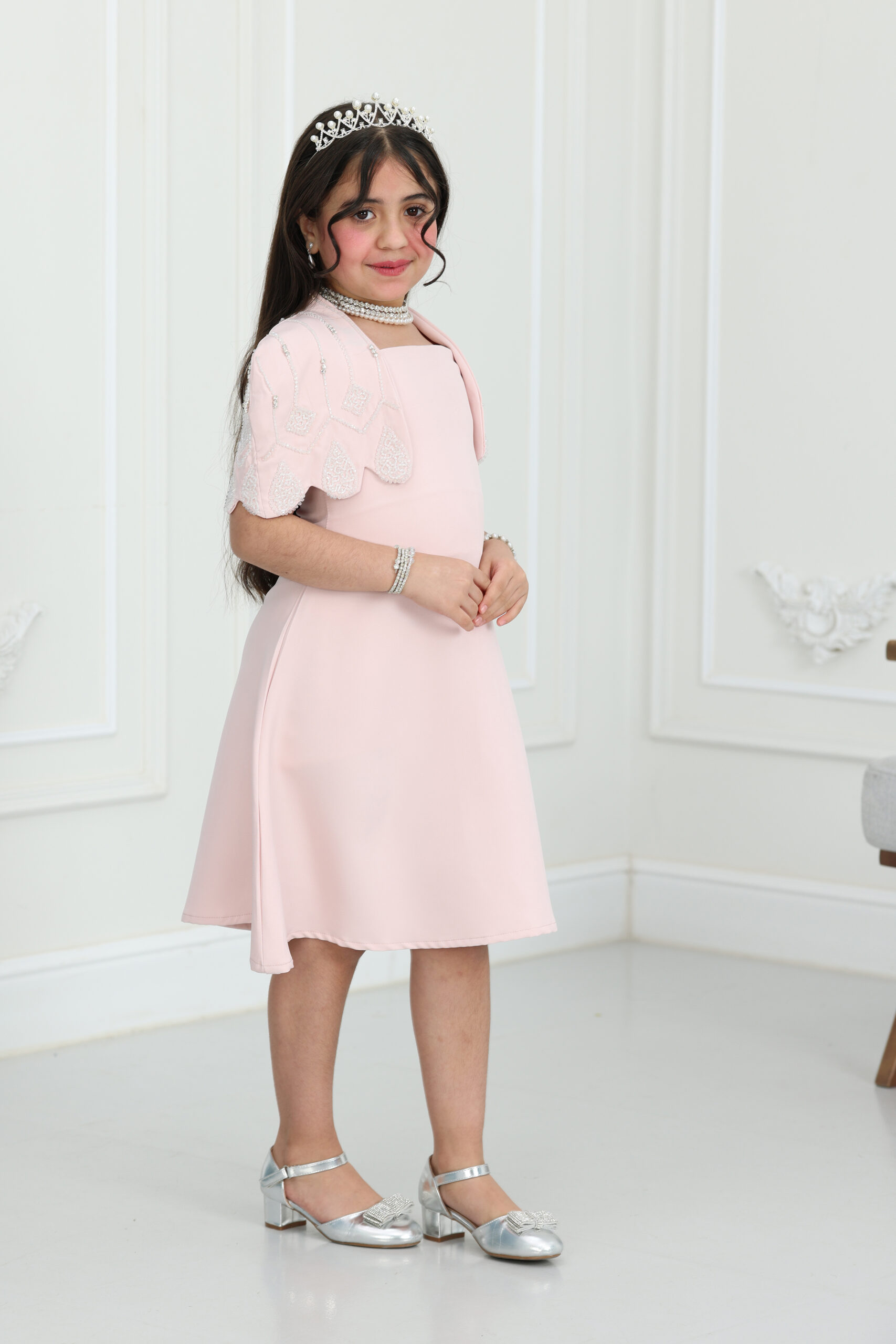 اعتمدنا في “المصمم الحديث” على خامة “كريب فاخر” تمتاز بنعومة الملمس وبرودة القماش، لضمان راحة البنت طوال اليوم. القماش ثقيل بما يكفي ليحافظ على شكل الفستان المنفوش، مع بطانة داخلية كاملة ناعمة تمنع الشفافية وتوفر حماية لبشرة الأطفال الحساسة. الجودة هنا تتحدث عن نفسها، من متانة الخياطة إلى ثبات حبات اللؤلؤ، لضمان استمرار القطعة بجمالها الأصلي حتى مع تكرار المناسبات، ليكون استثماراً رائعاً في خزانة طفلتك.