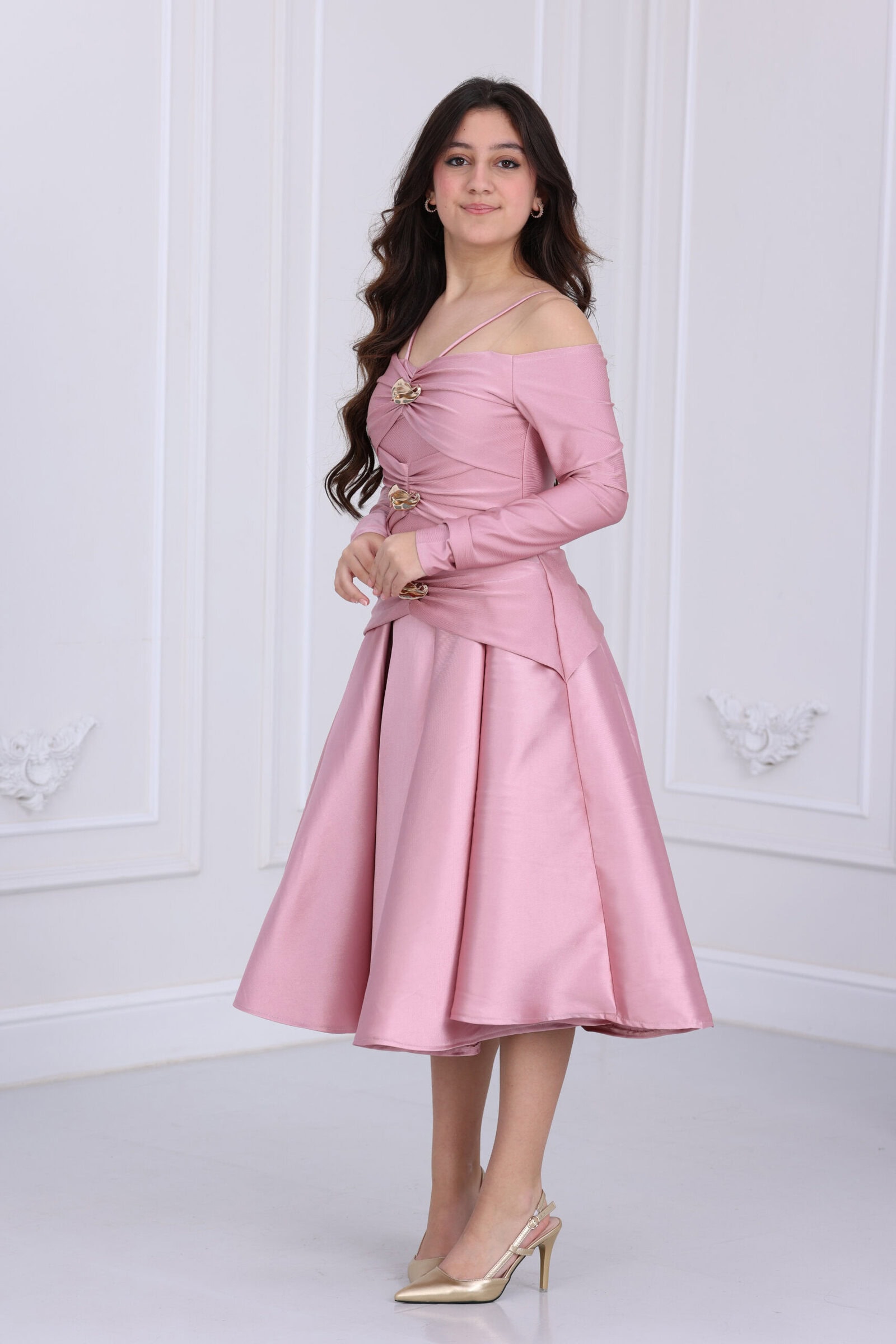 يتميز هذا الفستان بتصميم “” عصري مع حمالات رقيقة تضمن الثبات والراحة لطفلتك. الصدر مصمم بأسلوب “الدرابيه” أو الكسرات اليدوية المتداخلة التي تمنح القوام رشاقة وفخامة، ومزين بثلاث قطع إكسسوار معدنية فاخرة على شكل فراشات ذهبية تلمع ببريق ساحر في المنتصف. التنورة تأتي بقصة “كلوش” واسعة تعطي بنوتتك حركة انسيابية ومنفوشة بجمال عند المشي أو اللعب، مع وجود كشكشة “درابيه” إضافية عند الخصر تزيد من تميز الموديل، وطول ميدي متناسق يجمع بين العملية وفخامة فساتين السهرة الكبرى.