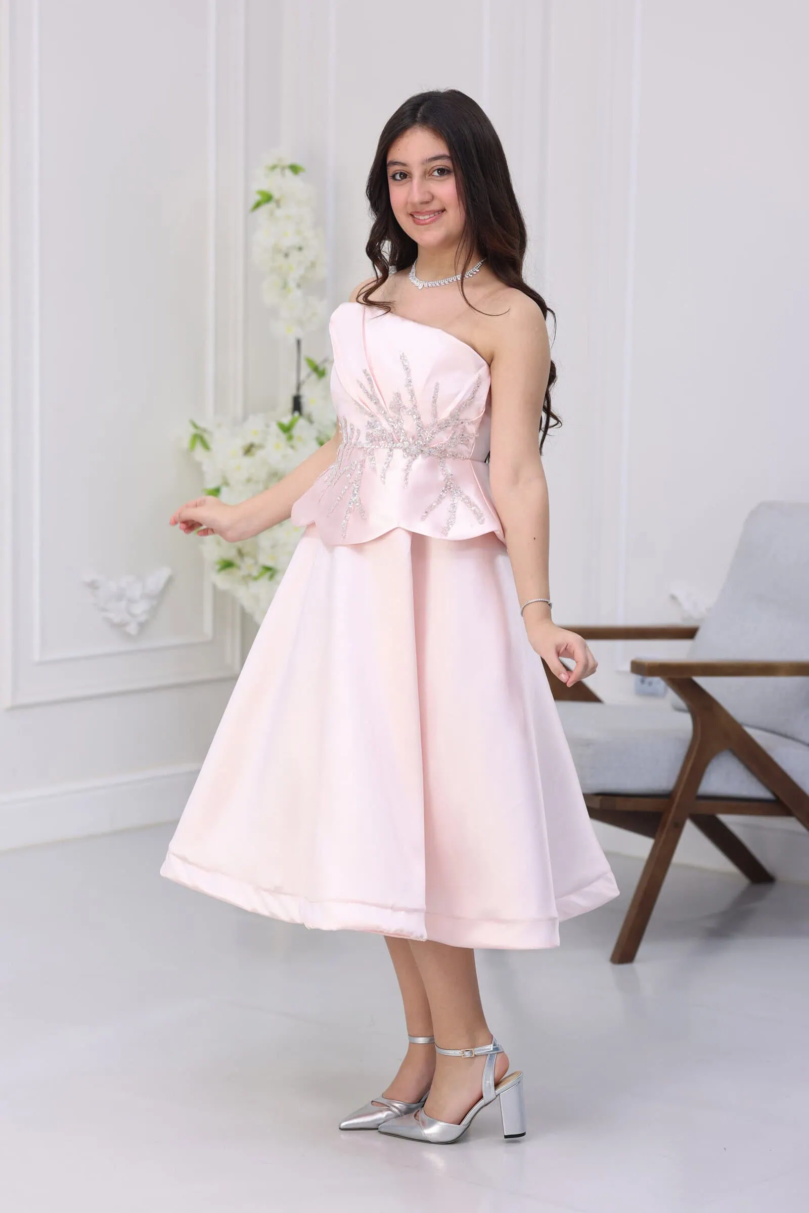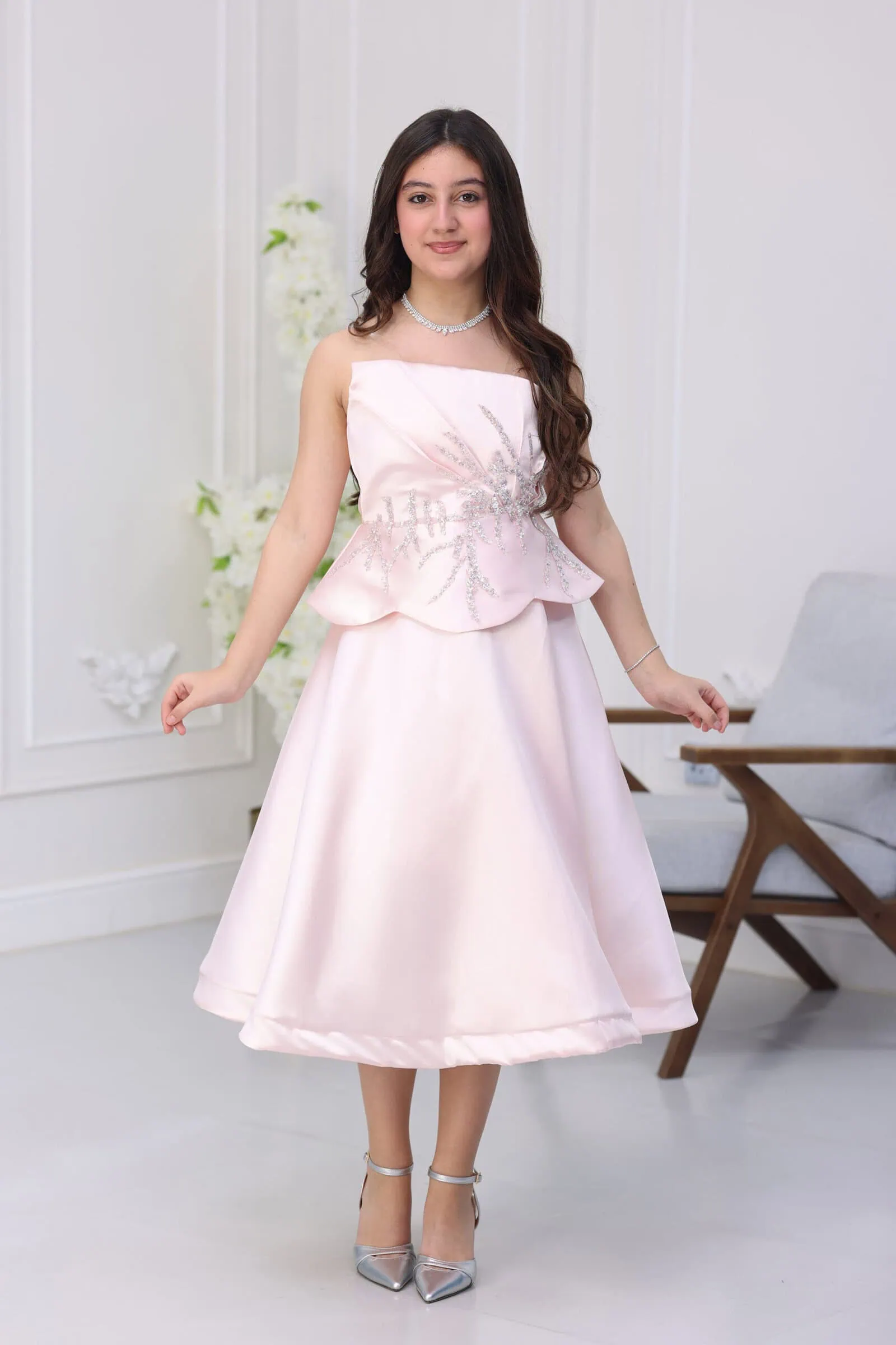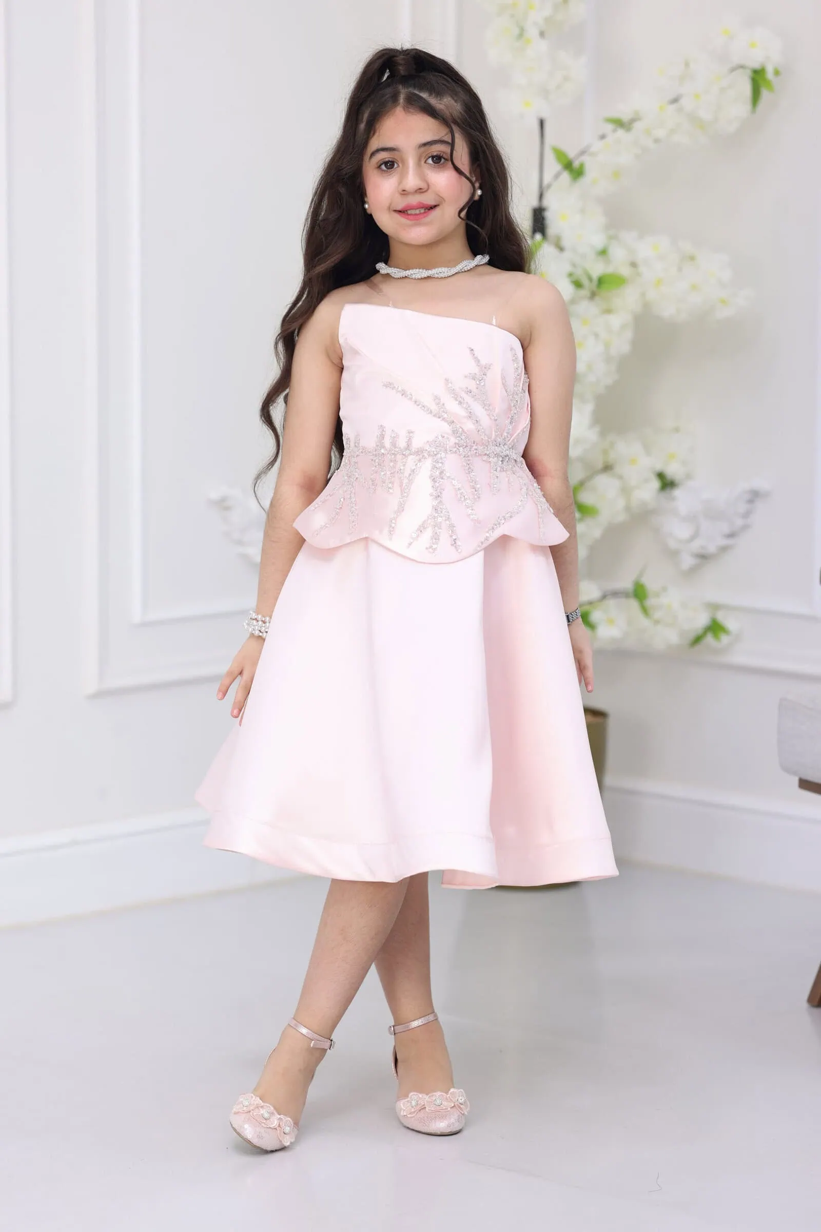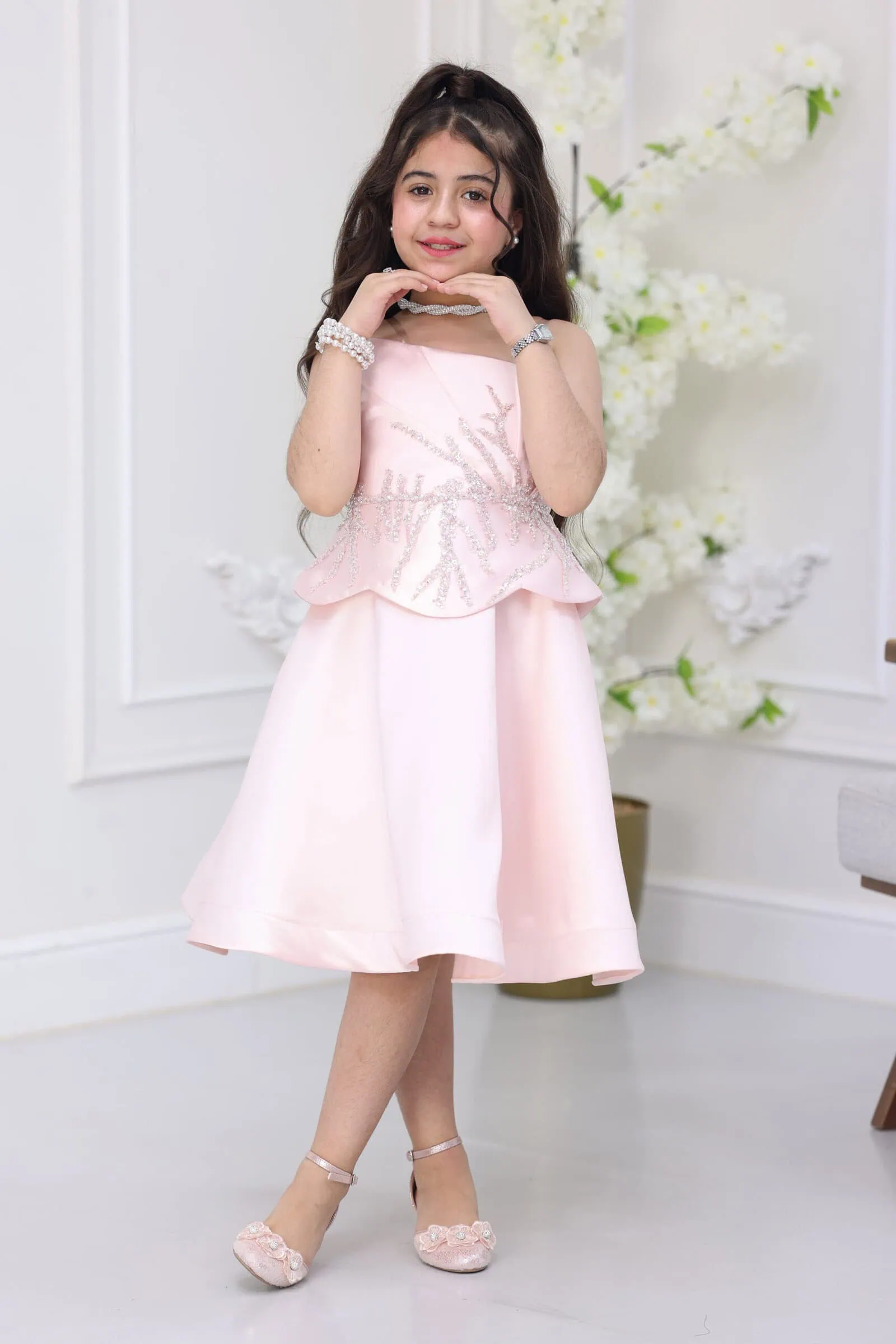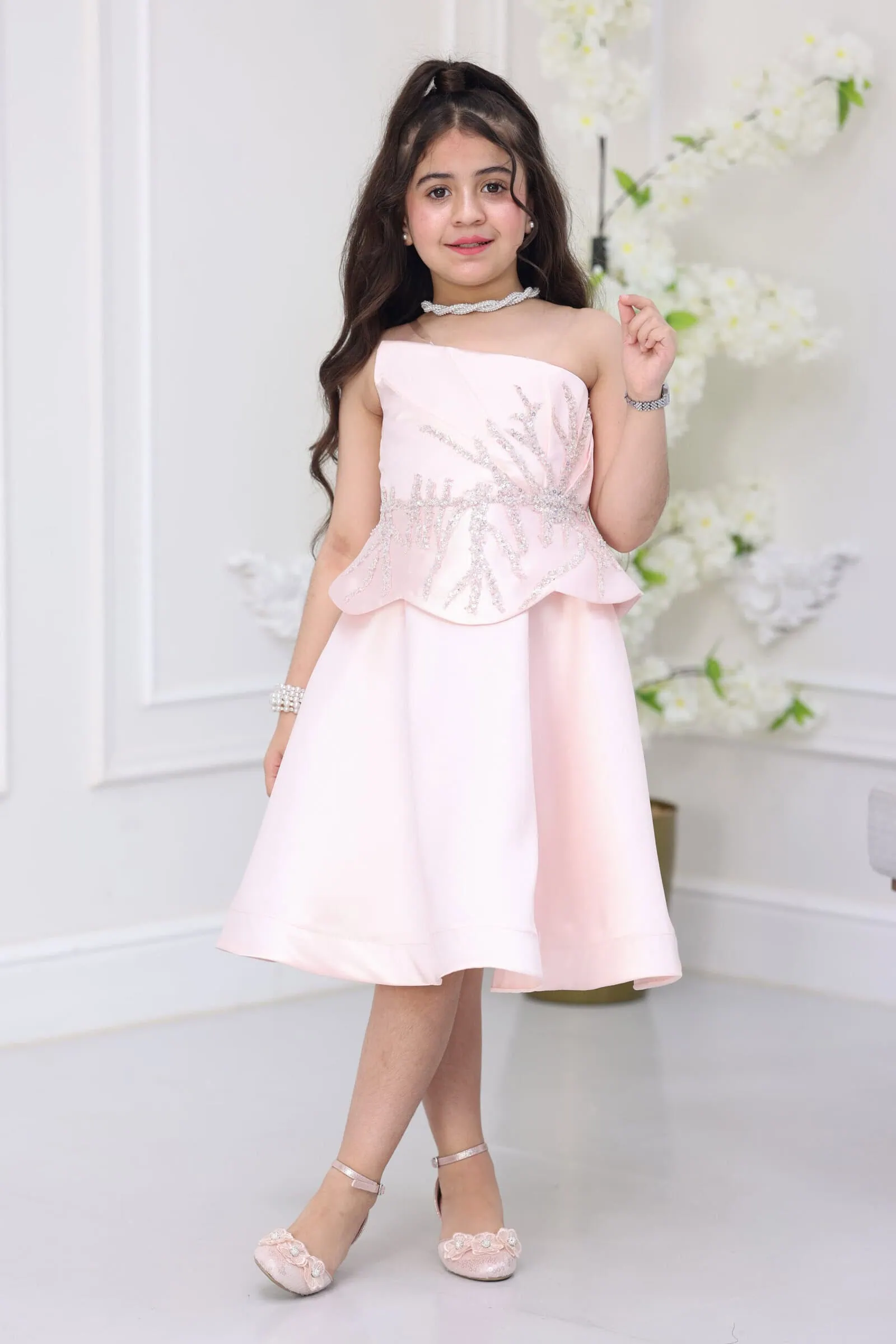 يتميز الفستان بقصة “توب” بدون أكمام لسهولة الحركة، مع تطريز يدوي ساحر على الصدر يمتد حتى الخصر بشكل أغصان شجر براقة. الموديل مزود بكسرات أنيقة “بيبلوم” تعطي شكلاً منفوشاً وجميلاً، مع طول ميدي (Midi) يجمع بين الرسمية وحيوية الأطفال، مما يجعله الخيار الأول للأمهات اللواتي يبحثن عن الرقي لأطفالهم.