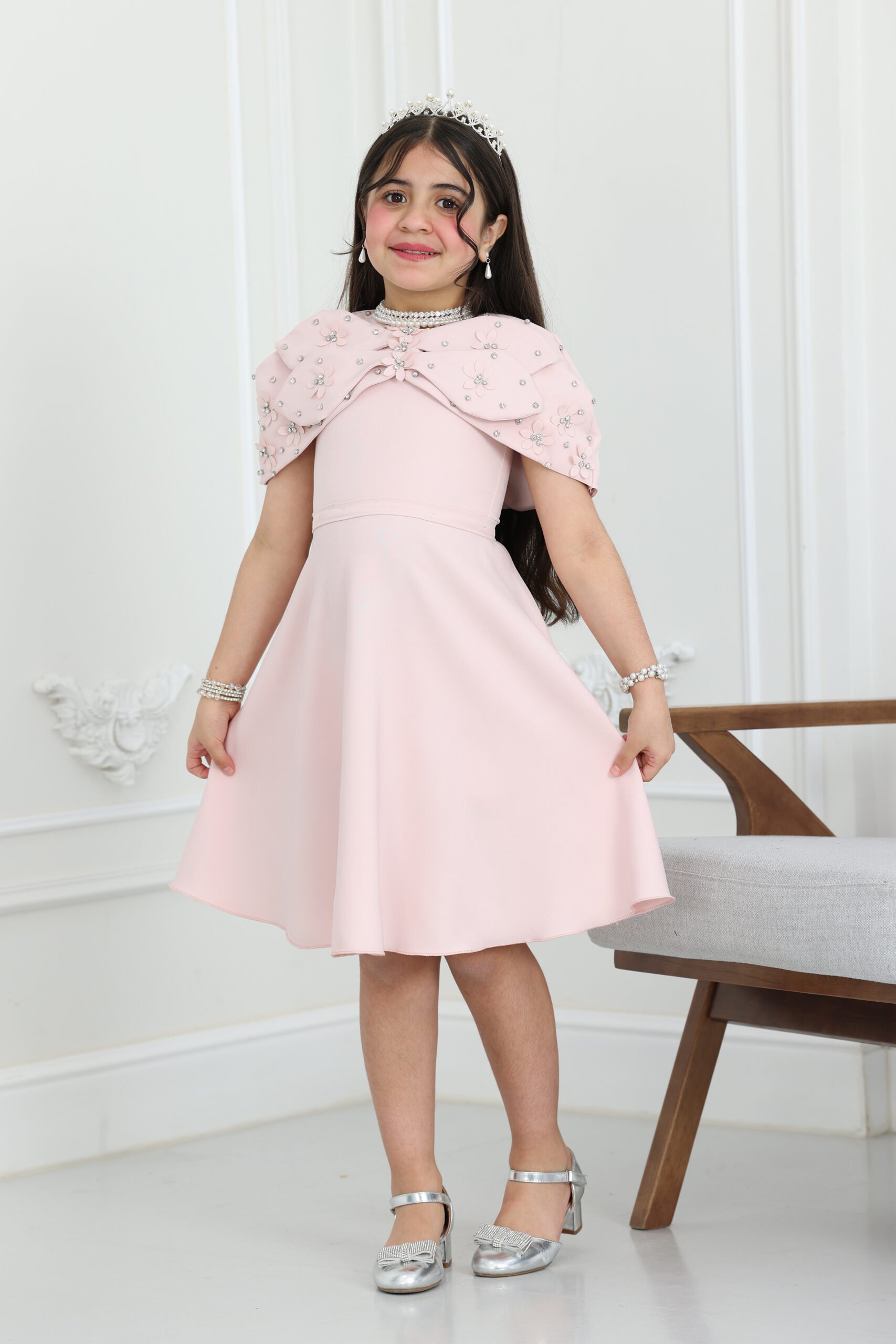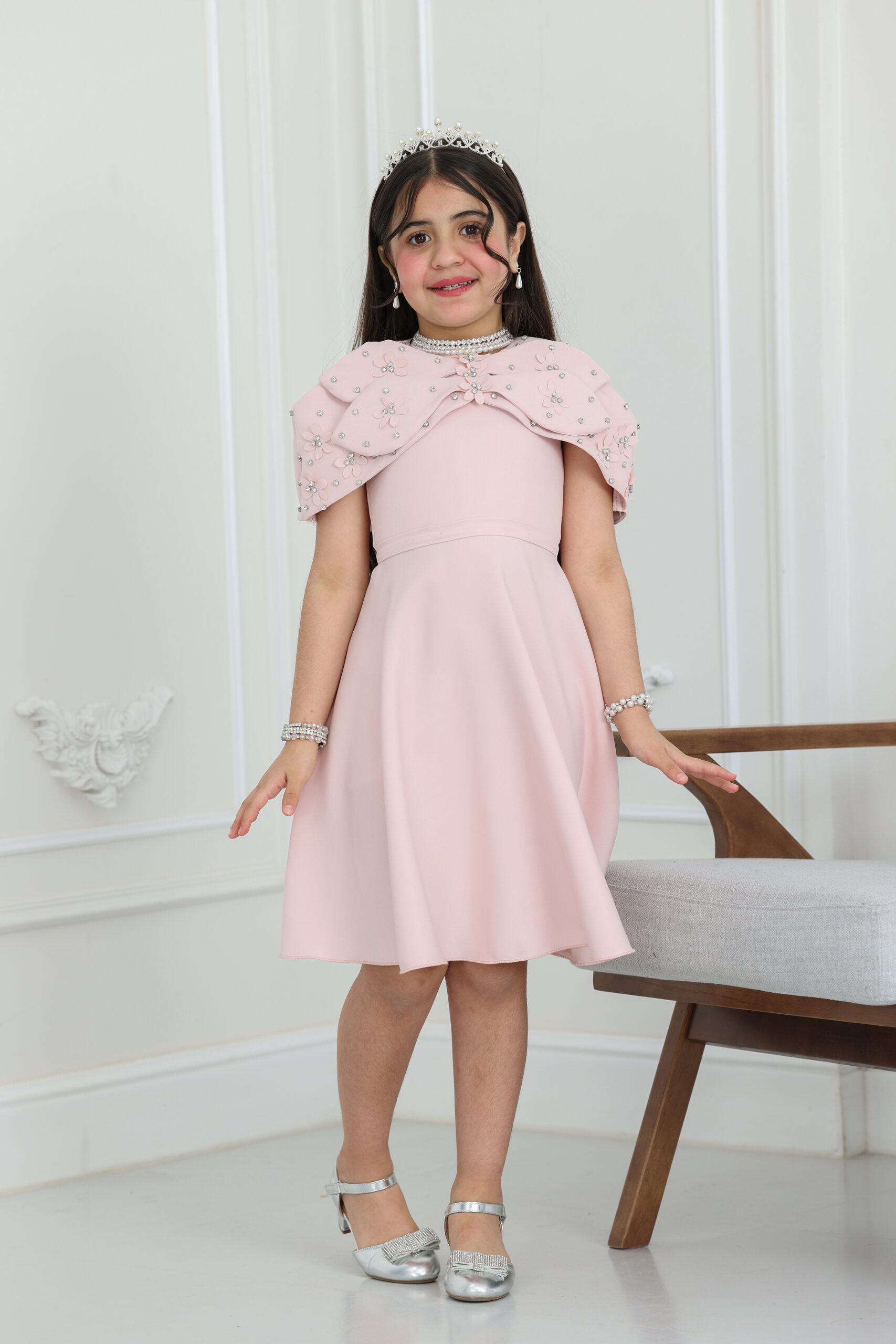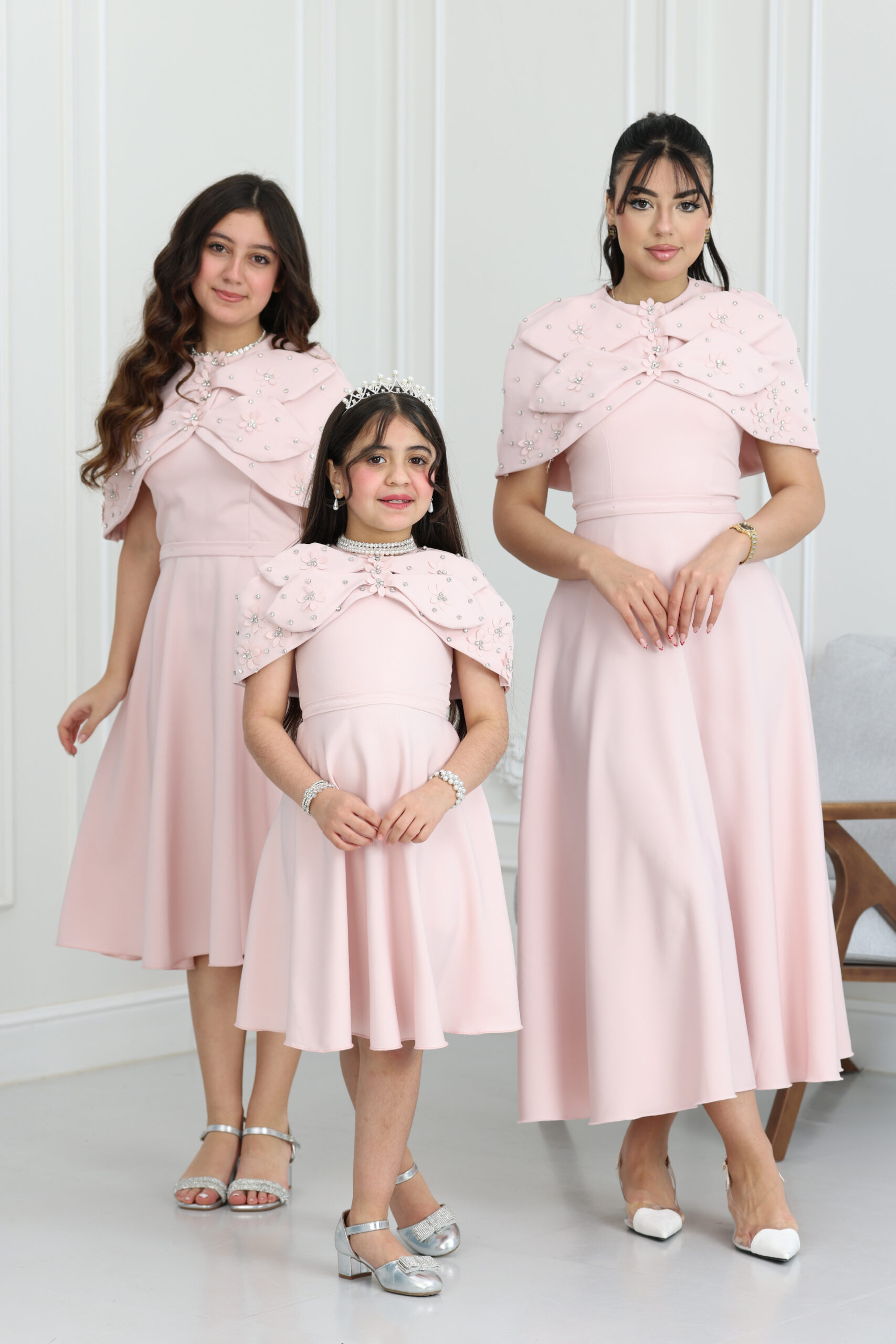 يتميز الفستان بقصة “A-line” انسيابية وراقية، ومزود بقطعة علوية “بوليرو” (Bolero) متميزة بتصميم الفيونكة الكبيرة والمزينة بورود مشغولة يدوياً ومرصعة بالكريستال اللامع. الجاكيت القصير يعطي طابع ملكي للفستان ويسمح بحرية الحركة للبنت، مع طول ميدي مثالي يمنحها هيبة ووقار. الموديل يتوفر منه مقاسات متطابقة للأم والبنت لطلة متناغمة ومثالية للصور والذكريات الجميلة في كل حفلة.