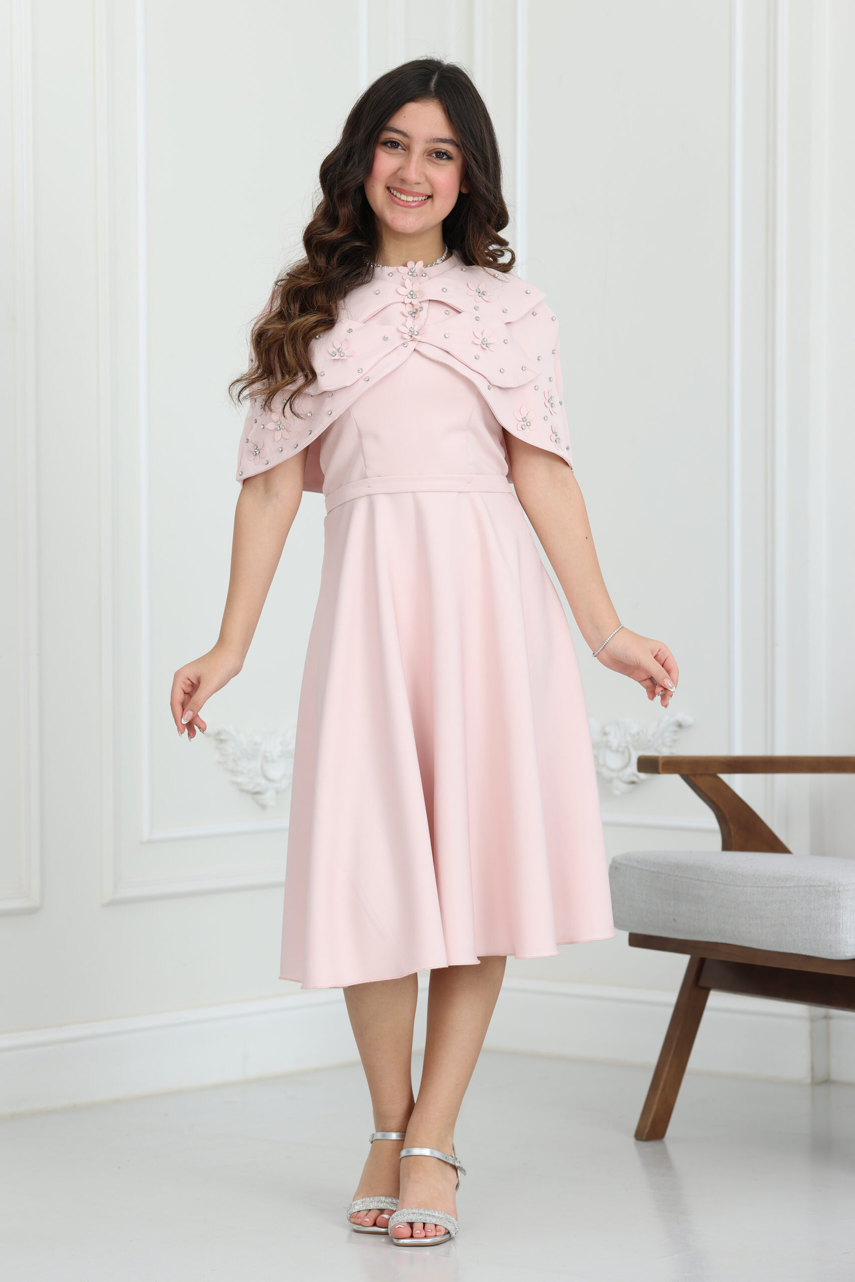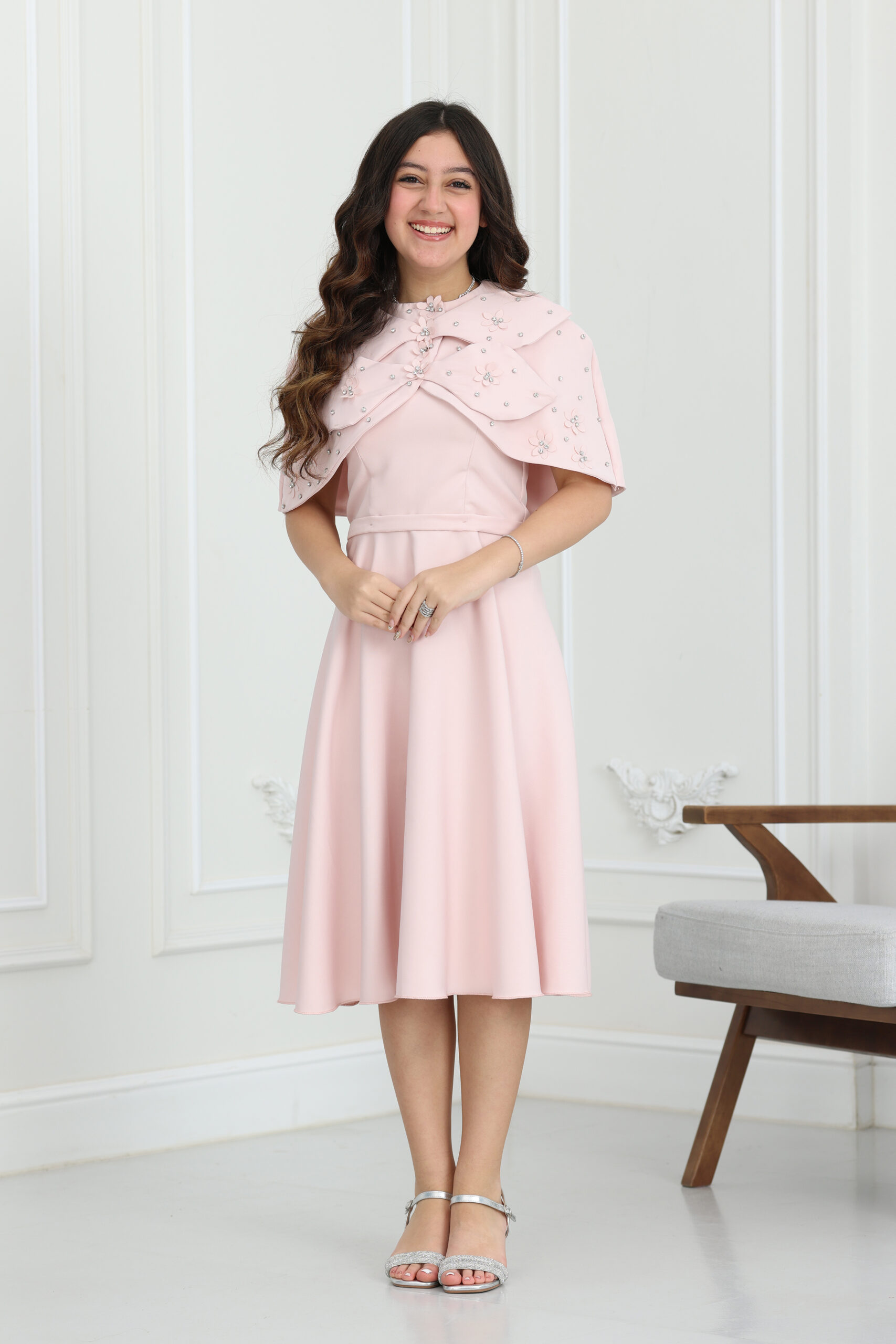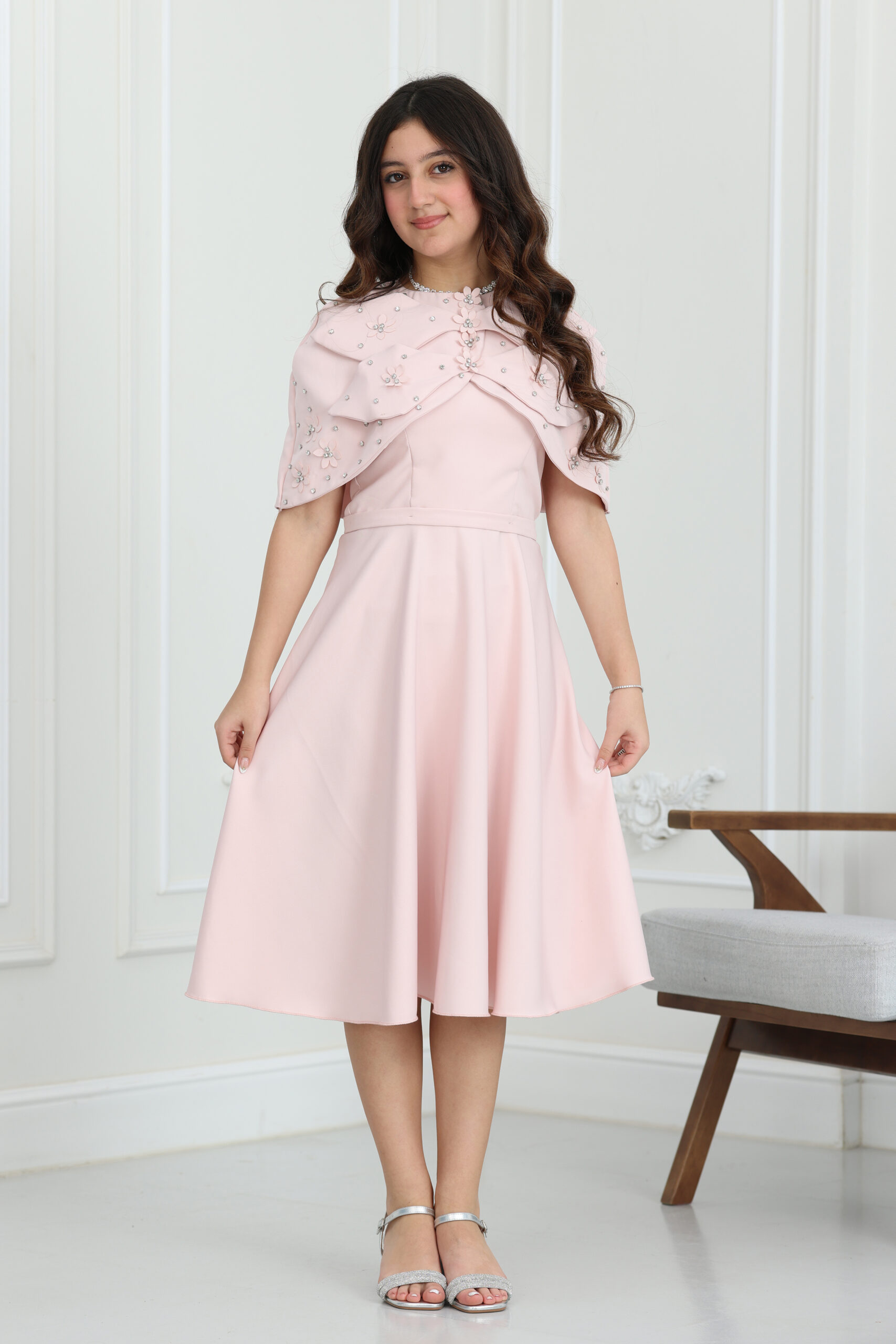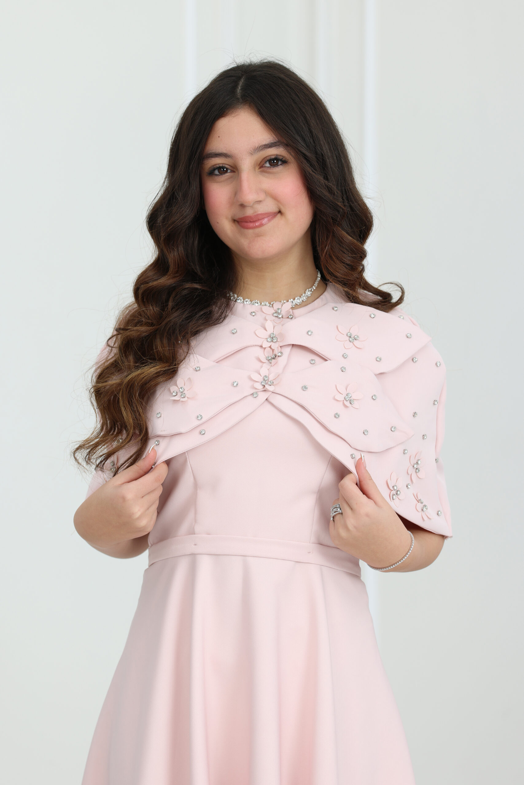 يتميز الفستان بقصة “A-line” انسيابية وراقية، ومزود بقطعة علوية “بوليرو” (Bolero) متميزة بتصميم الفيونكة الكبيرة والمزينة بورود مشغولة يدوياً ومرصعة بالكريستال اللامع. الجاكيت القصير يعطي طابع ملكي للفستان ويسمح بحرية الحركة للبنت، مع طول ميدي مثالي يمنحها هيبة ووقار. الموديل يتوفر منه مقاسات متطابقة للأم والبنت لطلة متناغمة ومثالية للصور والذكريات الجميلة في كل حفلة.