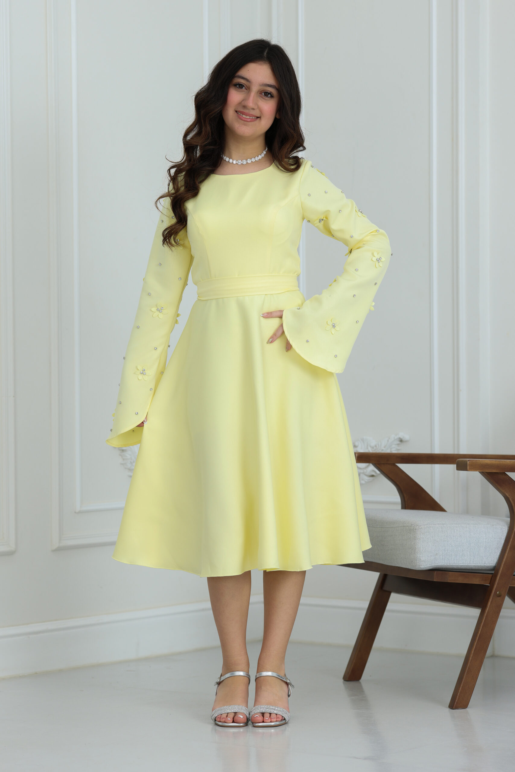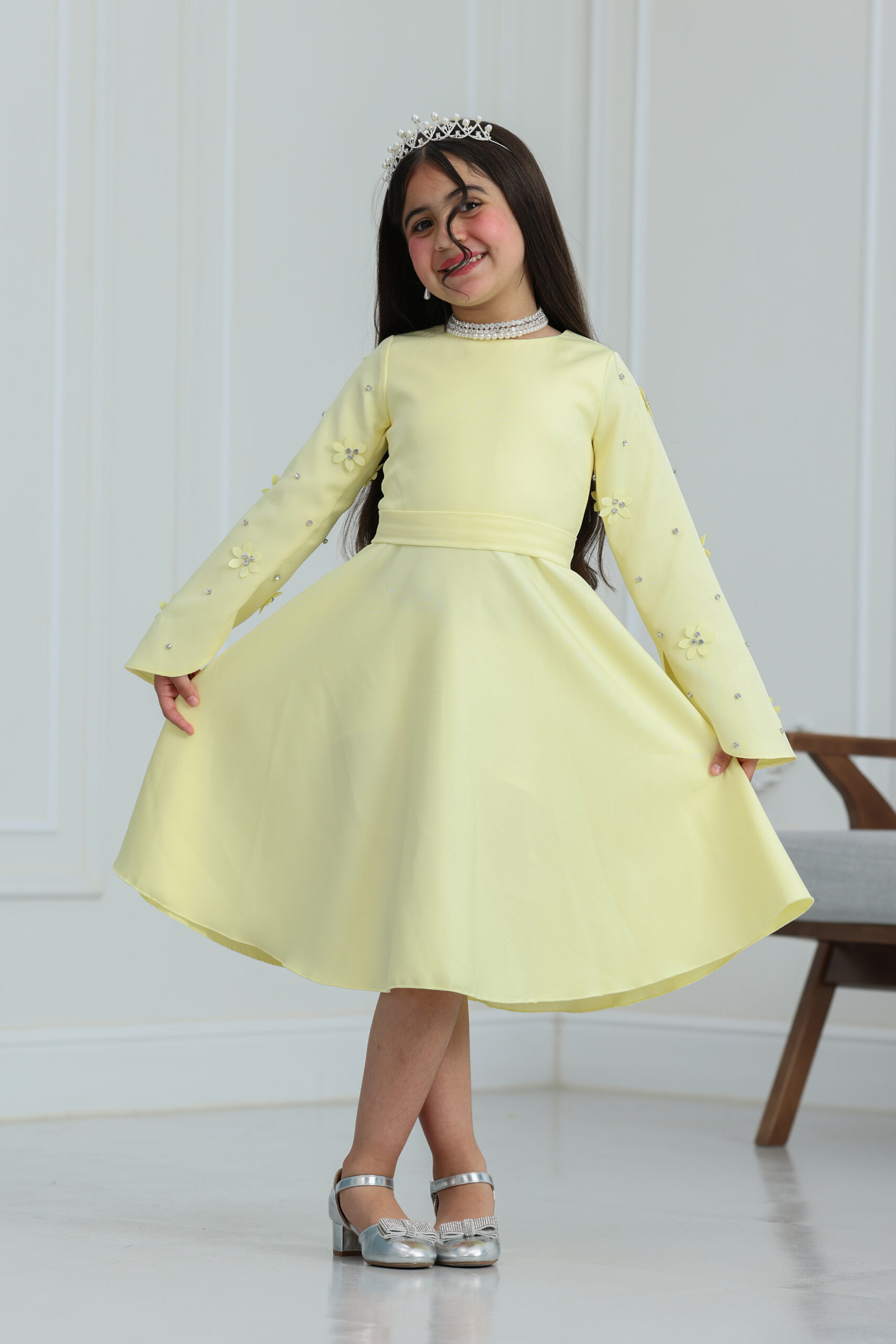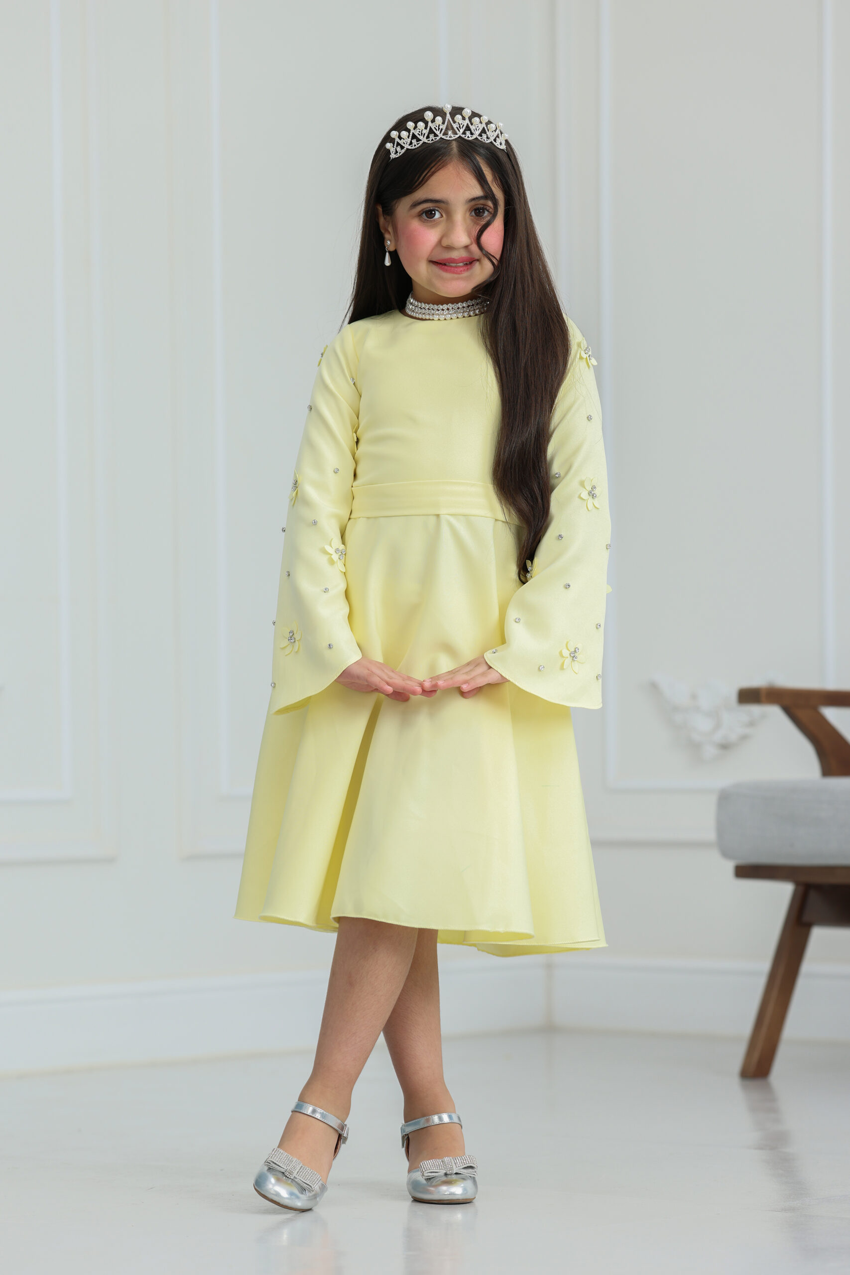 الفستان يجي بتصميم كلاسيكي راقي وقصة انسيابية مريحة تسمح للبنت بالحركة واللعب بكل ثقة. يتميز بياقة أنيقة على شكل حرف V ممتدة، ومزين بأزرار لؤلؤية فخمة تضفي لمسة من الرقي الكلاسيكي. الأكمام الطويلة مصنوعة من الدانتيل المشغول بنقوش دقيقة تنتهي بزمّة ناعمة عند المعصم لتعطي طابعاً فرنسياً جذاباً. الفستان مزود بحزام خصر ثابت يبرز جمال التصميم ويجعله متناسقاً تماماً كأجمل فساتين سهرة للأطفال، مع طول ميدي يتناسب مع ذوق المجتمع السعودي الراقي.
