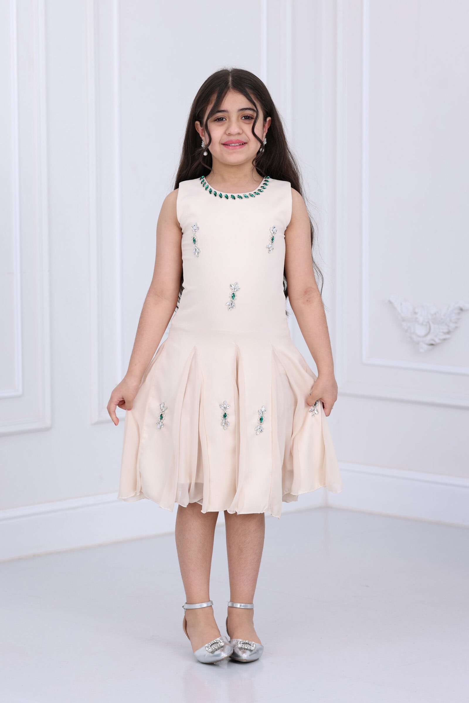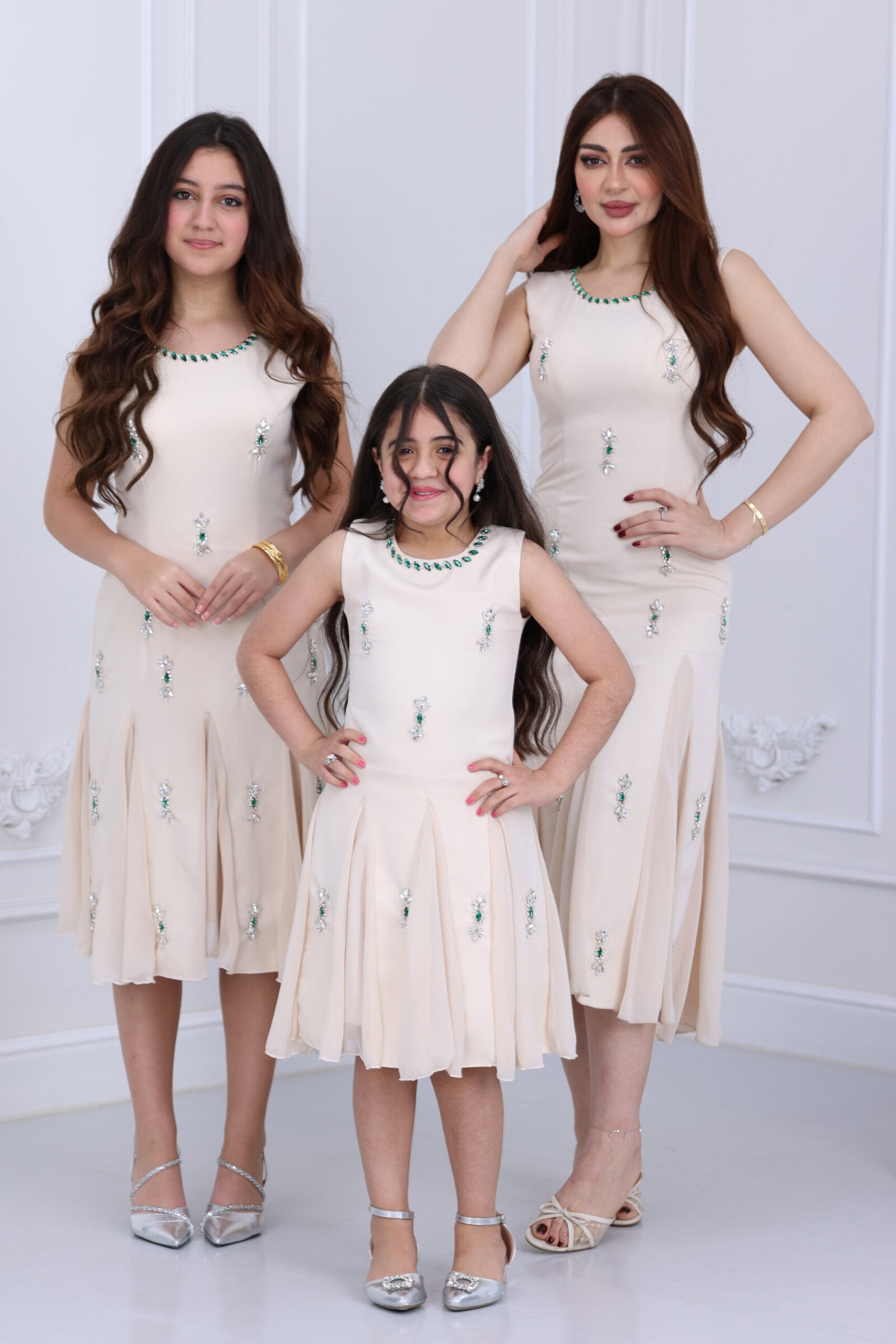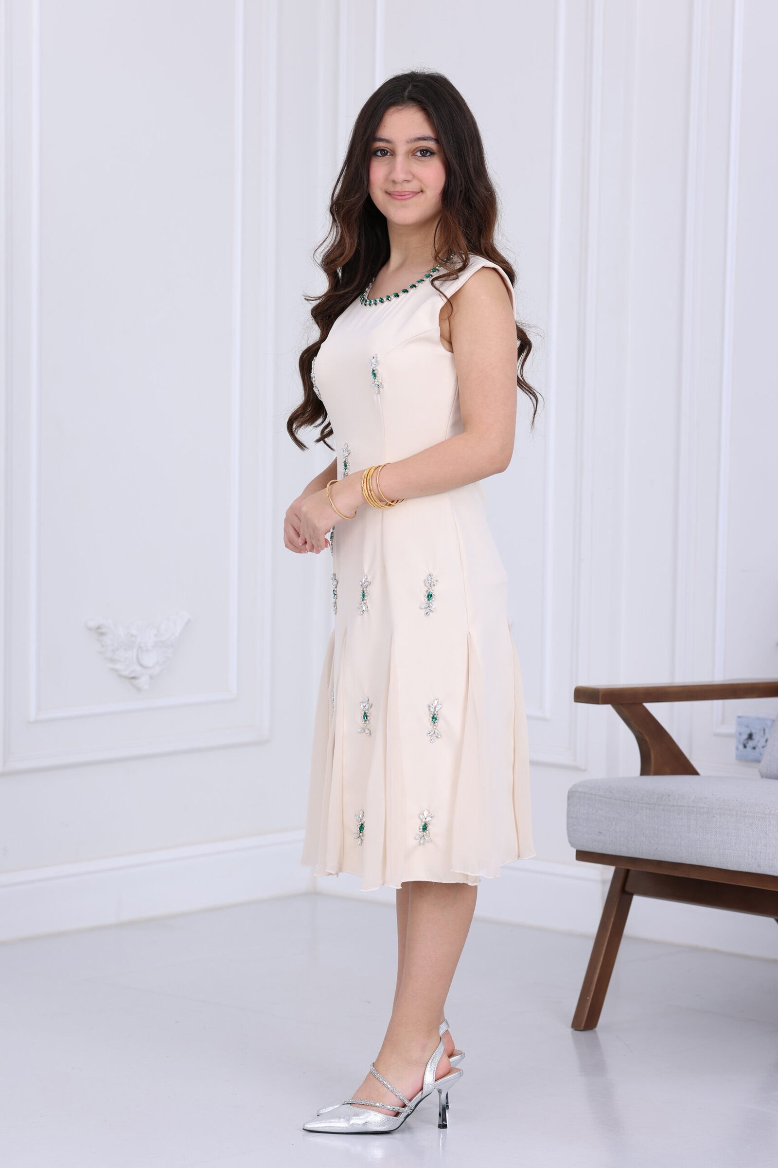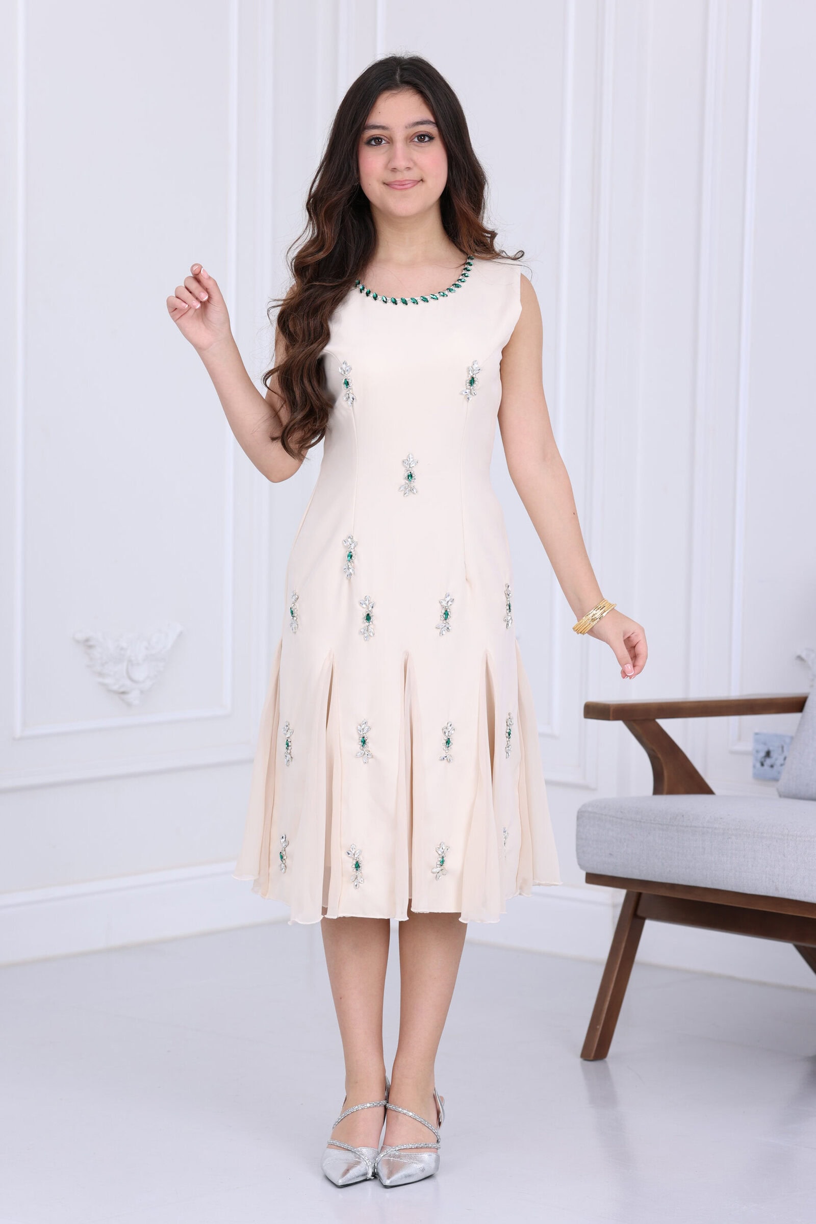 يتميز الفستان بقصة “ميدي” شبابية راقية، وبدون أكمام لتمنحكِ حرية تامة في الحركة وشعوراً بالخفة. ما يميز هذا التصميم هو الذيل المبتكر بقصة “البليسيه” (Pleats) المدمجة بطريقة فنية تعطي حجماً وحركة ملكية عند المشي. الفستان مزين بياقة دائرية مشغولة بالكريستال الأخضر، مع توزيع دقيق للشك اليدوي على طول الفستان ليزيد من فخامته بأسلوب مودرن وجذاب، مما يجعله قطعة لا غنى عنها في قائمة فساتين مناسبات لهذا العام.