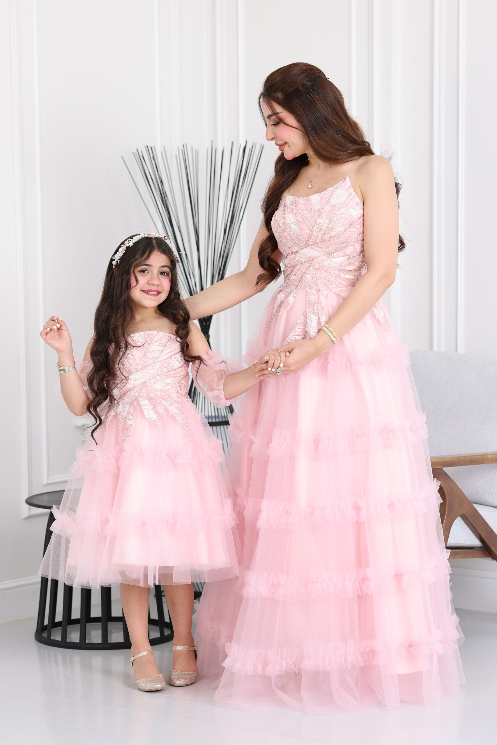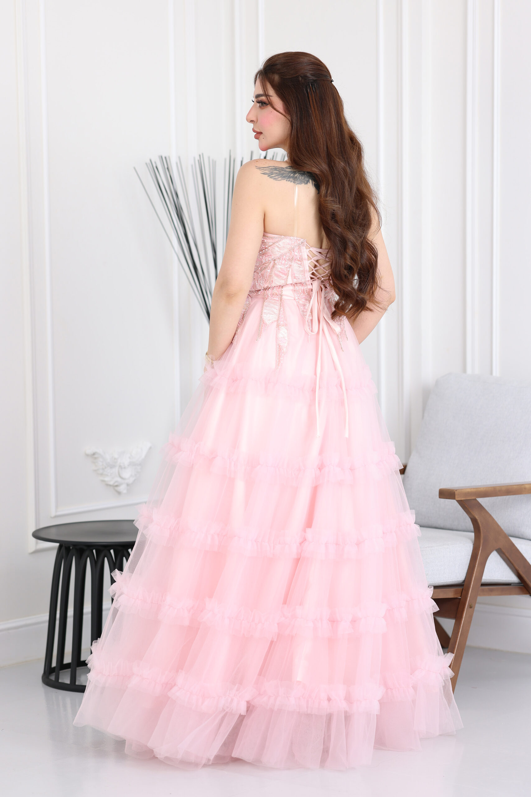 فستان تل مطرز منفوش هو الخيار المثالي لكل سيدة تبحث عن الطلّة الملكية والفخامة في حفلات الخطوبة والمناسبات الكبيرة في المملكة العربية السعودية التصميم يركز على الأنوثة والرقي. يتميز الفستان بـ قصة كتف واحدة (One Shoulder) أنيقة، تبرز جمال العنق والأكتاف. التوب العلوي مُزين بالكامل بالتطريز البراق والشك الفاخر بتصميم أغصان متداخلة، وهذا الشغل المتقن يزيد من الجاذبية والبريق تحت الأضواء. تنورة الفستان طويلة ومنفوشة بشكل كبير، ومصممة بـ طبقات تل  وهذا يعطيه حجم ملكي وحركة ساحرة. هذا الموديل الراقي يجعلكِ تتألقين ويبرز جمال القوام بأسلوب أميري. اطلبيه الآن من المصمم الحديث وتألقي بإطلالة لا تُنسى!