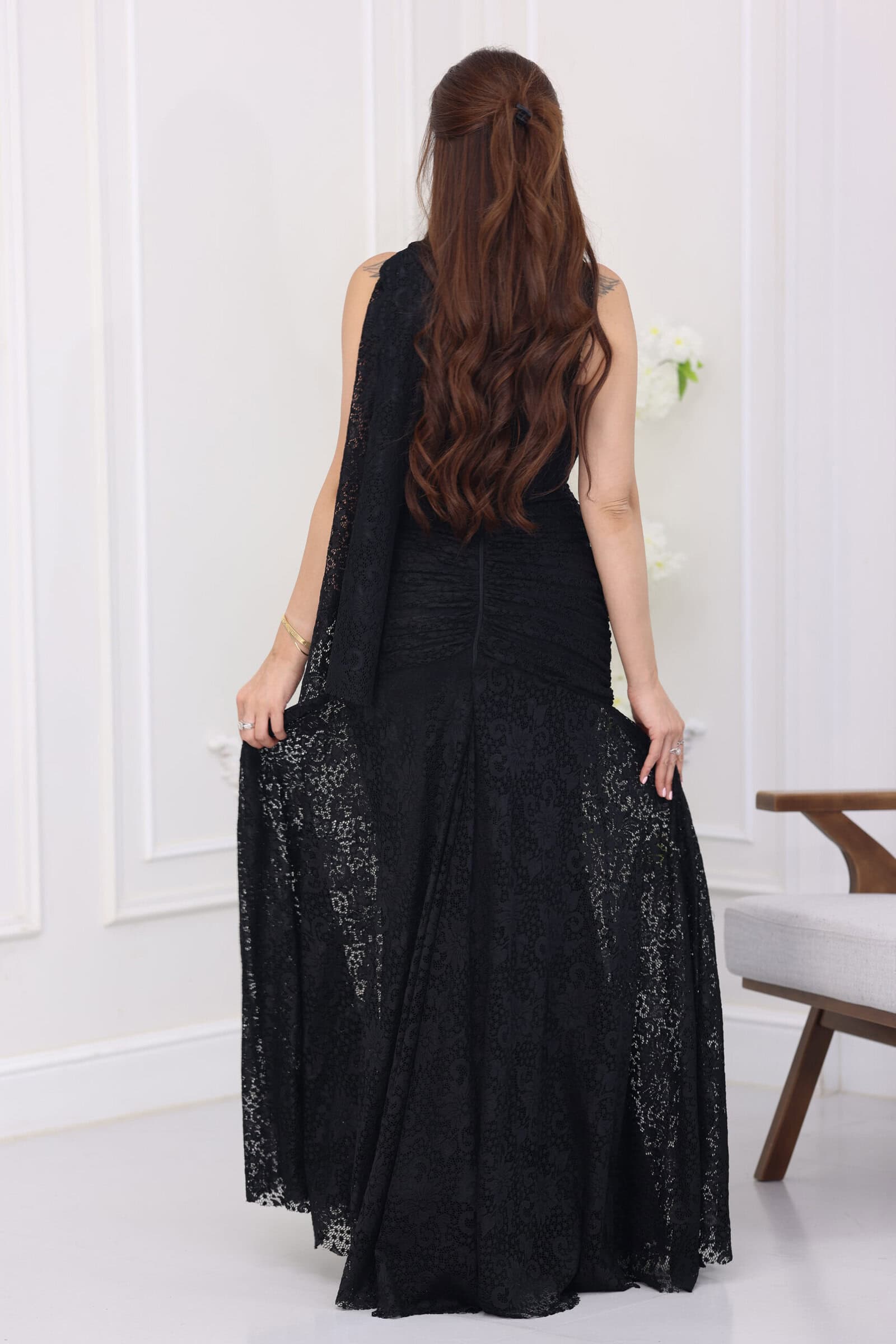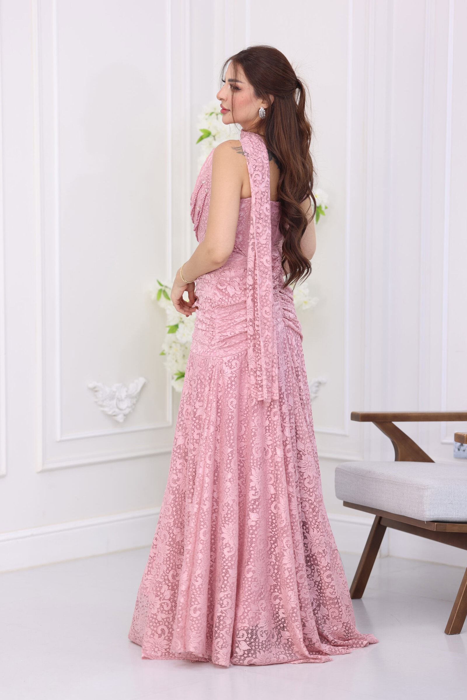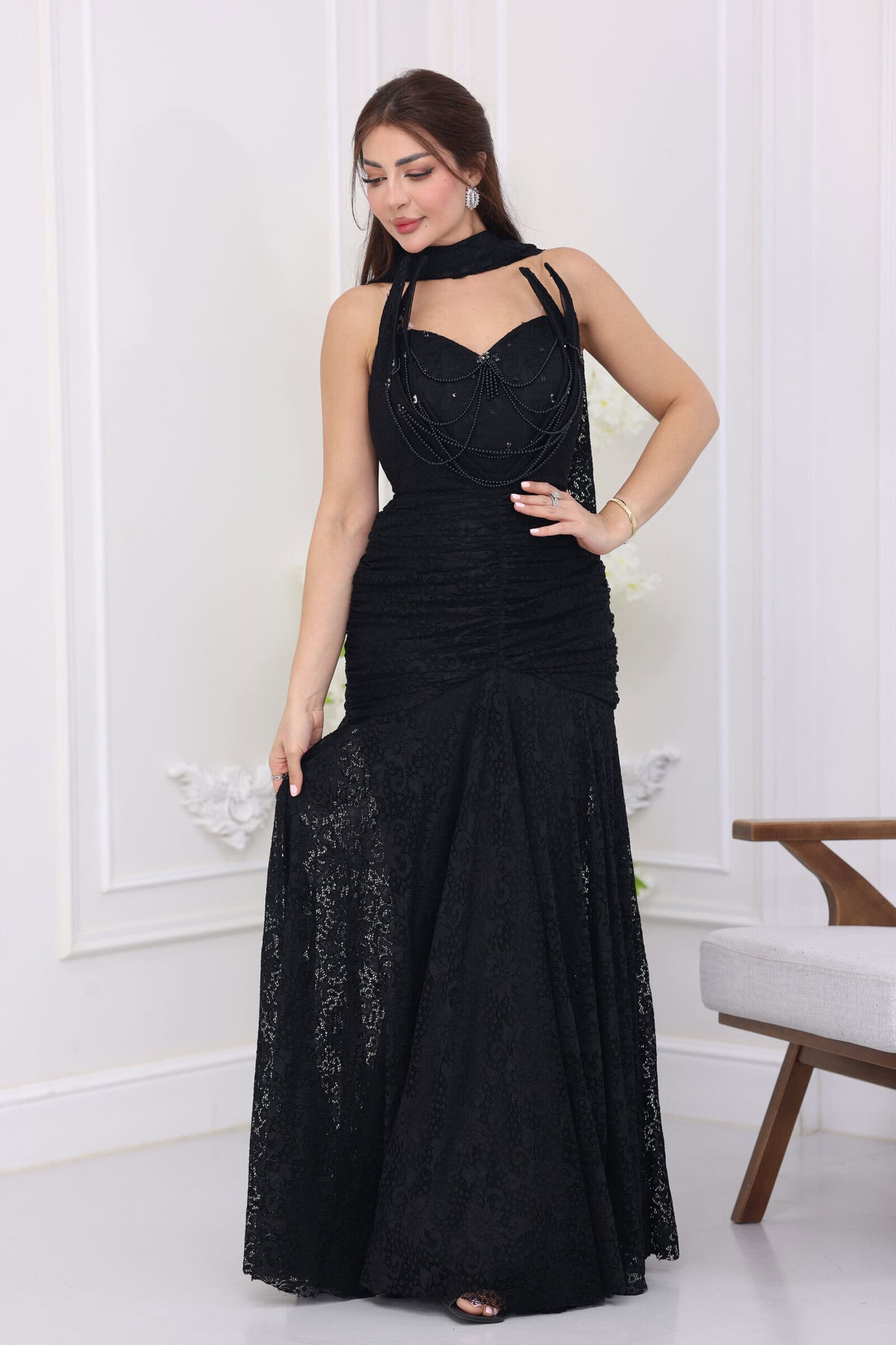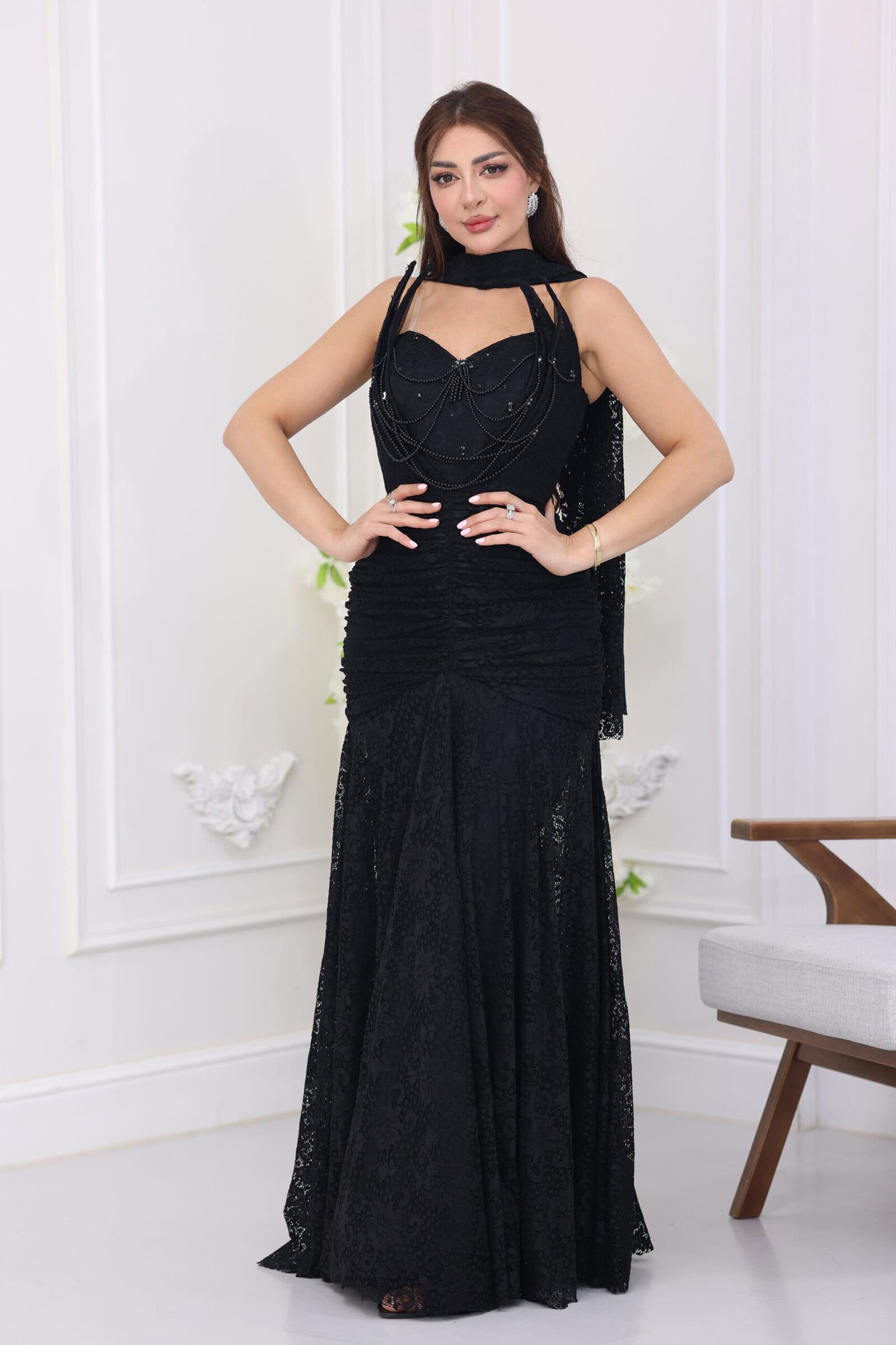 يتميز الفستان بتصميم “درابيه” (كسرات) احترافي يمتد على كامل الجسم ليعطي مظهراً انسيابياً ينحت القوام بجمالية فائقة، مع ياقة “هالتر” (Halter) تلتف حول الرقبة برقي. ما يجعل هذا الموديل قطعة فنية هو “الشك” اليدوي المبتكر بصفوف متدلية من اللؤلؤ والخرز اللامع على منطقة الصدر، مما يمنحكِ بريقاً ملكياً مع كل حركة، بالإضافة إلى وشاح خلفي ناعم ينسدل من الرقبة ليضفي لمسة درامية ساحرة، مع طول كامل (ماكسي) يمنحكِ هيبة الحضور.