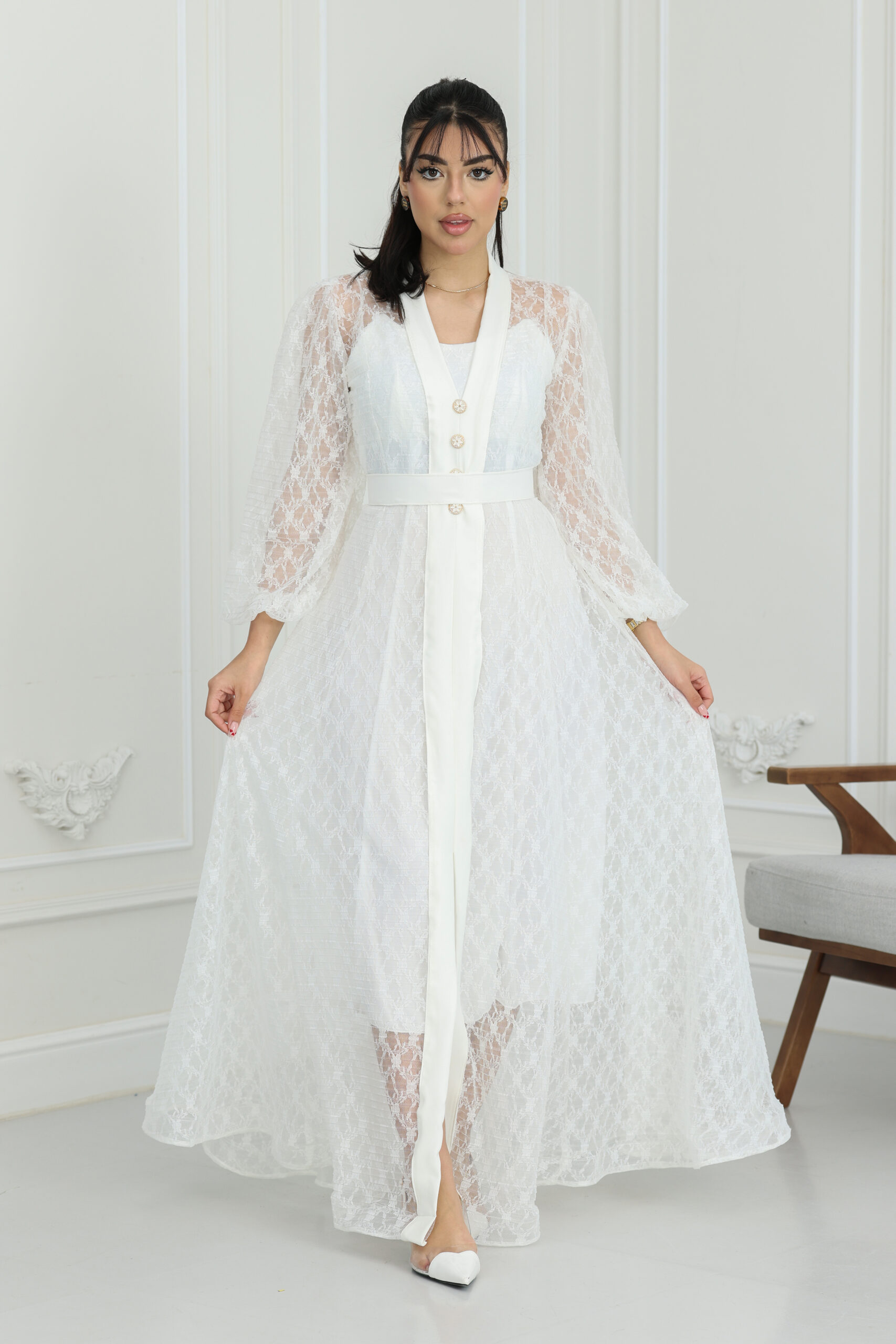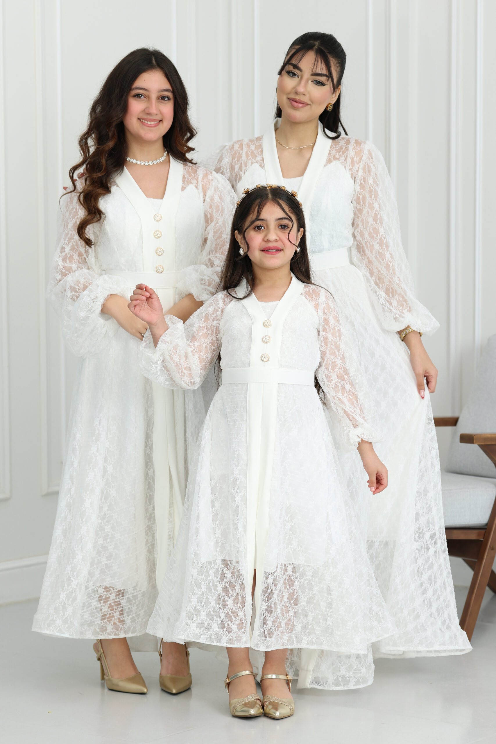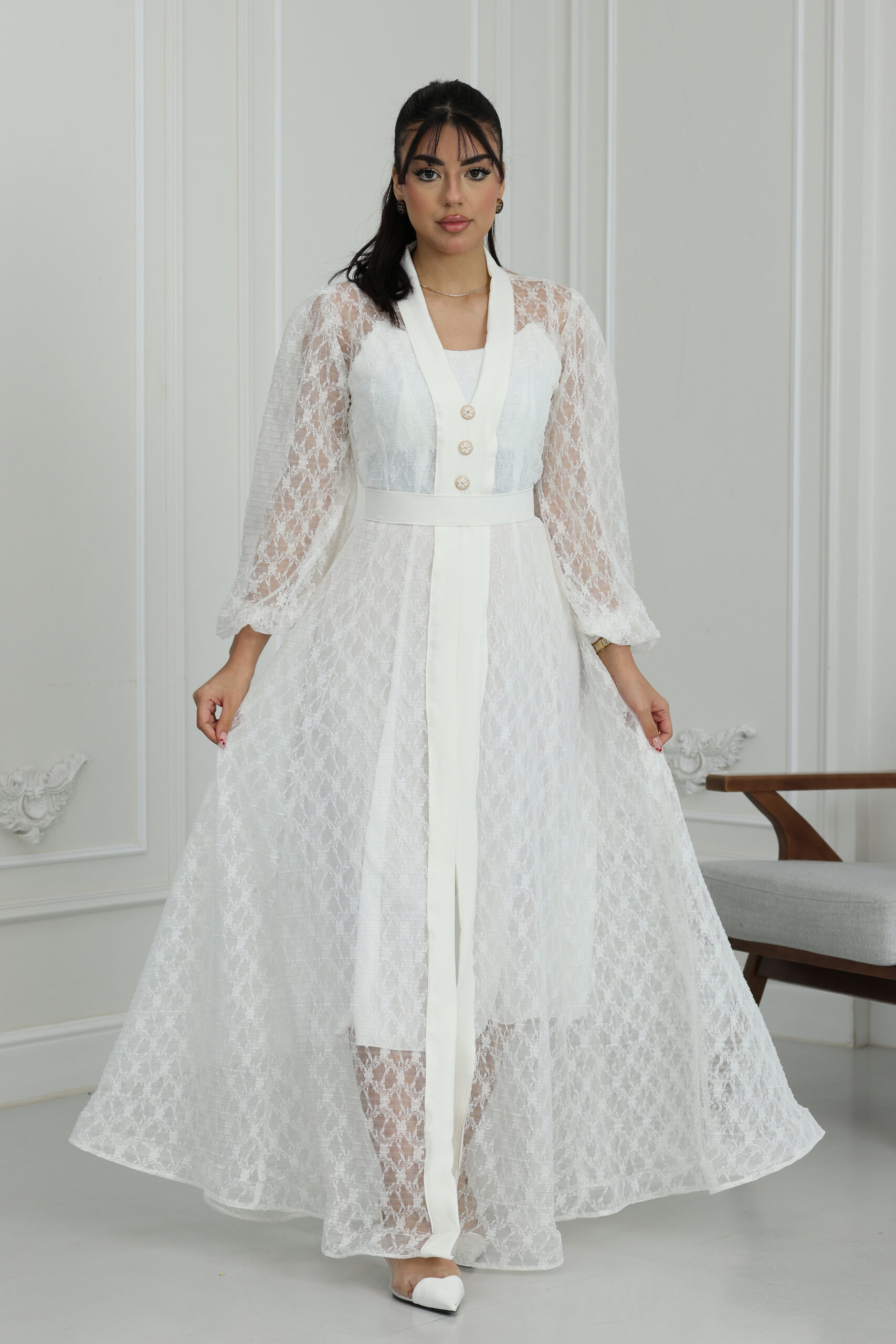 يتميز الموديل بقصة كلاسيكية راقية تنساب بنعومة على الجسم، مع أكمام طويلة من الدانتيل الشفاف المنقوش التي تنتهي بزمّة ناعمة تعطي طابعاً ملكياً. يتزين الفستان من الأمام بأزرار لؤلؤية كبيرة ومميزة تضيف لمسة من الفخامة التقليدية بأسلوب عصري. طول الفستان ماكسي يمنحكِ هيبة ووقار، مع حزام خصر يحدد القوام بجمالية، ويتوفر منها مقاسات متطابقة للأم والبنت لطلة متناغمة ومثالية للصور والذكريات الجميلة.