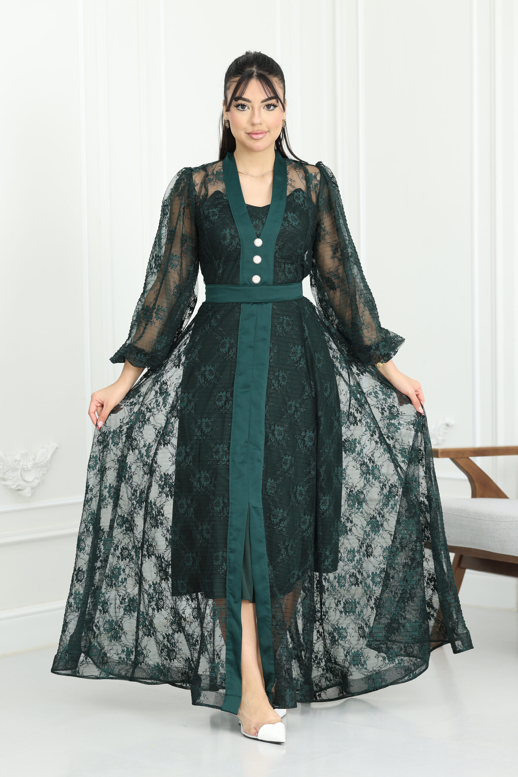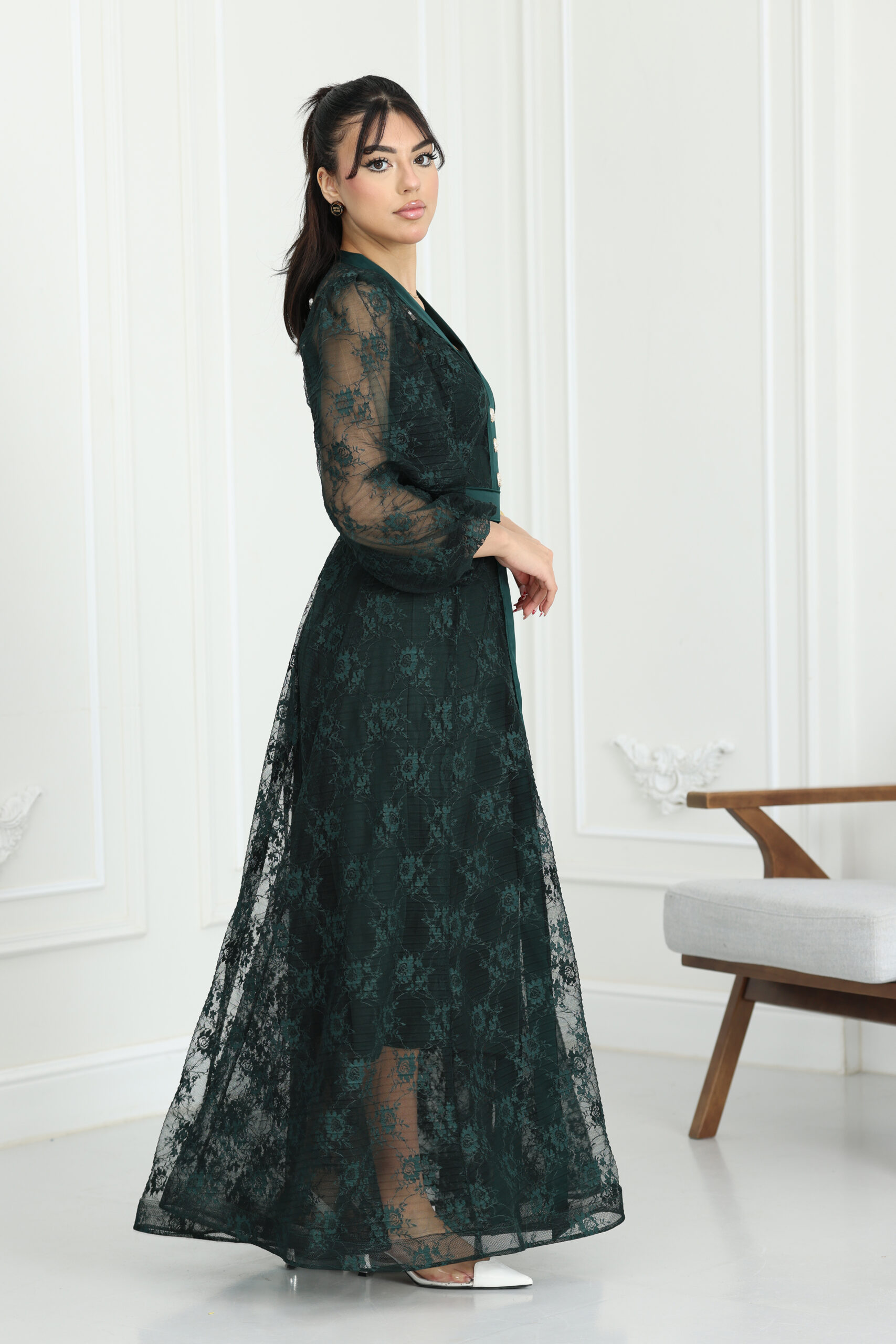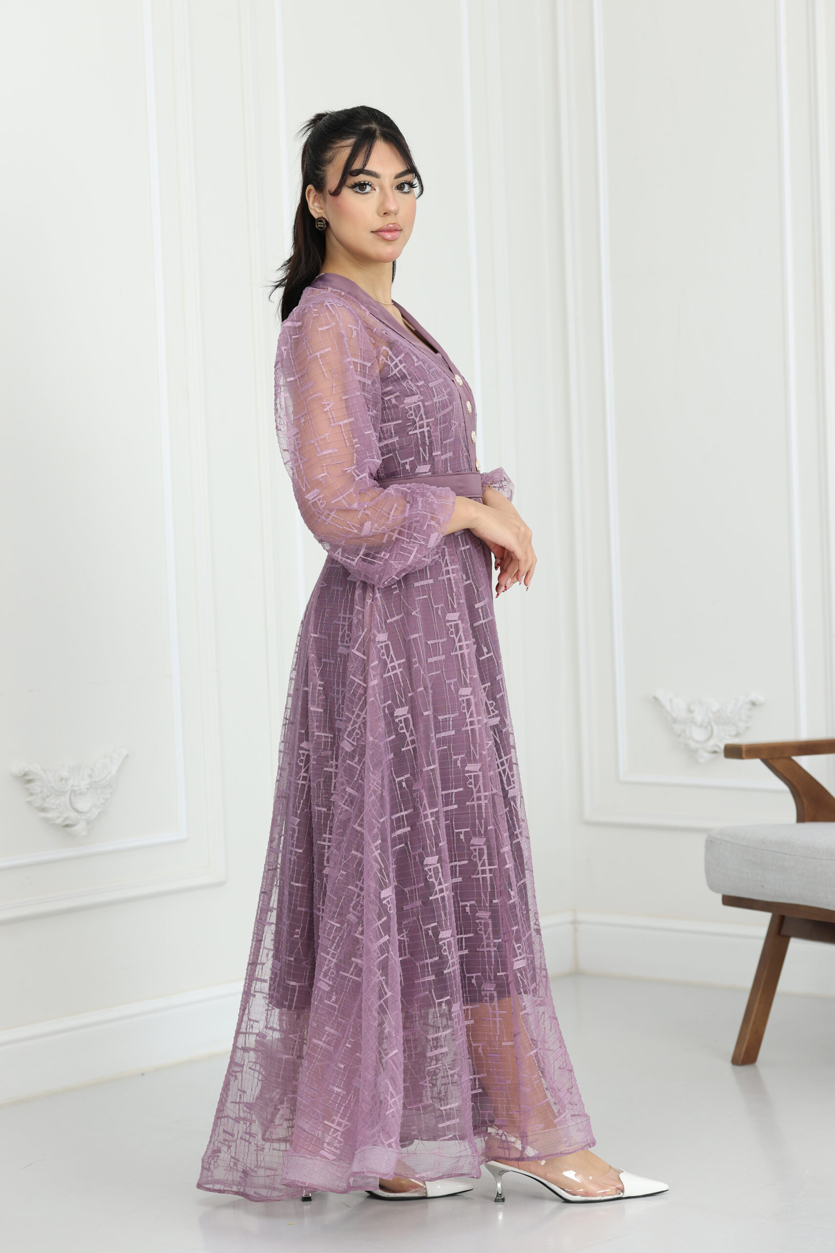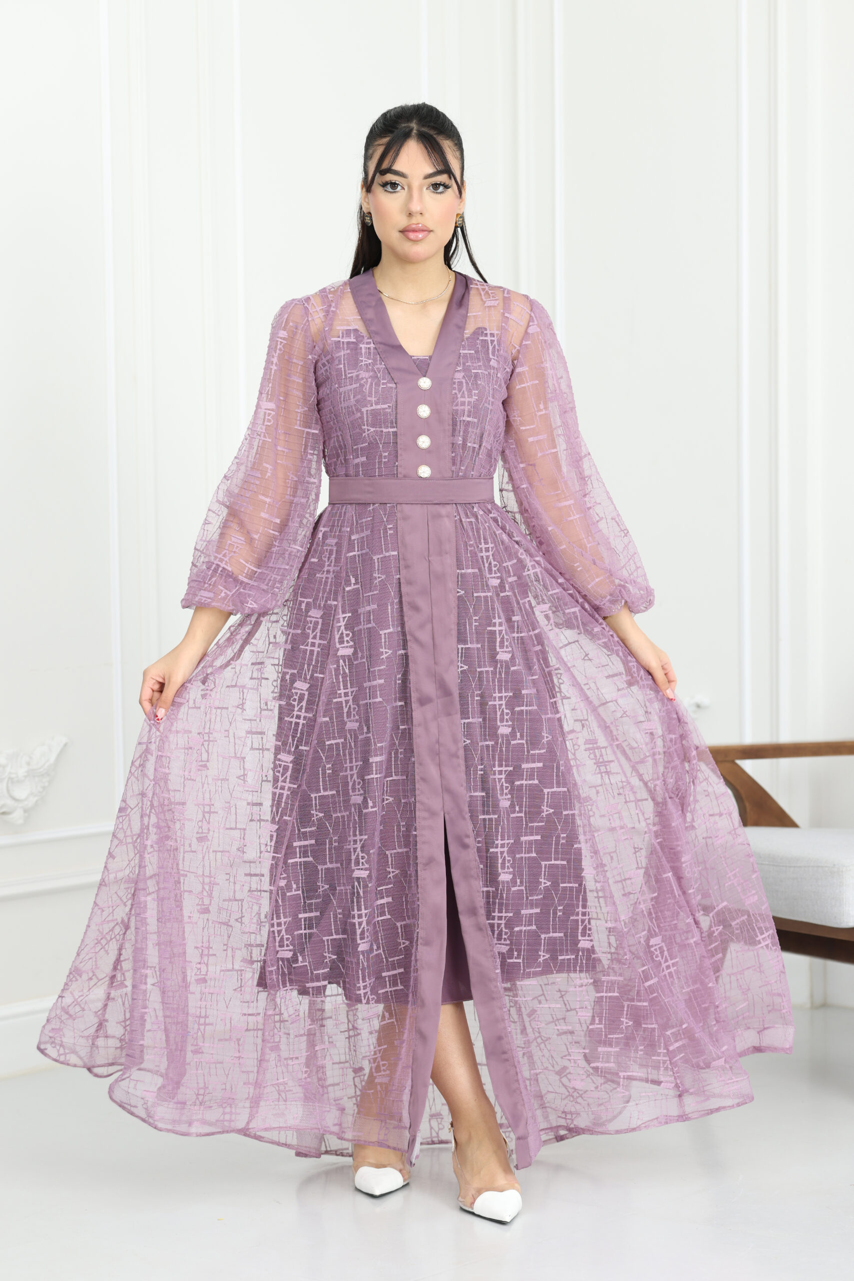 يتميز الموديل بقصة كلاسيكية راقية تنساب بنعومة على الجسم، مع أكمام طويلة من الدانتيل الشفاف المنقوش التي تنتهي بزمّة ناعمة تعطي طابعاً ملكياً. يتزين الفستان من الأمام بأزرار لؤلؤية كبيرة ومميزة تضيف لمسة من الفخامة التقليدية بأسلوب عصري. طول الفستان ماكسي يمنحكِ هيبة ووقار، مع حزام خصر يحدد القوام بجمالية، ويتوفر منها مقاسات متطابقة للأم والبنت لطلة متناغمة ومثالية للصور والذكريات الجميلة.