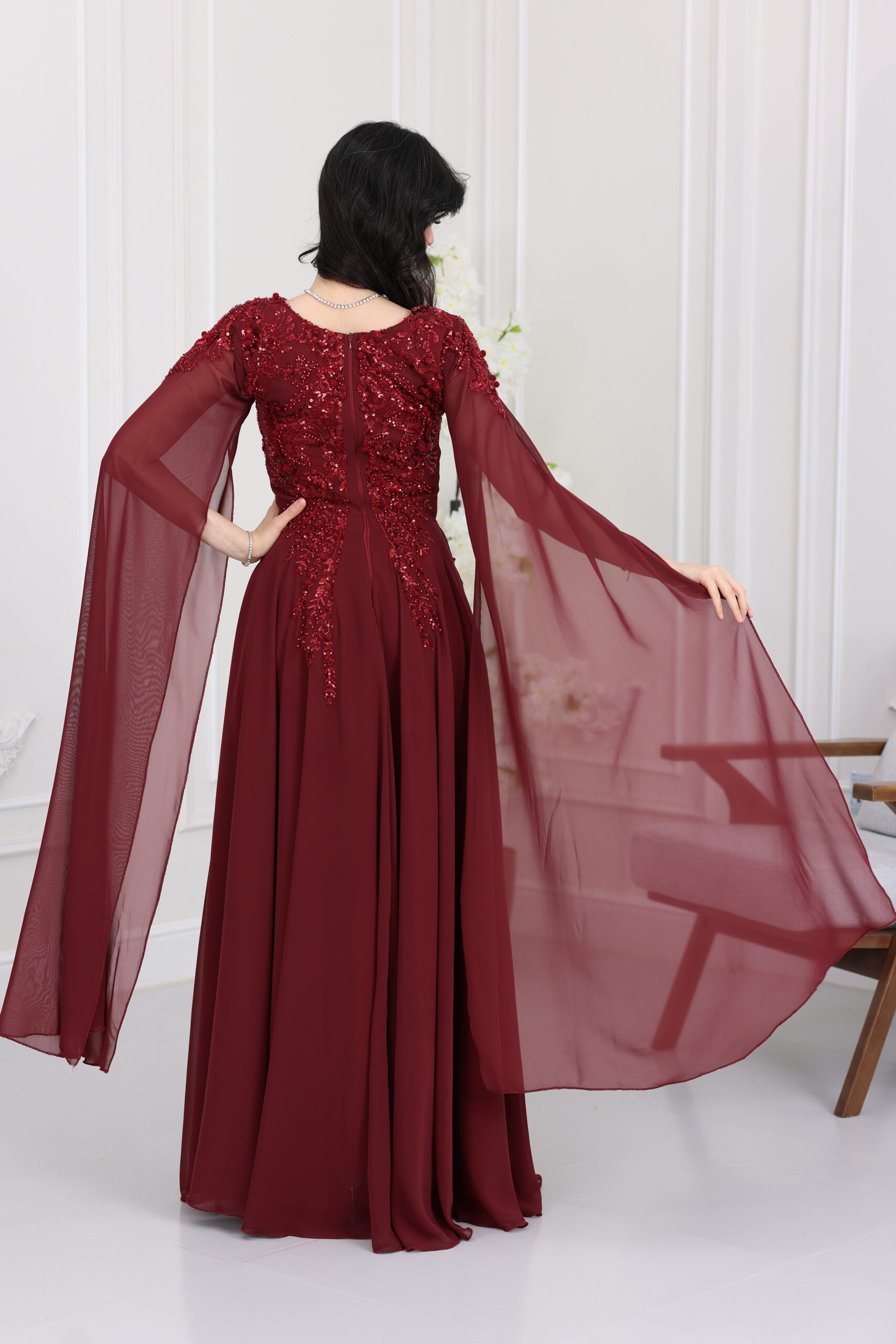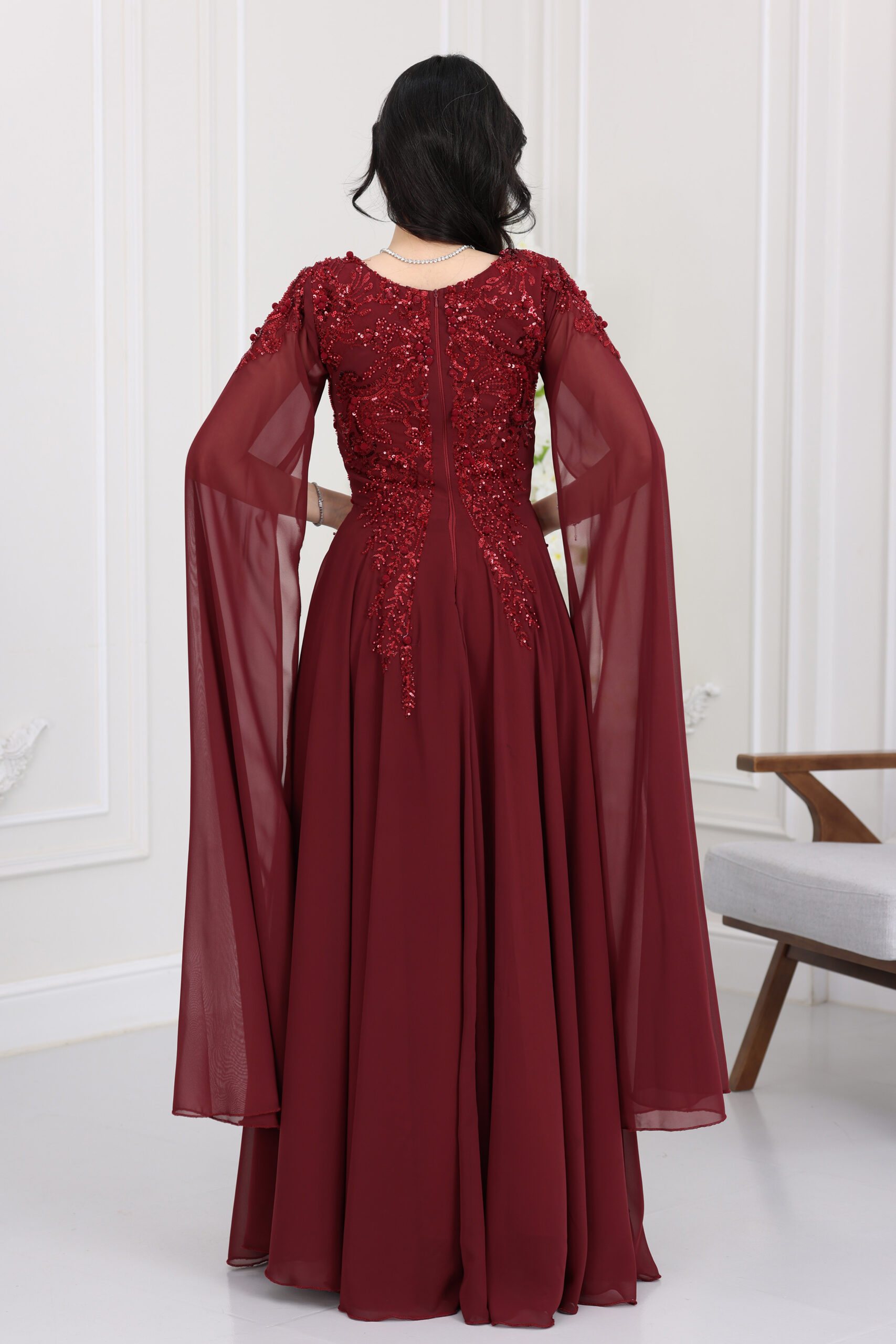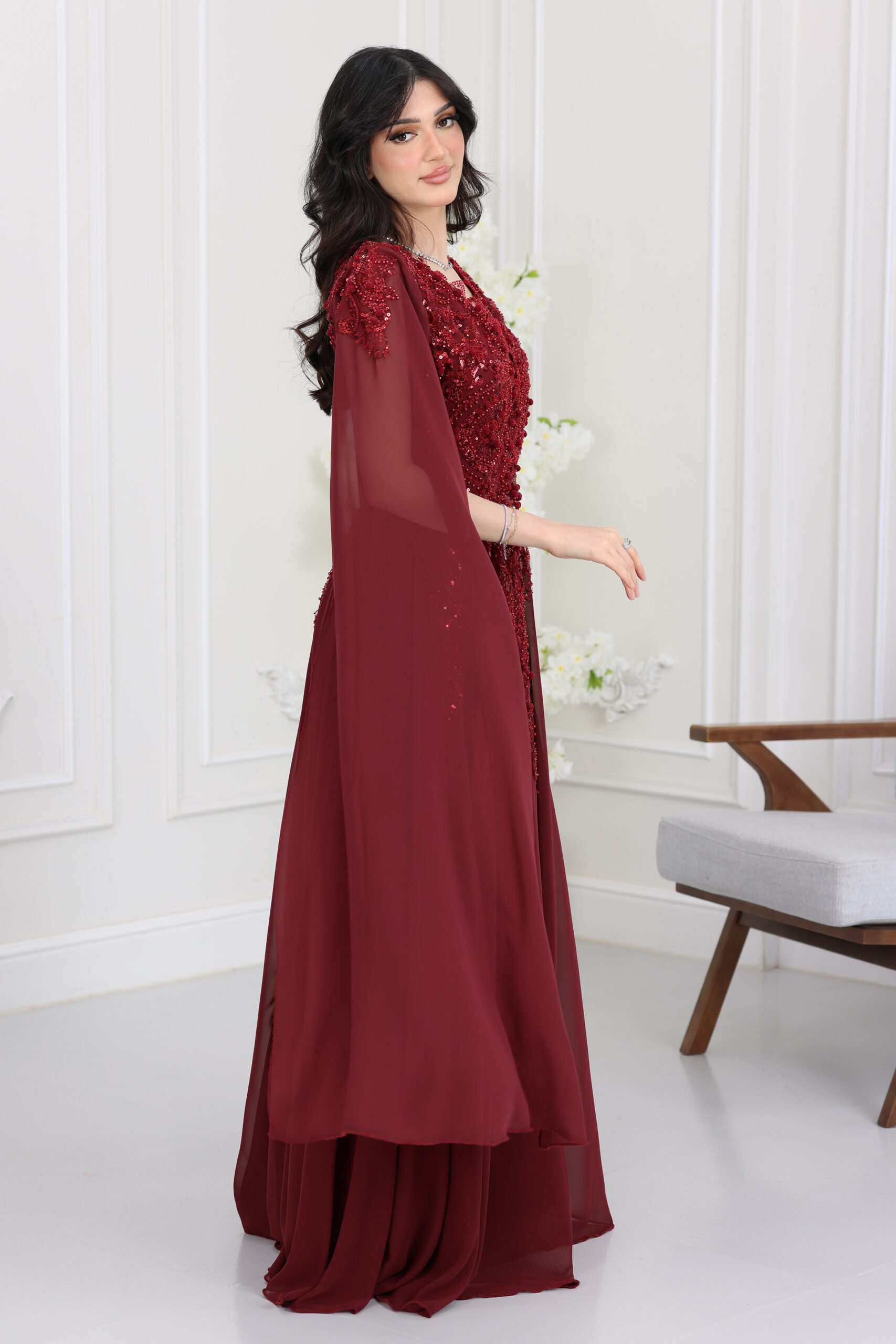 فستان سهرة بأكمام منديل أنيقة هو خيارك الأكيد لإطلالة لا تُنسى. يتميز بتصميمه الراقي بقصة السمكة التي تُبرز جمال القوام وتمنحه طولاً ورشاقة، مما يجعله مثالياً ضمن أفخم فساتين السهرة. الفستان مُصمم بياقة عالية (High Neck) مُزدانة بتطريزات كريستال دقيقة تبرز منطقة الرقبة والصدر بشكل ملكي. لكن ما يميز هذا الموديل حقاً هو تفصيله الزينة الكبيرة والمنفوشة في منطقة الظهر، والتي تضفي لمسة عصرية وجريئة على الإطلالة التقليدية. إذا كنتِ تبحثين عن فساتين خطوبة أو فساتين مناسبات تدمج بين الرقي والفخامة مع لمسة لافتة، فهذا هو المطلوب. اطلبيه الآن من المصمم الحديث!