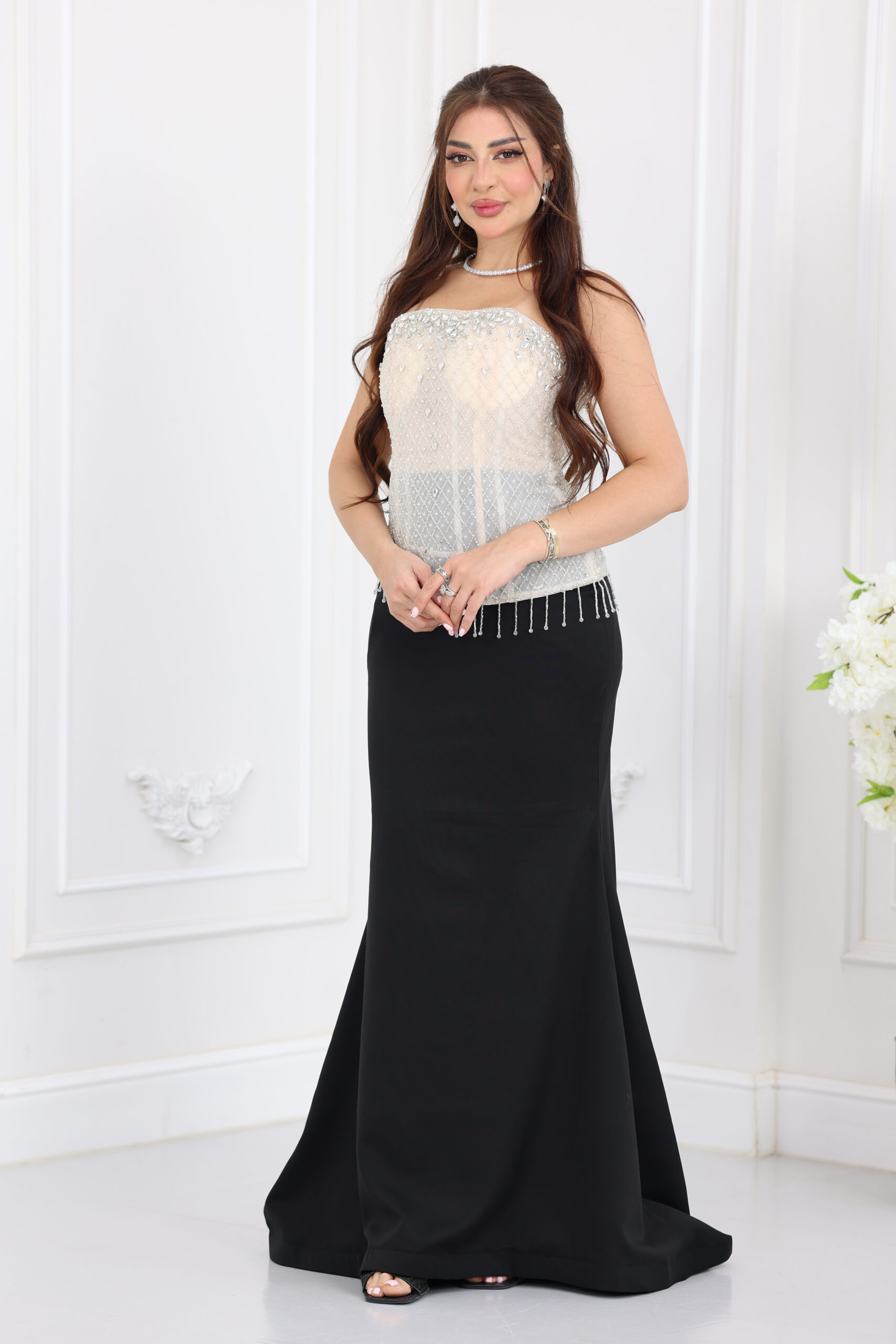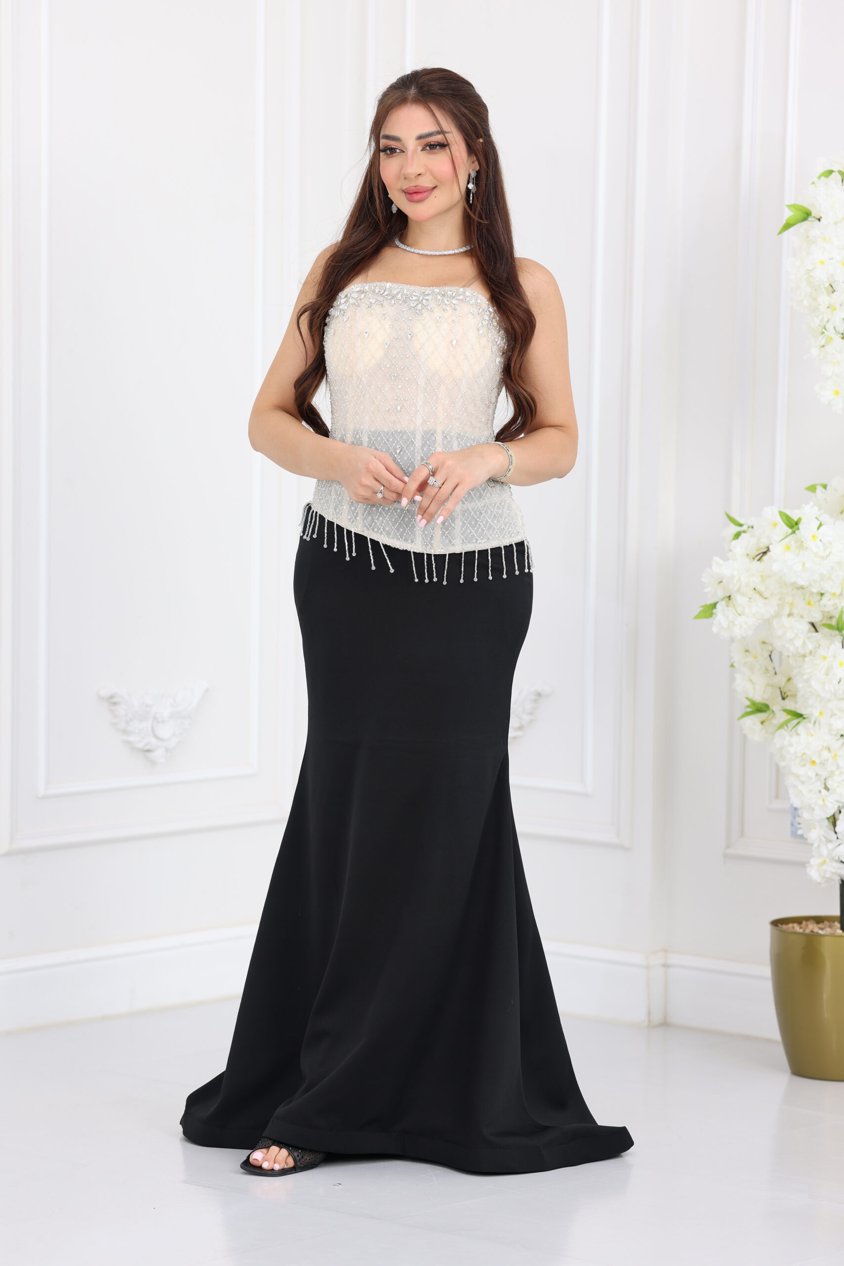 يتميز الفستان بتصميم “كورسيه” (Corset) احترافي ينحت الجسم بجمالية فائقة، مع “توب” شفاف مشغول بالكامل بشك يدوي دقيق من الكريستال والخرز اللامع الذي يغطي منطقة الصدر والخصر. الإبداع يظهر في السلاسل الكريستالية المتدلية من نهاية الكورسيه التي تضفي حركة انسيابية وبريقاً مع كل خطوة، مع تنورة بقصة “السمكة” (Mermaid) الطويلة التي تمنحكِ قواماً ممشوقاً وهيبة حضور لا تُنسى في السهرات.