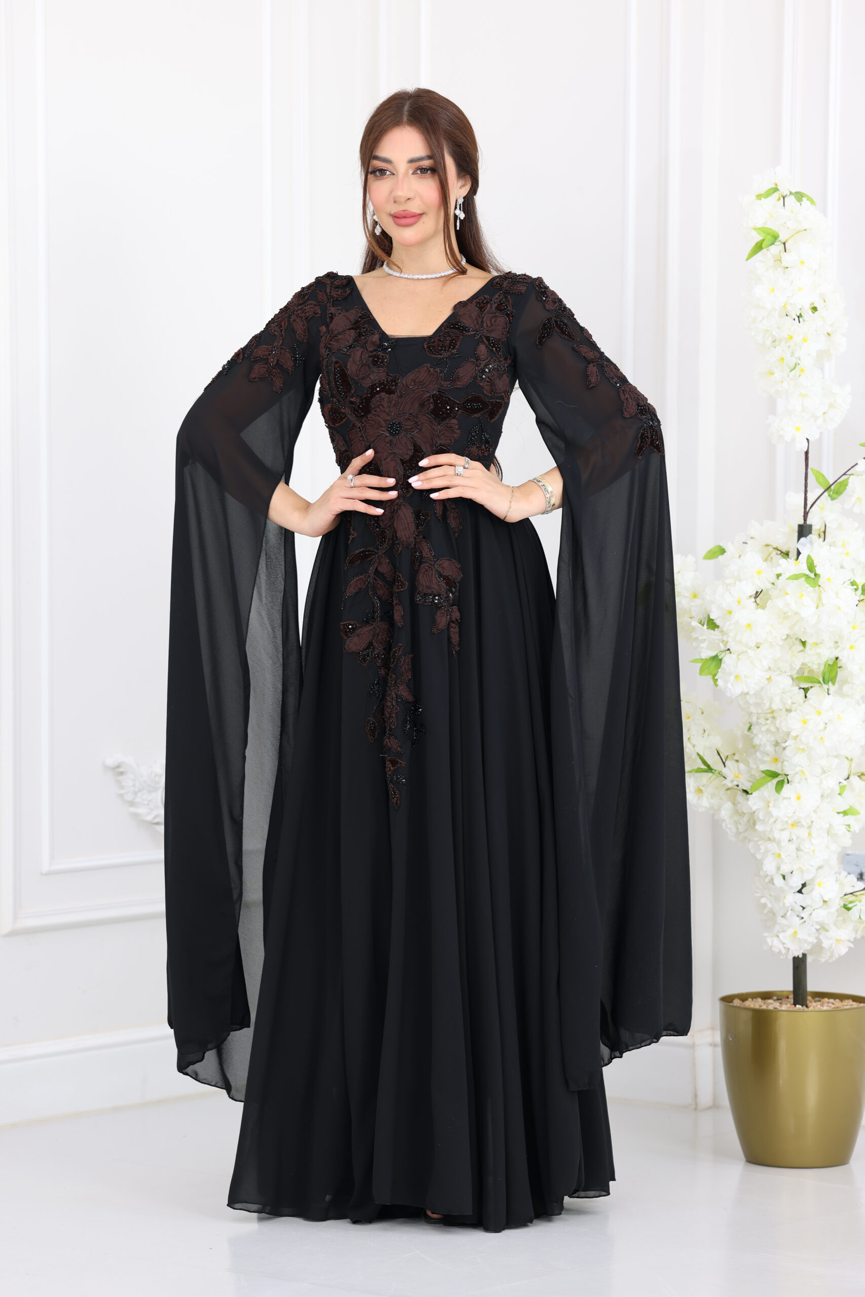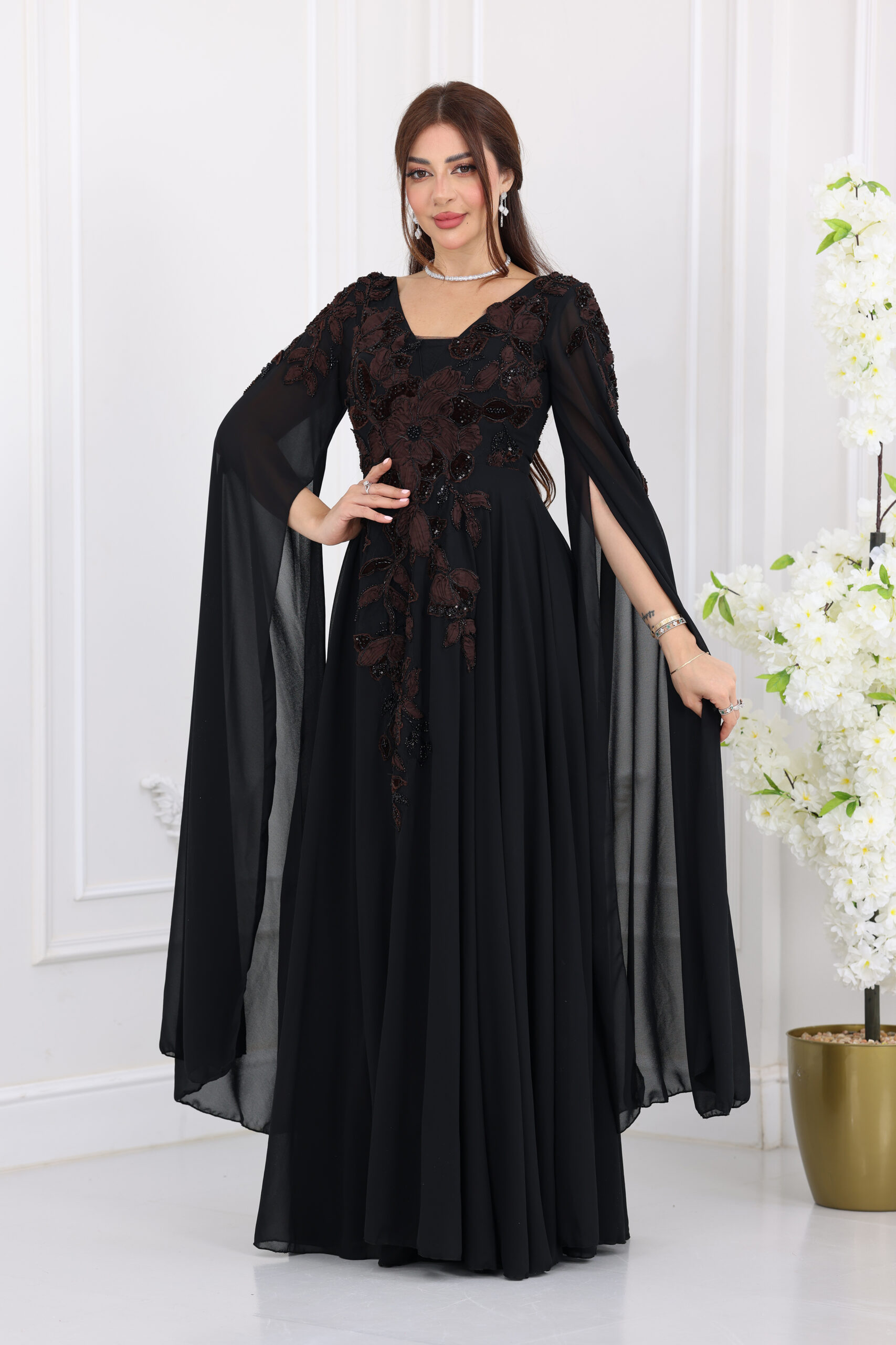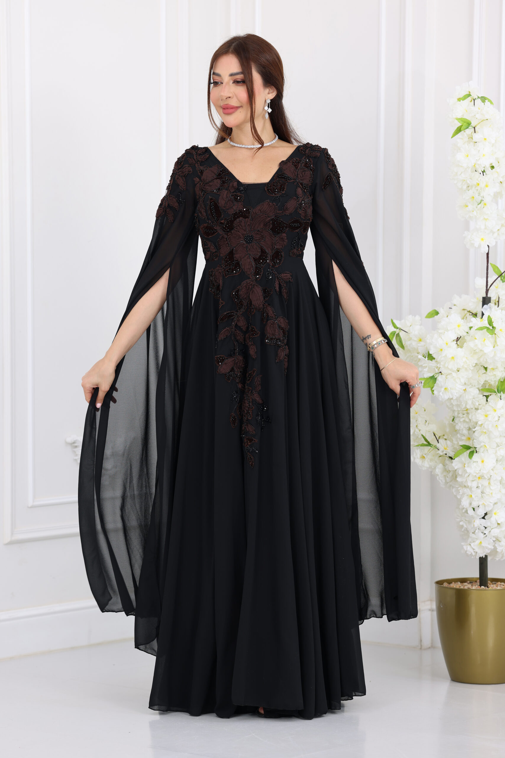 يتميز الفستان بياقة “V” أنيقة تمنحكِ مظهراً ساتراً وراقياً، مع قصة انسيابية واسعة (A-Line) تنسدل بنعومة لتمنحكِ حركة ملكية مهيبة. الفخامة الحقيقية تكمن في الشك اليدوي الكثيف والمتقن الذي يغطي منطقة الصدر والخصر بنقوش ورود وأوراق شجر فنية مشغولة بالخرز والستراس اللامع، بالإضافة إلى أكمام “الكيب” (Cape) الطويلة والمفتوحة التي تبدأ من الكتف وتنسدل حتى الأرض، مما يعطي هيبة الحضور وطلة درامية تخطف الأنفاس في كل سهرة.