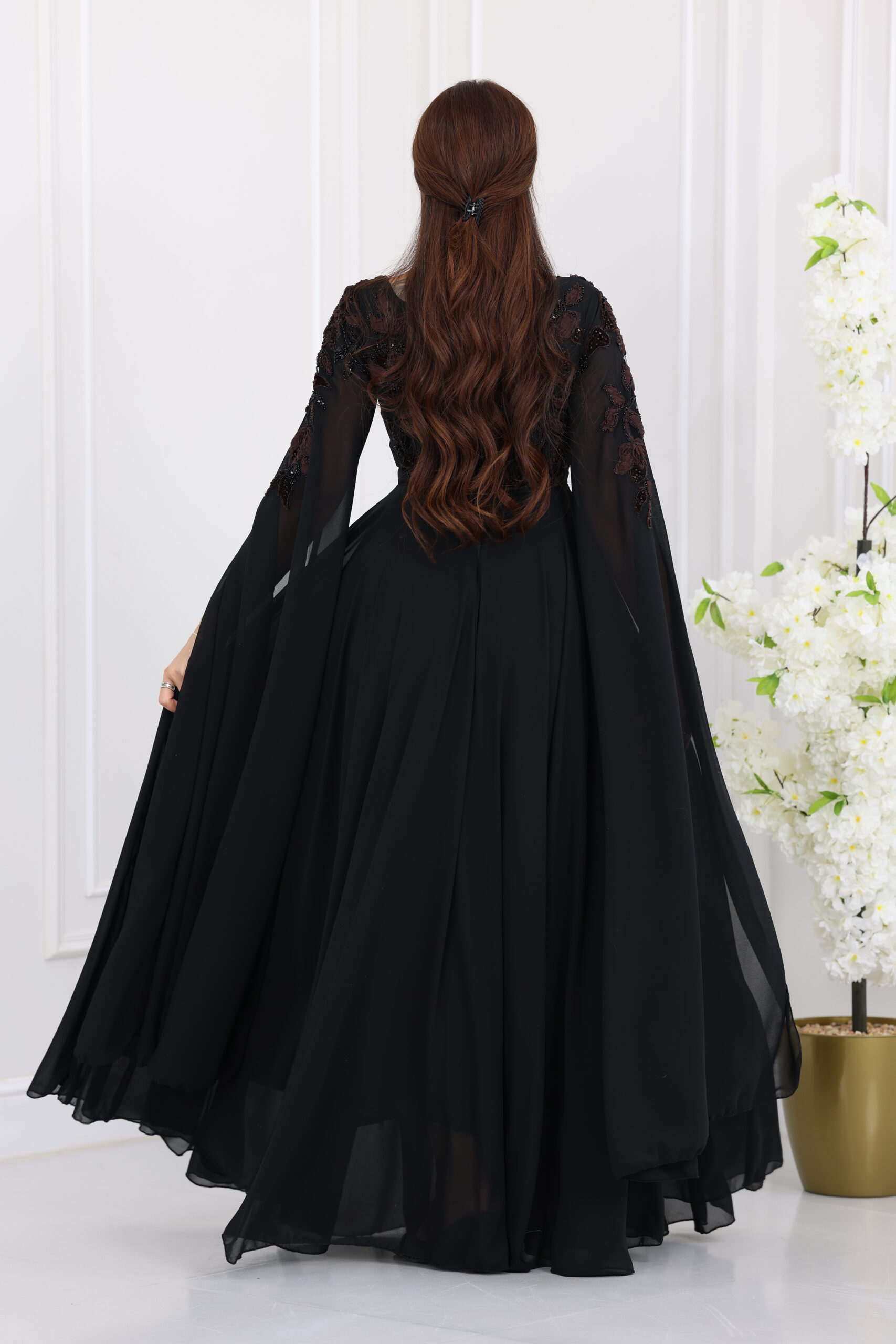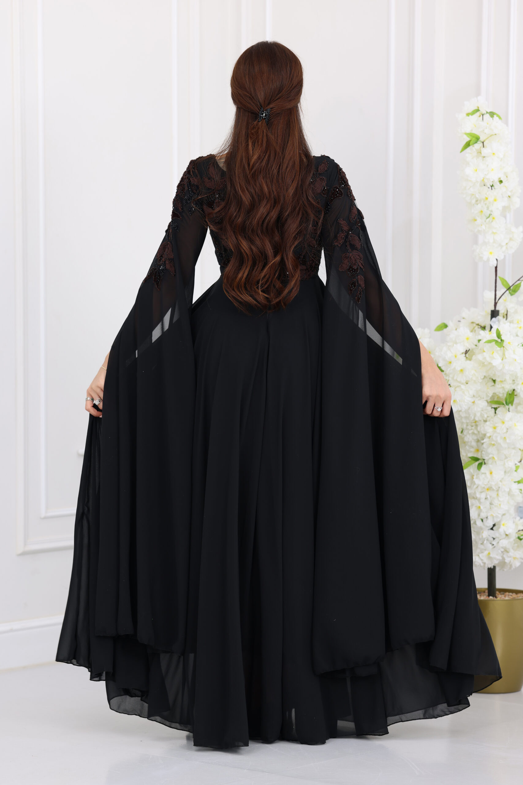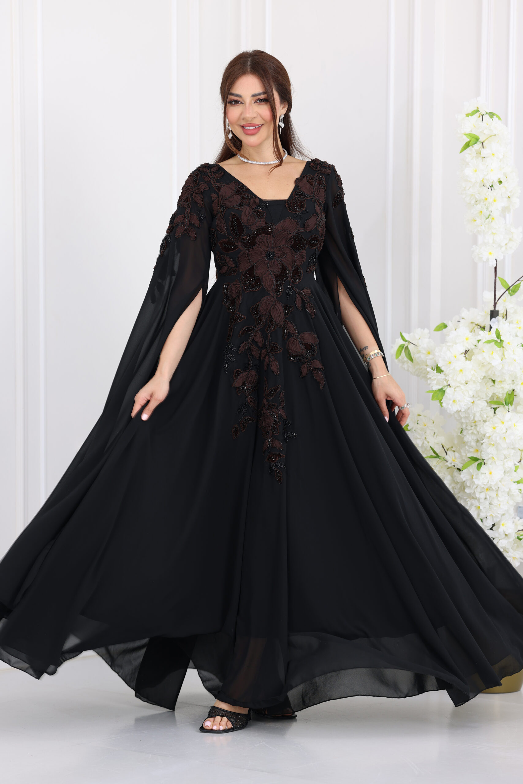 يتميز الفستان بياقة “V” أنيقة تمنحكِ مظهراً ساتراً وراقياً، مع قصة انسيابية واسعة (A-Line) تنسدل بنعومة لتمنحكِ حركة ملكية مهيبة. الفخامة الحقيقية تكمن في الشك اليدوي الكثيف والمتقن الذي يغطي منطقة الصدر والخصر بنقوش ورود وأوراق شجر فنية مشغولة بالخرز والستراس اللامع، بالإضافة إلى أكمام “الكيب” (Cape) الطويلة والمفتوحة التي تبدأ من الكتف وتنسدل حتى الأرض، مما يعطي هيبة الحضور وطلة درامية تخطف الأنفاس في كل سهرة.