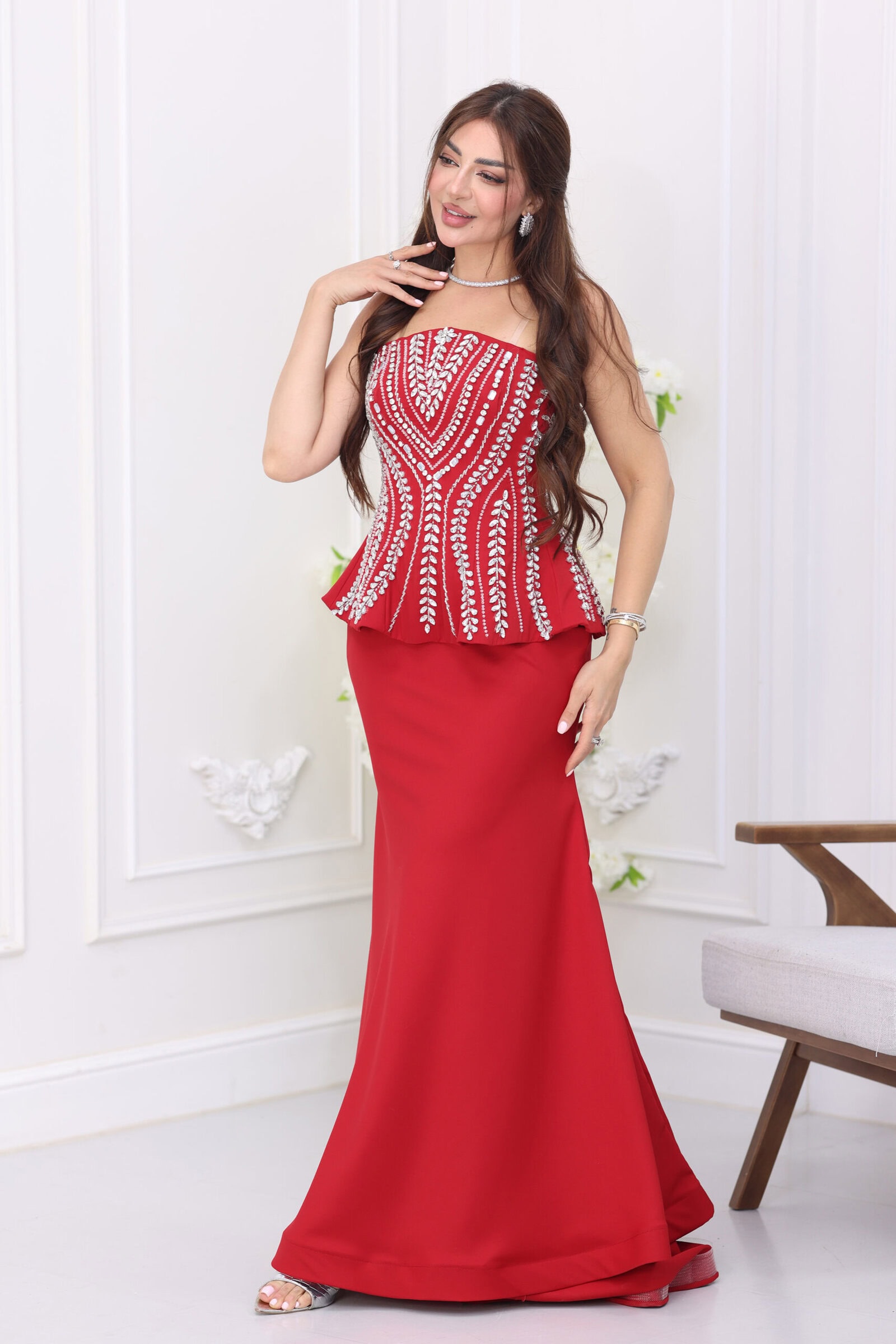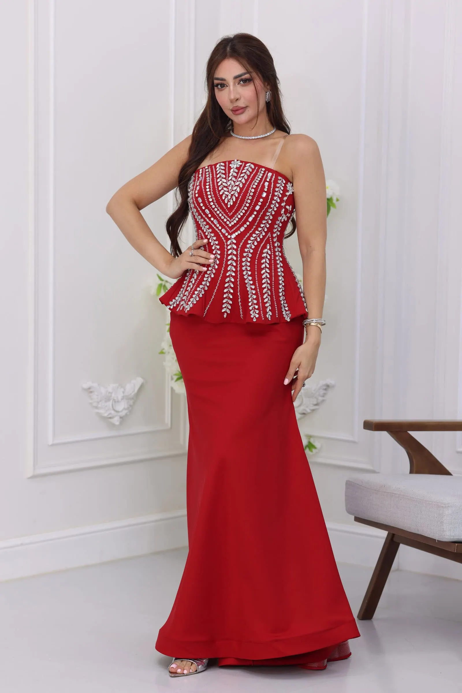 يأتي الموديل بتصميم “كورسيه” منحوت يحدد تفاصيل الجسم بجمالية فائقة، مع قصة صدر “توب” مكشوفة تمنحكِ رقبة طويلة وإطلالة ساحرة. ما يميز هذا الفستان هو “الشك” اليدوي الكثيف بالكريستال اللامع الذي يغطي كامل منطقة الصدر والخصر بتوزيع هندسي فخم، بالإضافة إلى قصة “البيبلوم” (Peplum) عند الخصر التي تعطي مظهراً ملكياً وتخفي عيوب الجسم، مع تنورة طويلة منسدلة وقصة خلفية برباط (Corset Back) تضمن لكِ المقاس المثالي والتحكم التام.