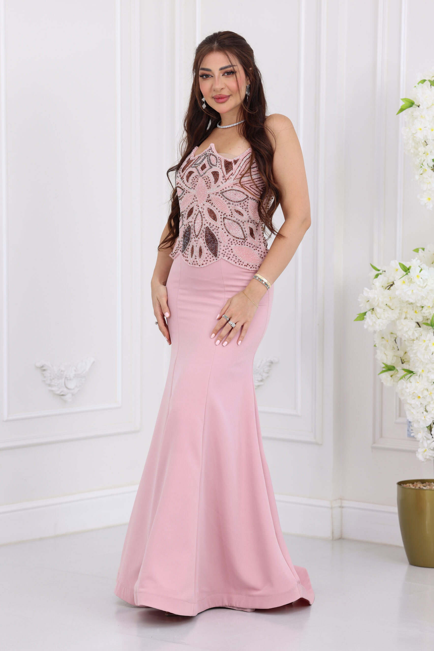 يتميز الفستان بتصميم “توب” (ياقة قلب) يبرز جمال العنق والأكتاف برقي متناهٍ، مع قصة “السمكة” (Mermaid) التي تنحت الجسم بجمالية فائقة وتمنحكِ قواماً ممشوقاً. الفخامة الحقيقية تكمن في الشك اليدوي الكثيف والمبتكر بنقوش هندسية وأوراق شجر مشغولة بالخرز والستراس اللامع الذي يغطي كامل منطقة الصدر والخصر، مع أطراف سفلية (بيبلوم خفيف) تزيد من فخامة القطعة، وينساب الفستان بطول كامل يعطي هيبة الحضور في كل سهرة.