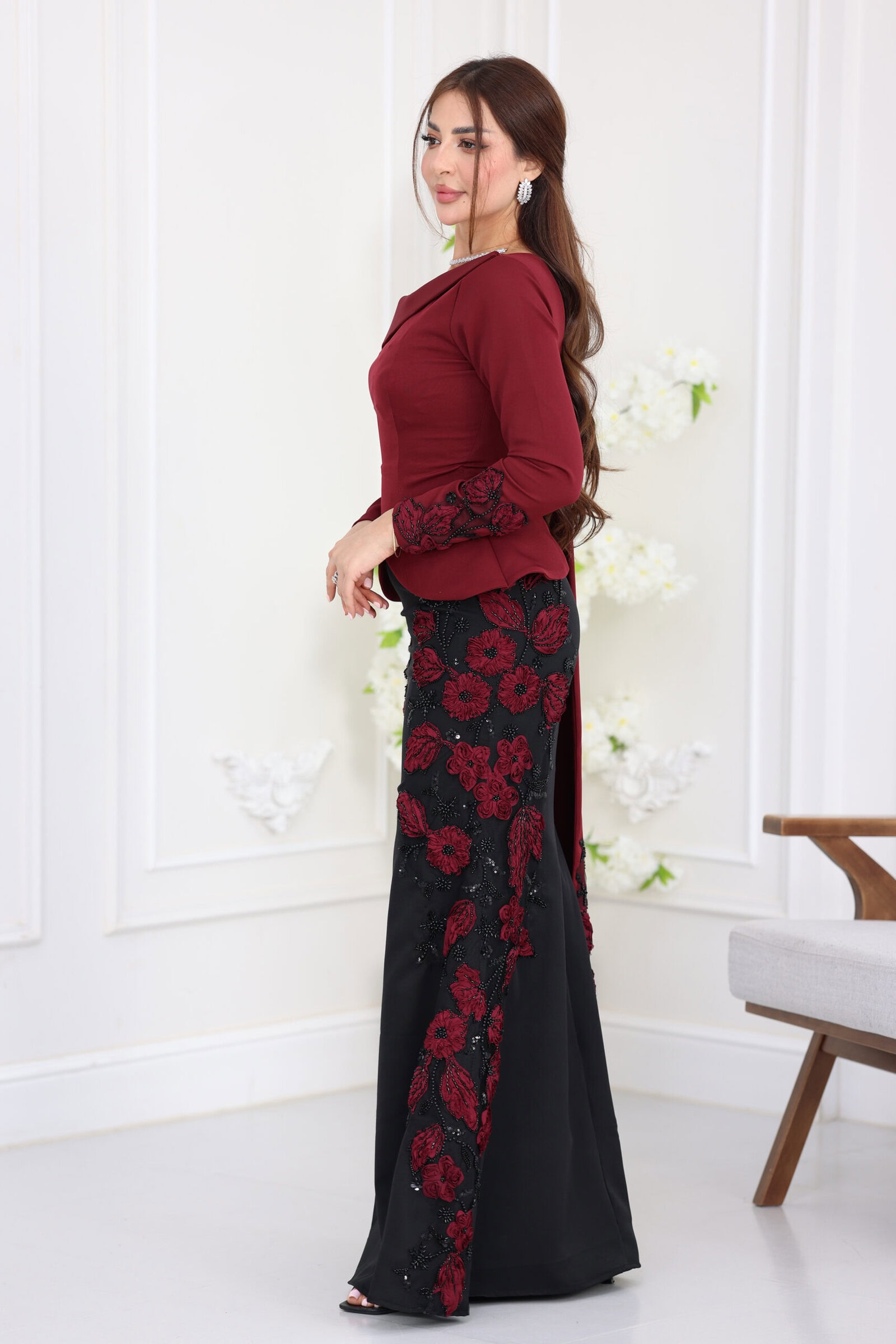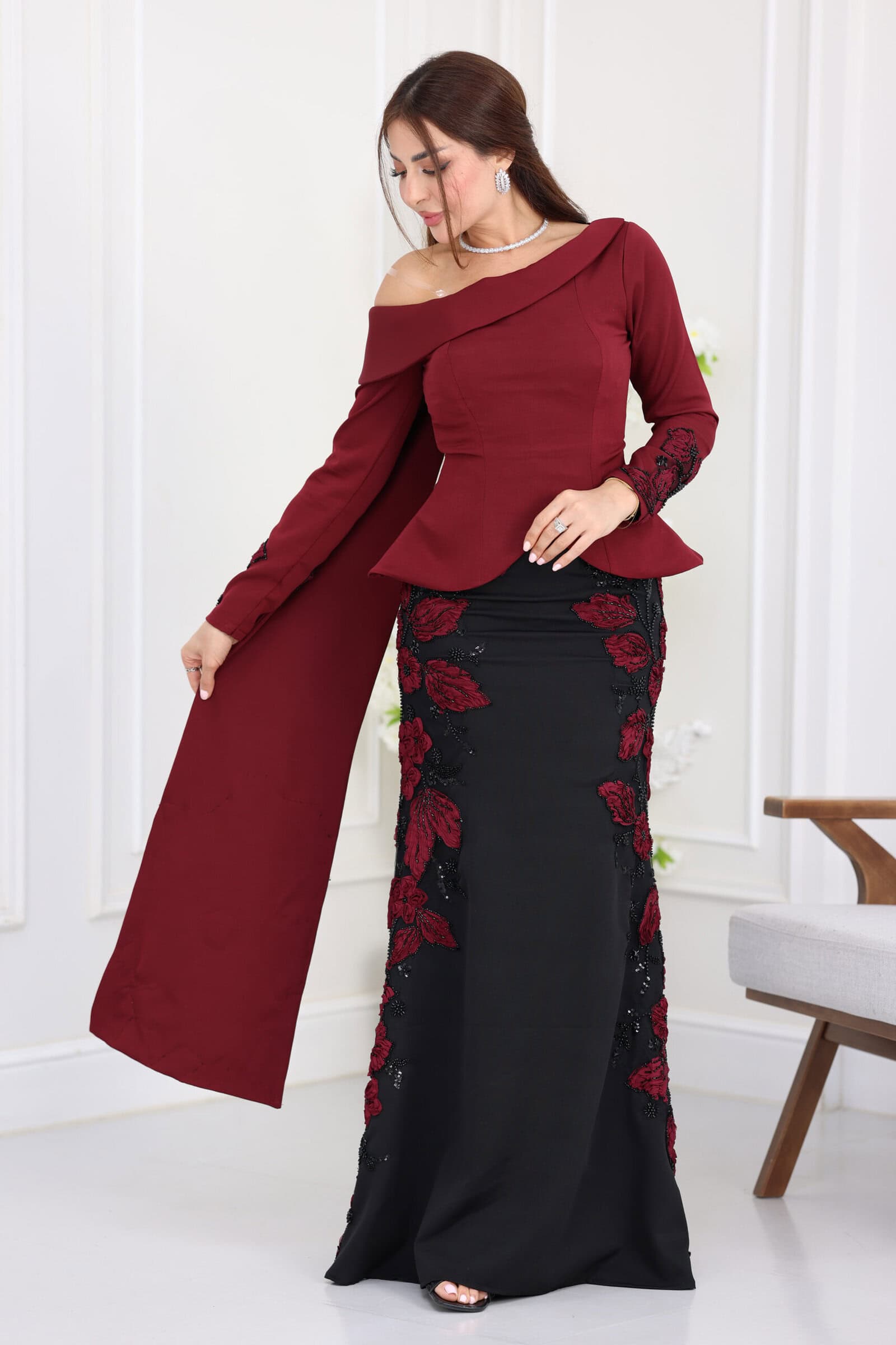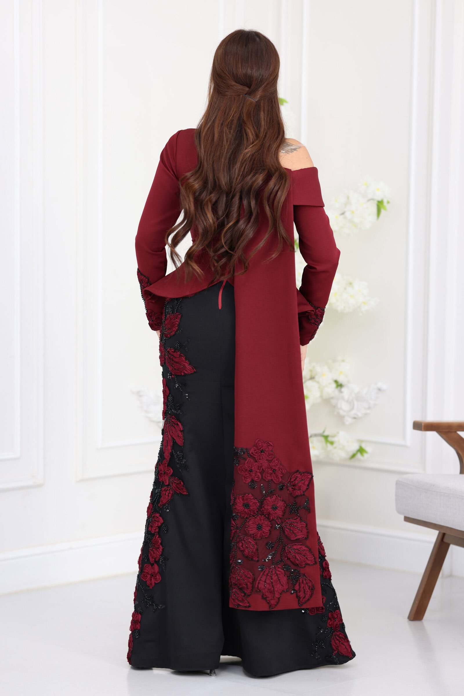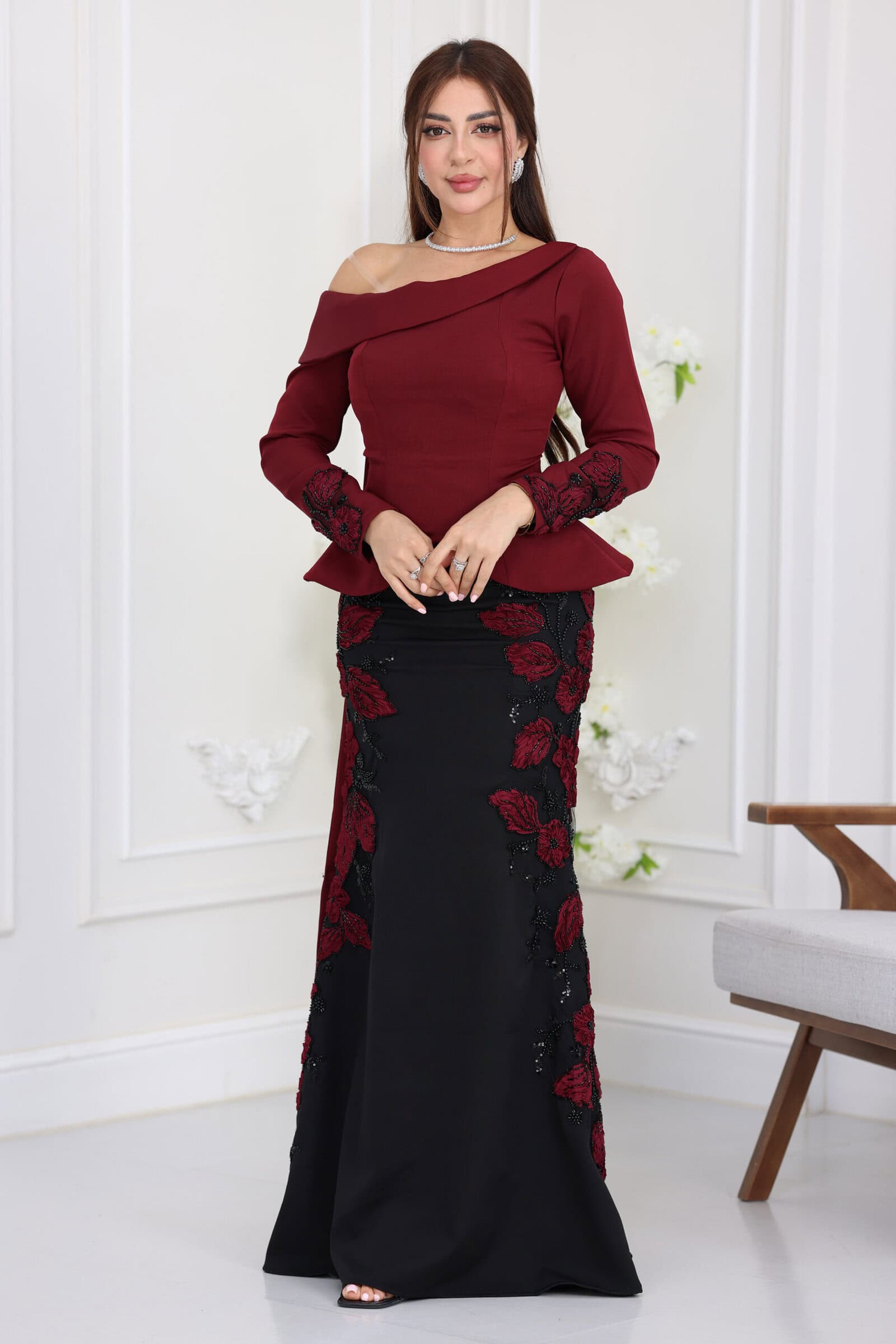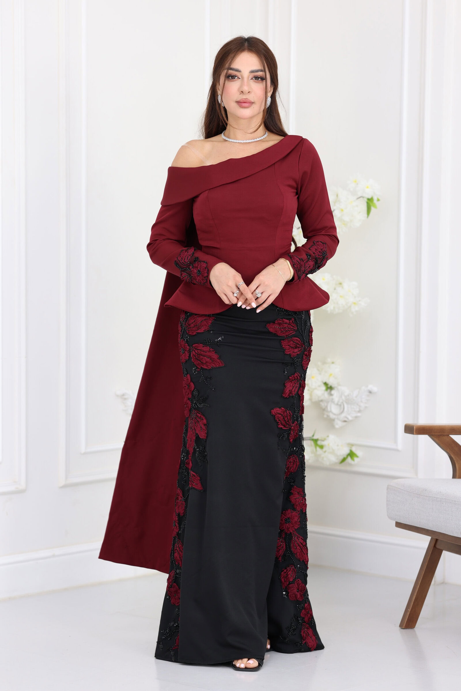 يتميز الفستان بتصميم عصري وفريد؛ الجزء العلوي يأتي بقصة “بيبلوم” (Peplum) تحدد الخصر وتخفي العيوب، مع ياقة “أوف شولدر” (Off-shoulder) بكسرة صدر عريضة تمنحكِ رقبة طويلة وإطلالة ساحرة. أما التنورة فتأتي بقصة “السمكة” (Mermaid) الطويلة، ومزينة بالكامل بتطريز ورود بارزة وشك يدوي كثيف يمتد على كامل التنورة والأكمام، بالإضافة إلى وشاح خلفي منسدل من الكتف يضيف لمسة من الرقي والحركة الانسيابية مع كل خطوة.