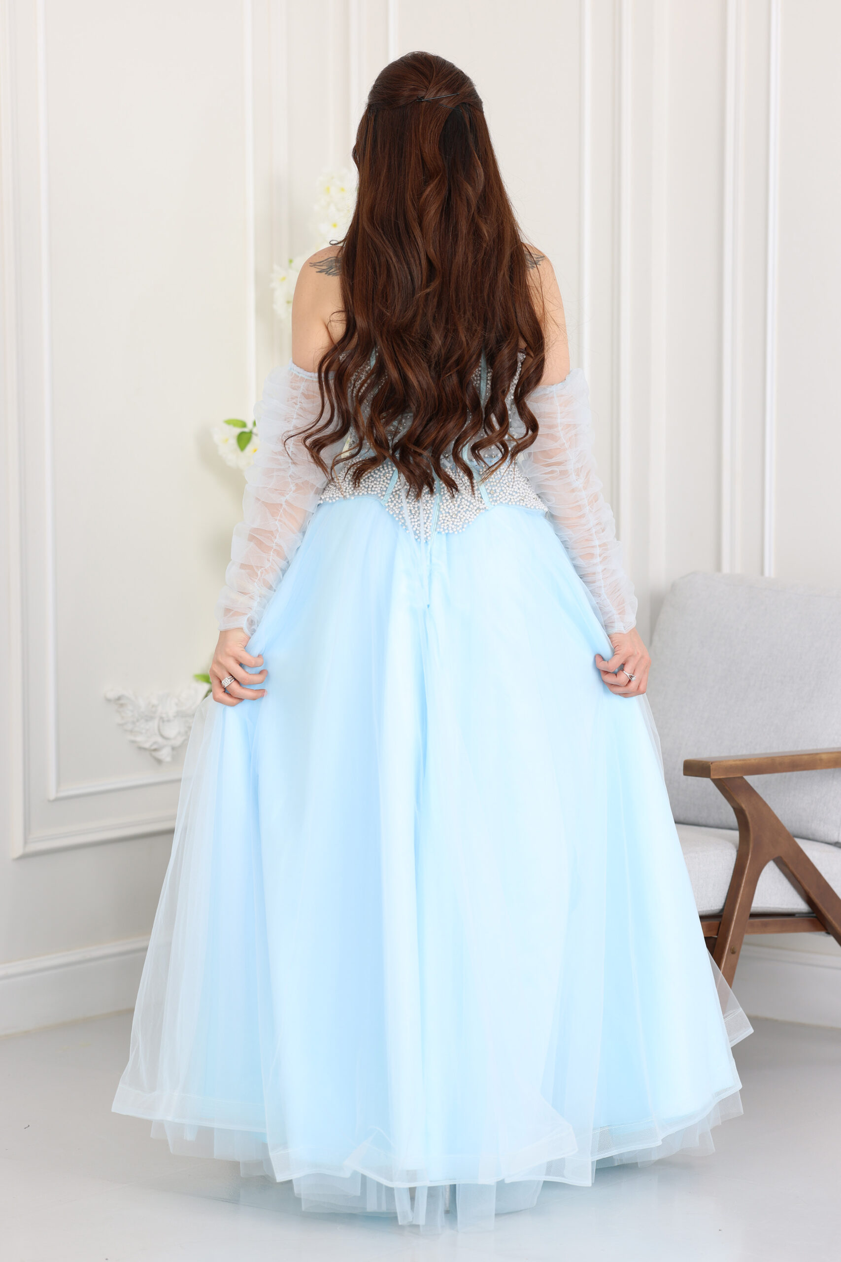 فستان سهرة تل فاخر بتصميم يركز على الفخامة الأثيرية. الفستان طويل بقصة مخصرة تبرز جمال القوام برشاقة، والتوب مُزين بالكامل باللؤلؤ والخرز الناعم بتصميم عمودي، وهذا الشغل الدقيق يزيد من الجاذبية. مرفق معه أكمام منفصلة من التل المنفوخ، تمنحك إطلالة أنثوية أنيقة. التنورة طويلة وبقصة ناعمة من التل الخفيف، تضفي حركة انسيابية. هذا الموديل الراقي يجعلكِ تتألقين في كل حفلة تحضرينها.