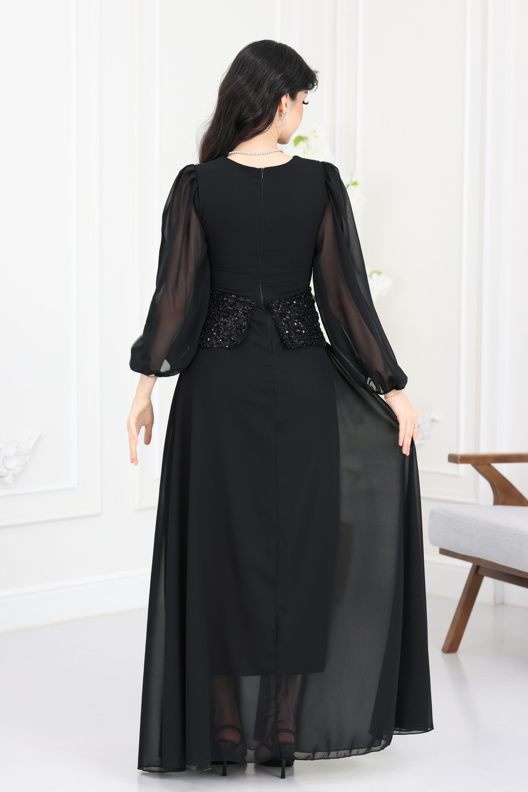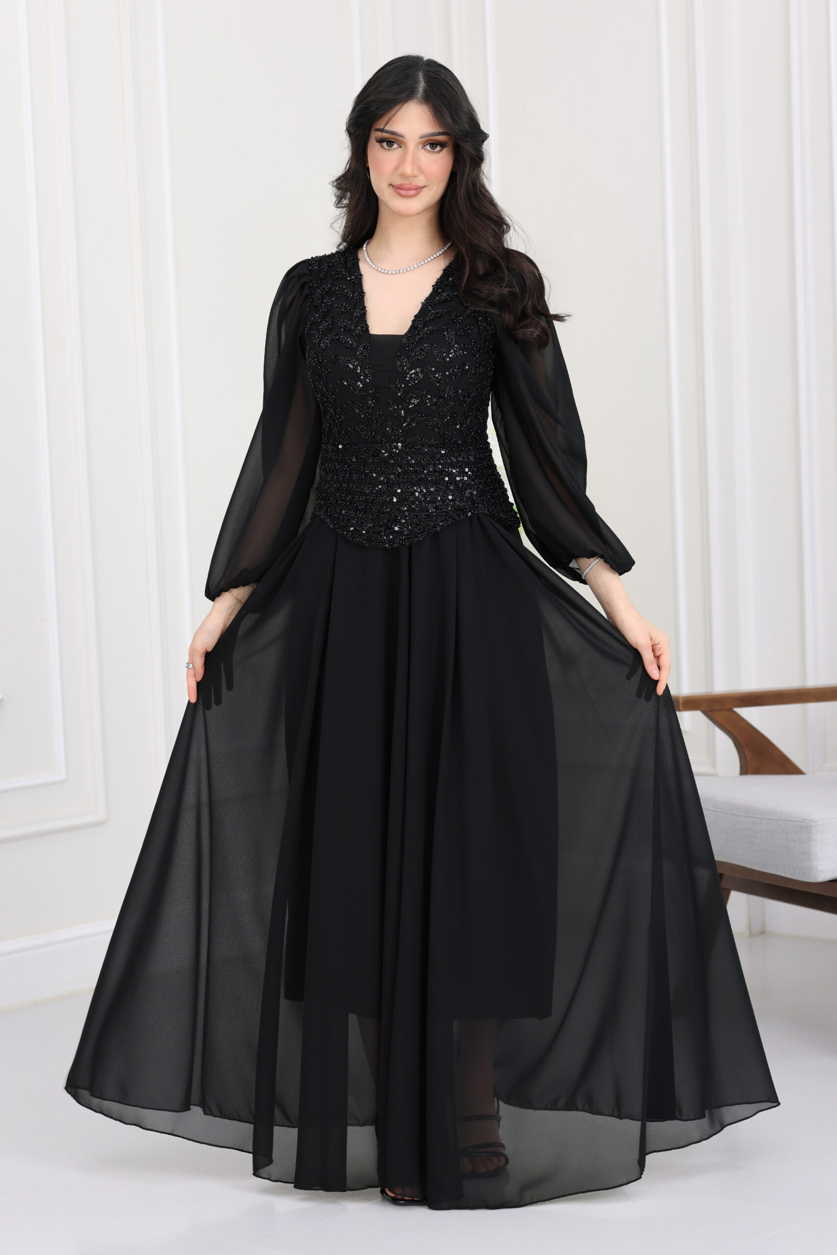فستان سهرة شيفون مطرز ترتر