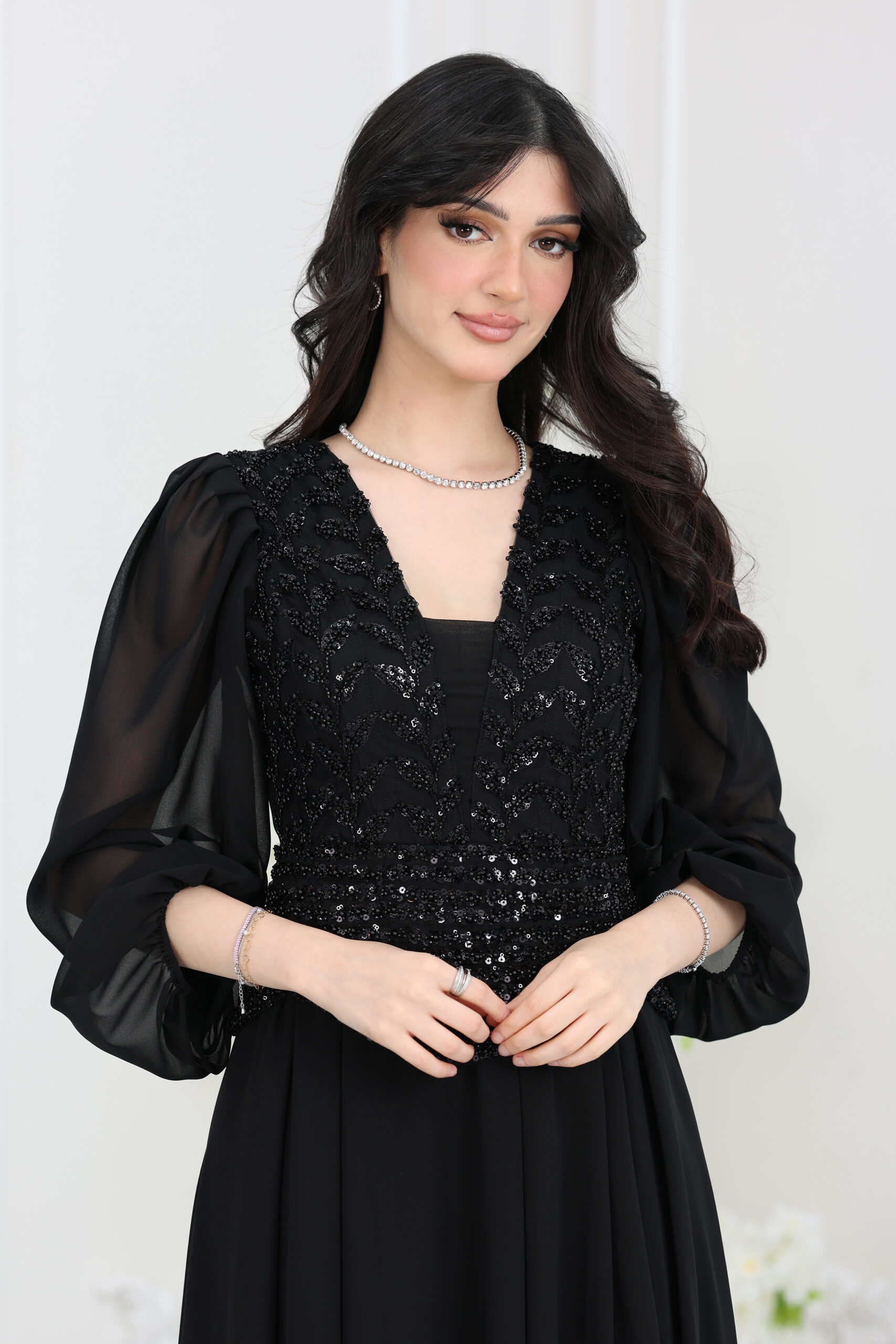 فستان سهرة شيفون مطرز ترتر يا هلا بالرقي والفن! هذا الفستان الفخم يجسد الأناقة الناعمة والفريدة، وهو مثالي لحفلات الخطوبة والمناسبات الرومانسية. يتميز بتصميم علوي مطرز بالكامل بخرز وتطريزات ثلاثية الأبعاد (3D) على شكل زهور ناعمة تنسدل على محيط الخصر، مما يضفي عمقاً بصرياً فريداً. الأكمام واسعة ومفتوحة، تتدلى بأناقة من الكتفين لتضفي حركة شاعرية على الإطلالة. التنورة واسعة ومنسدلة بطبقات من الشيفون تمنحك انسيابية وراحة فائقة. إذا كنتِ تبحثين عن فستان سهرة يجمع بين الفخامة وتفاصيل التطريز الدقيقة، فهذا الموديل هو خيارك الأكيد. اطلبيه الآن من المصمم الحديث!