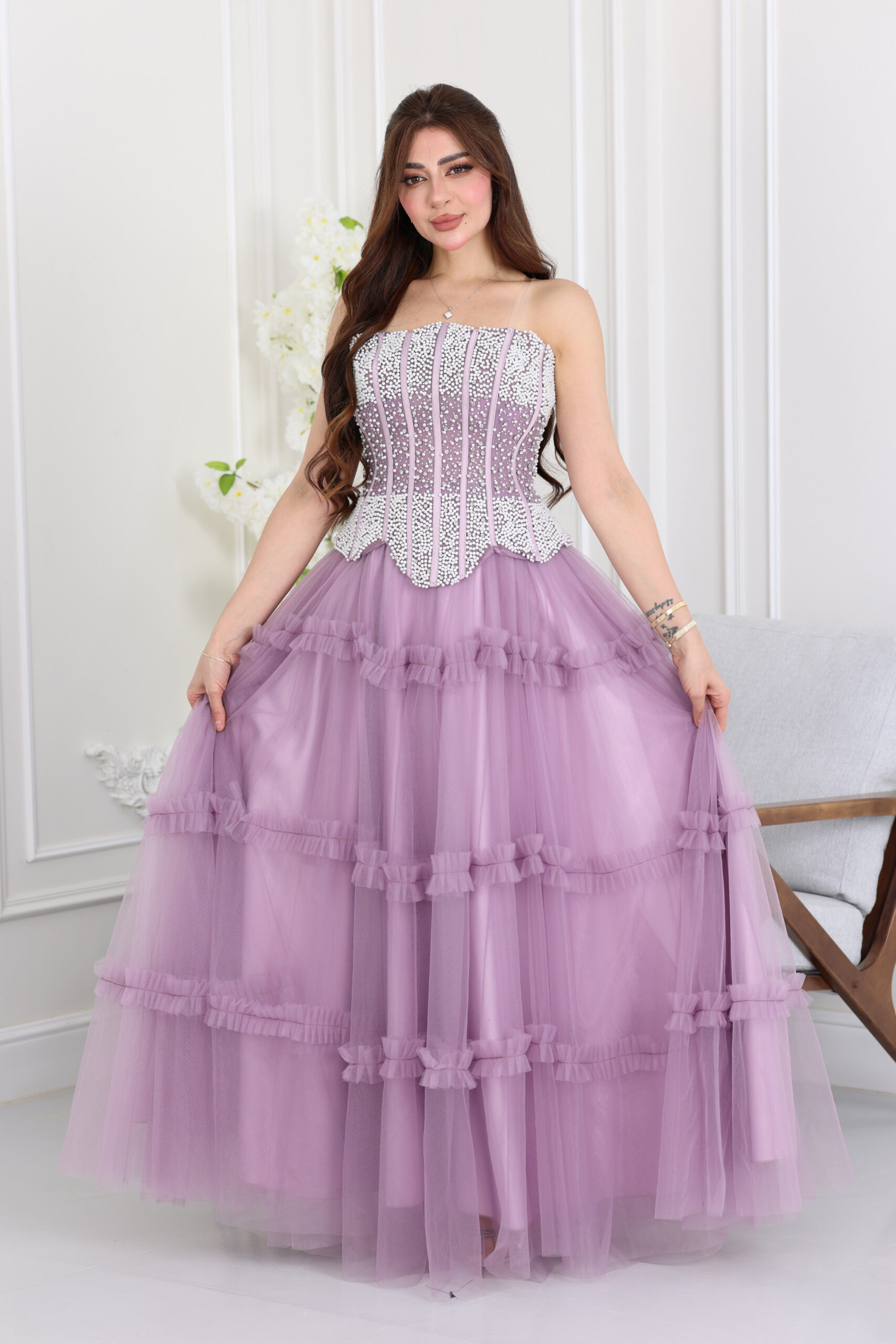 فستان سهرة طبقات تل بتصميم يركز على الفخامة والأناقة الباهرة. يتميز الجزء العلوي (التوب) بزخرفة كاملة بالشك البراق والخرز الفاخر، وهذا يضمن لكِ جاذبية وبريقاً يلفت الأنظار تحت الأضواء. الفستان طويل وبقصة أنيقة بدون أكمام، تمنحك إطلالة أنثوية راقية.الفخامة تتركز في التنورة الطويلة المصممة من طبقات تل مكشكشة ضخمة ومنفوشة، وهذا يعطي الفستان حجماً ملكياً وحركة ساحرة أثناء المشي والرقص. القصة مخصرة في الأعلى وتنسدل بفخامة، مما يجعله من أفخم فساتين السهرة