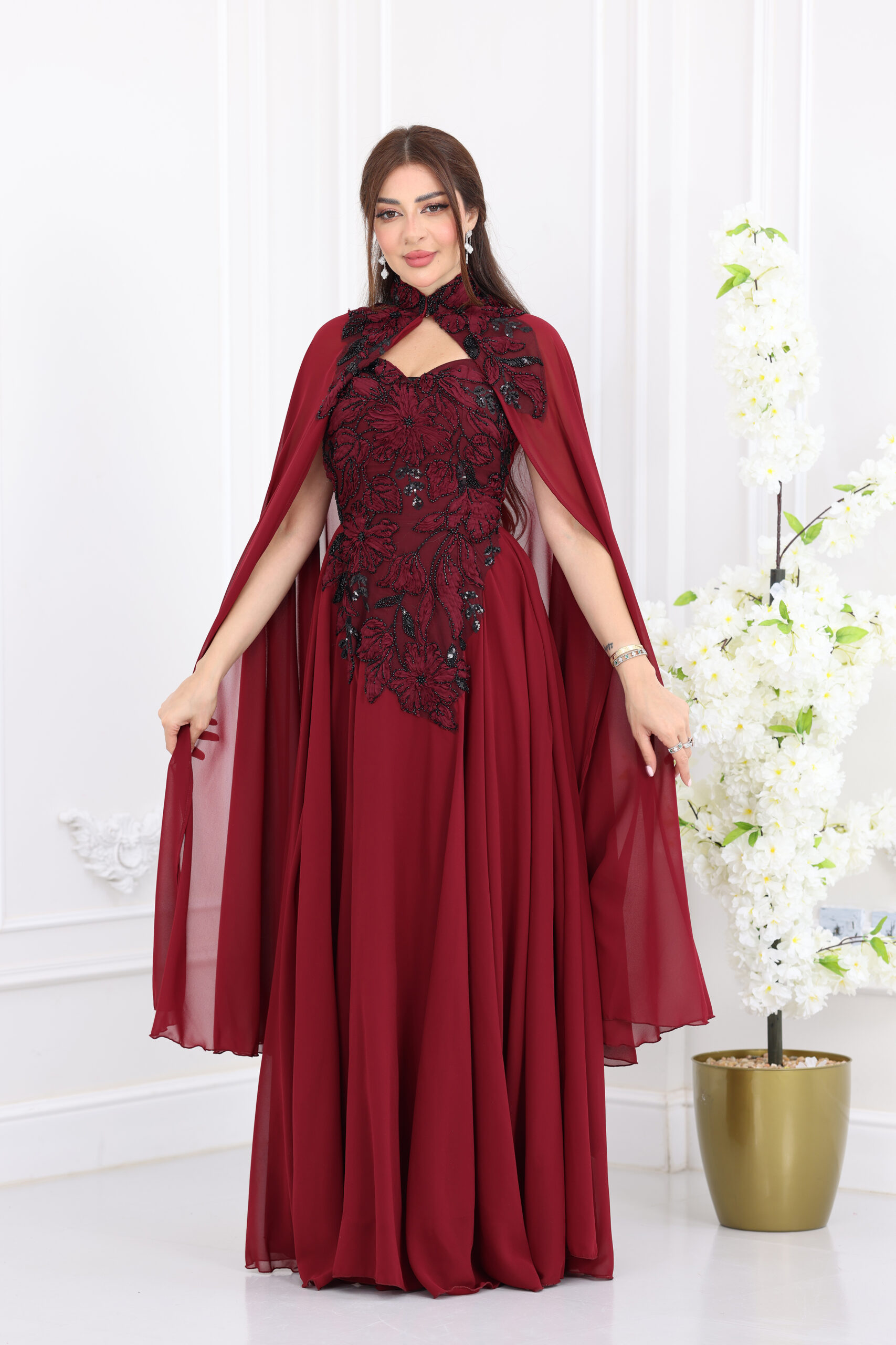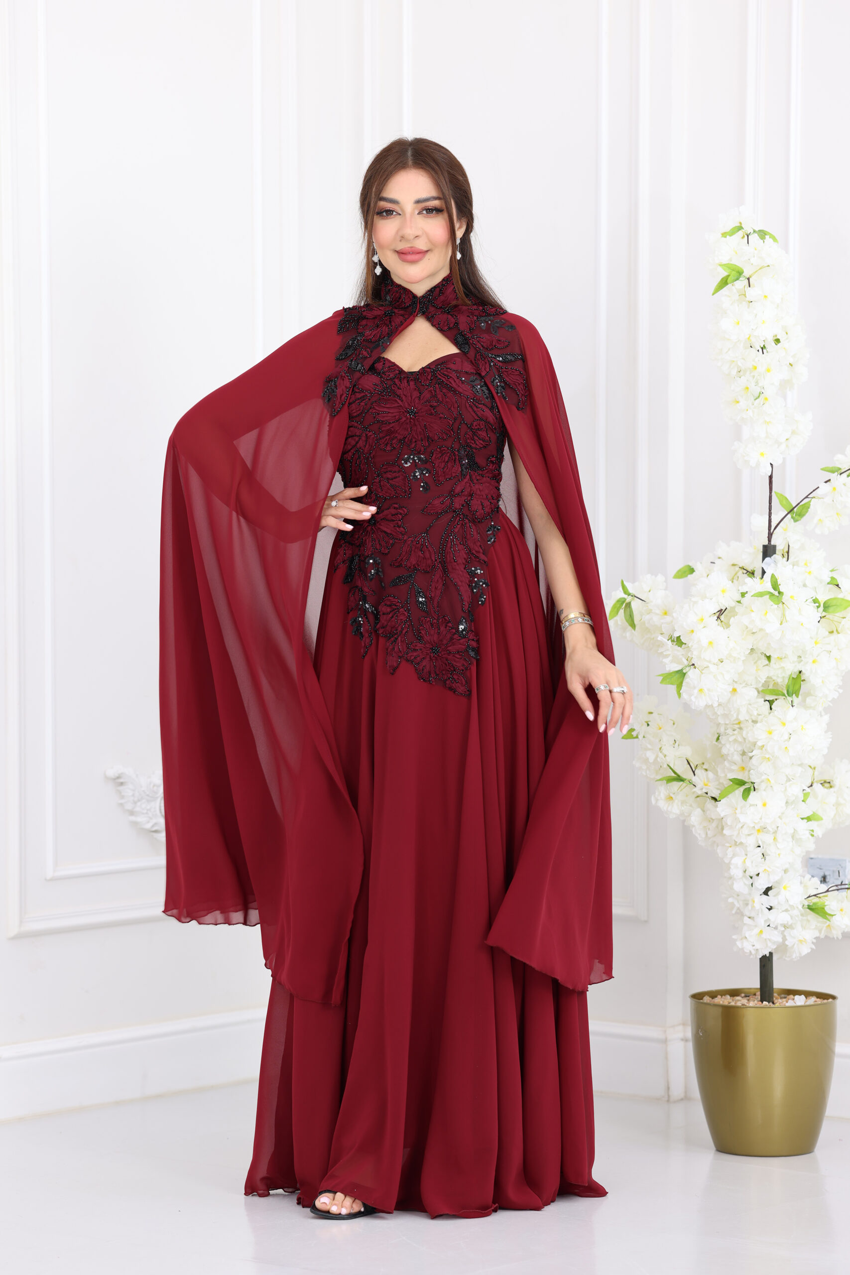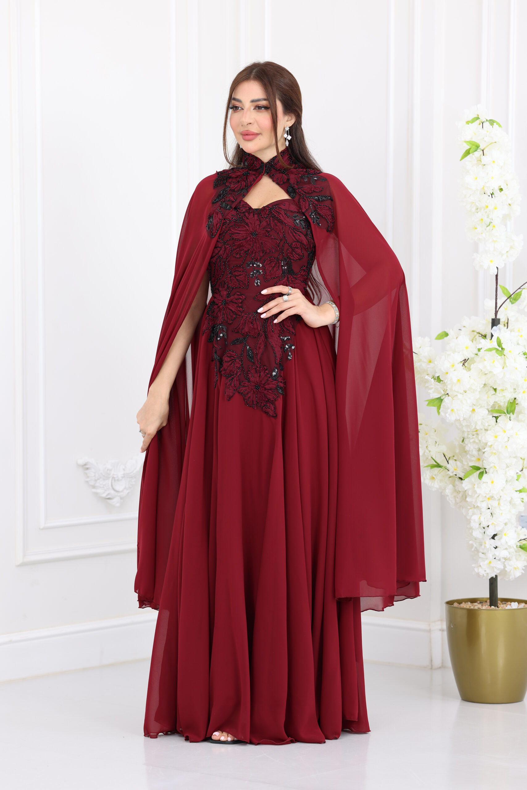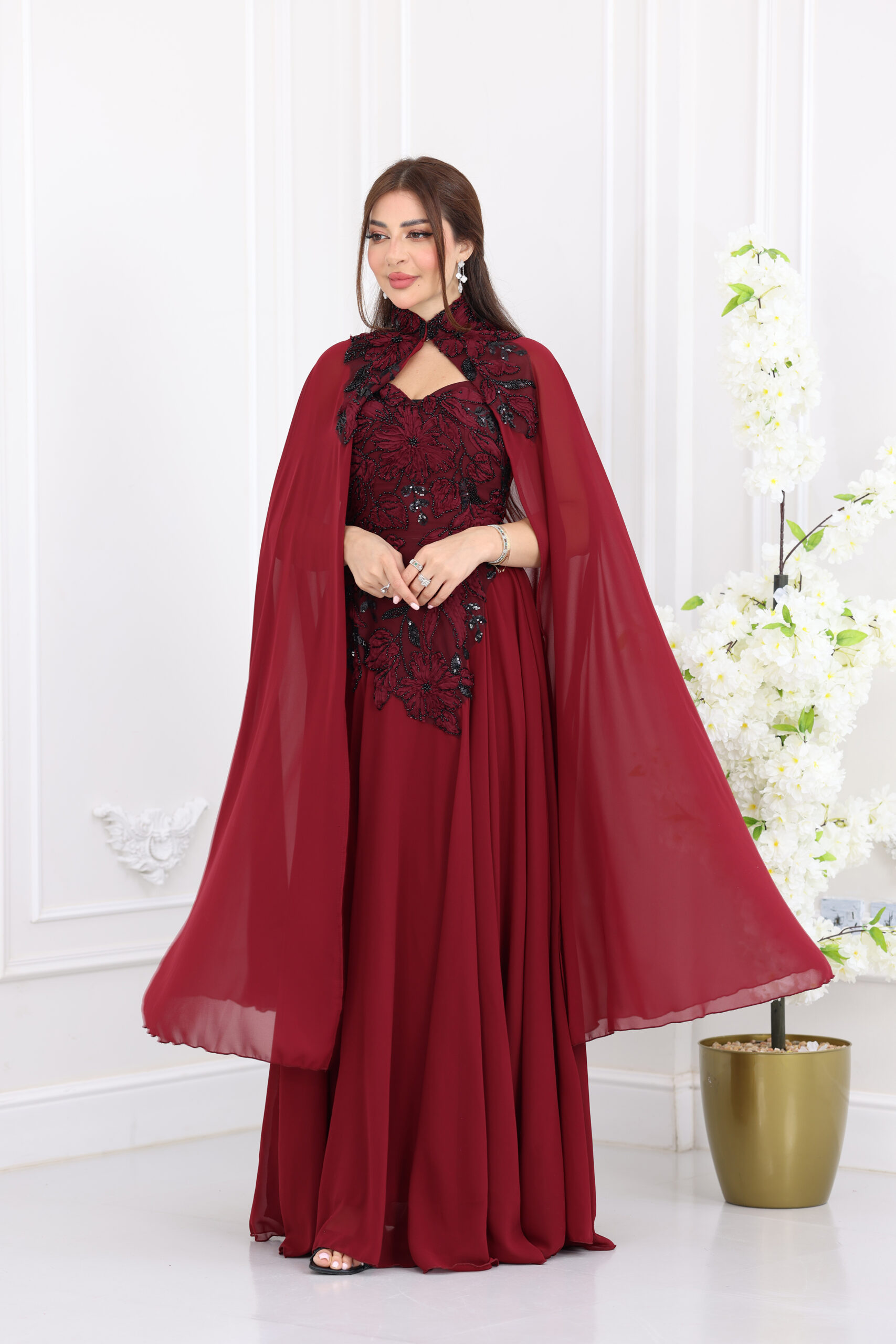 يتميز الفستان بياقة عالية بنمط “الهاي نك” المزينة بالشك، مع فتحة صدر أنيقة تعطي طابعاً عصرياً وفخماً. الإبداع الحقيقي يظهر في “الكيب” (Cape) المتصل الذي ينسدل من الرقبة ليغطي الأكتاف والظهر بطول كامل، مما يمنحكِ حضوراً ملكياً مهيباً. الجزء العلوي مشغول بالكامل بتطريز يدوي كثيف ومتقن بنقوش ورود وأوراق شجر فنية مشغولة بالخرز والستراس اللامع، وينساب الفستان بقصة واسعة تضمن لكِ إطلالة درامية تخطف الأنفاس في كل سهرة.